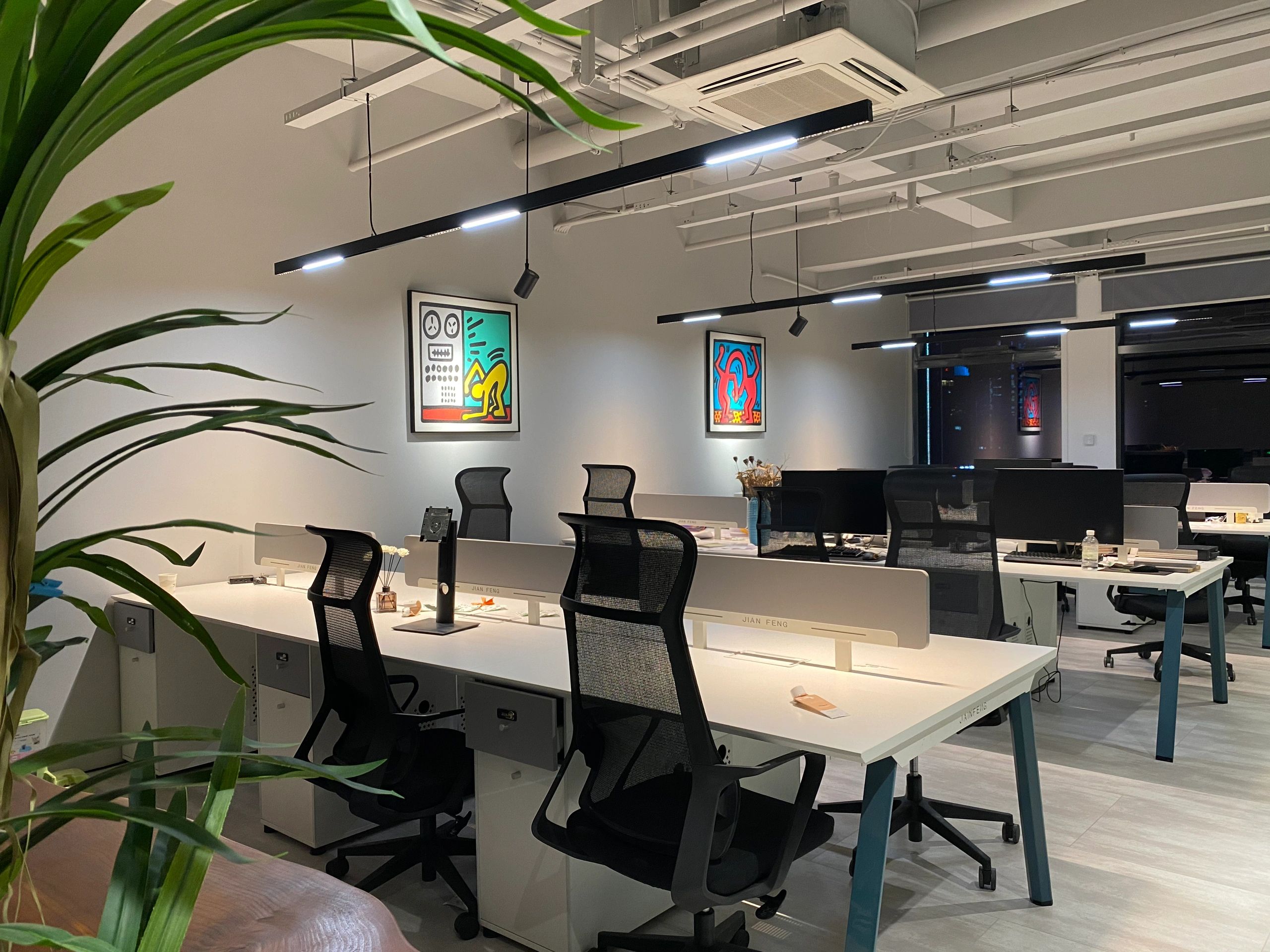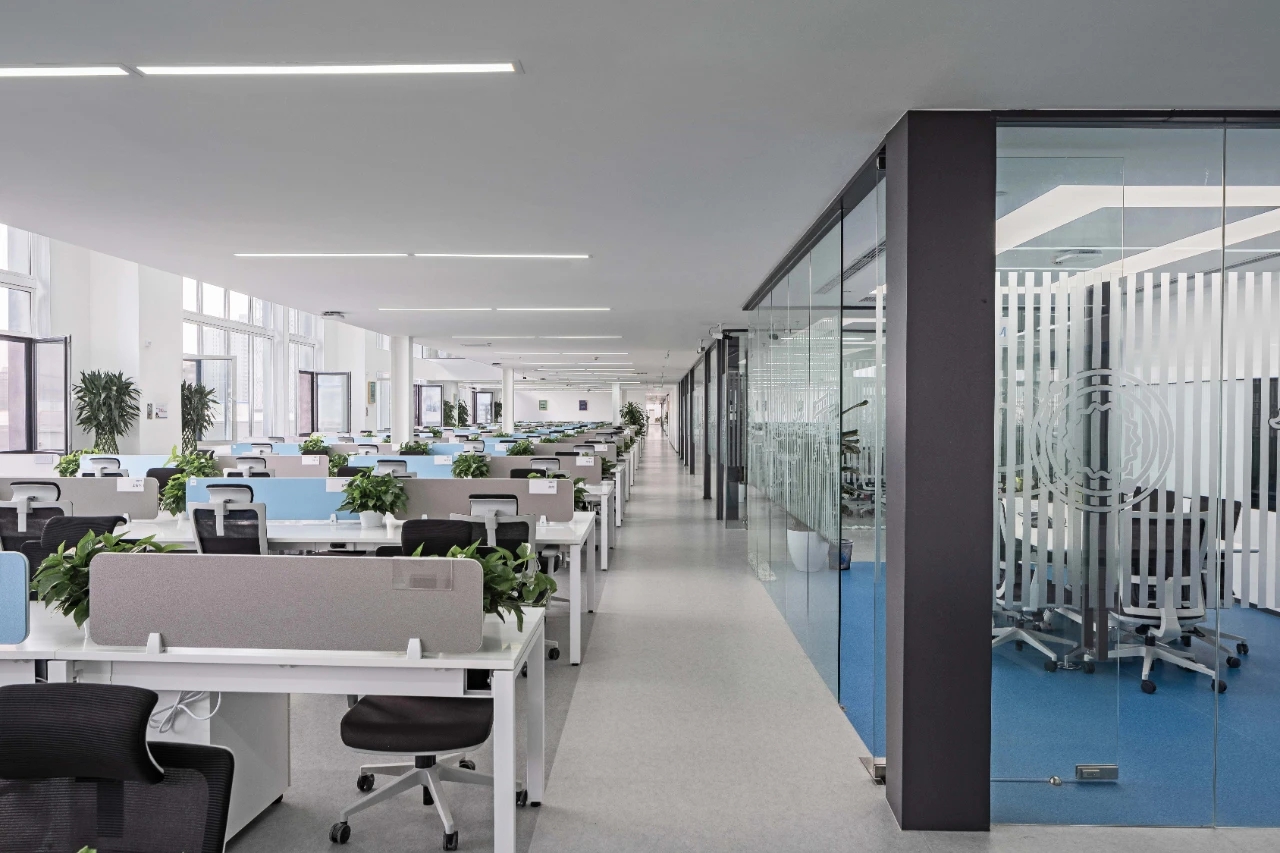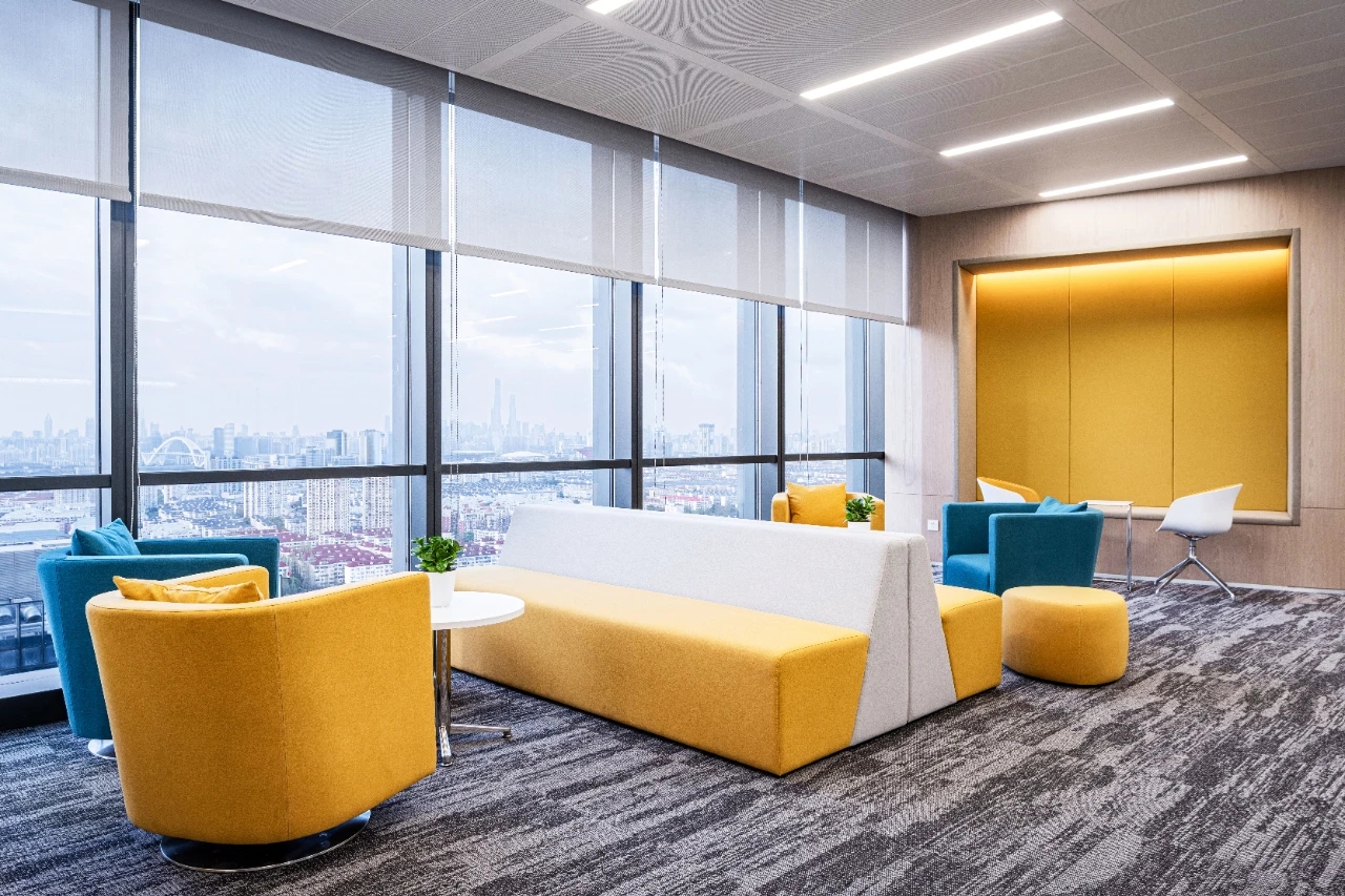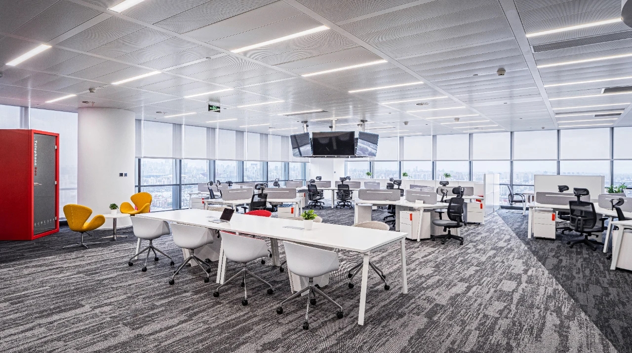 在家具和软装的搭配上,以黑白灰作为基础色调,局部搭配企业颜色,鲜亮的色彩使整体办公空间更加具有年轻化和现代感,工作时也会更有活力和激情