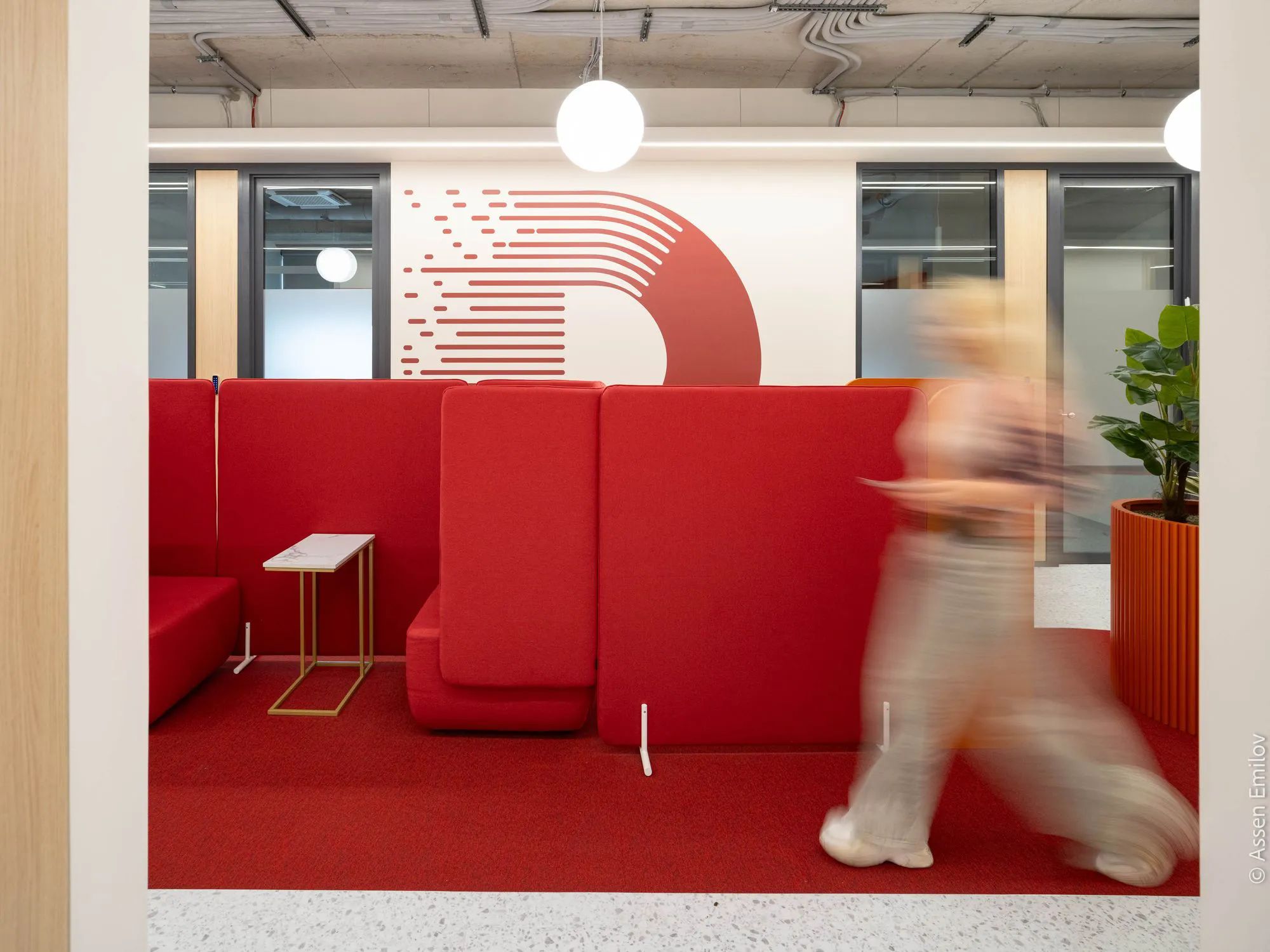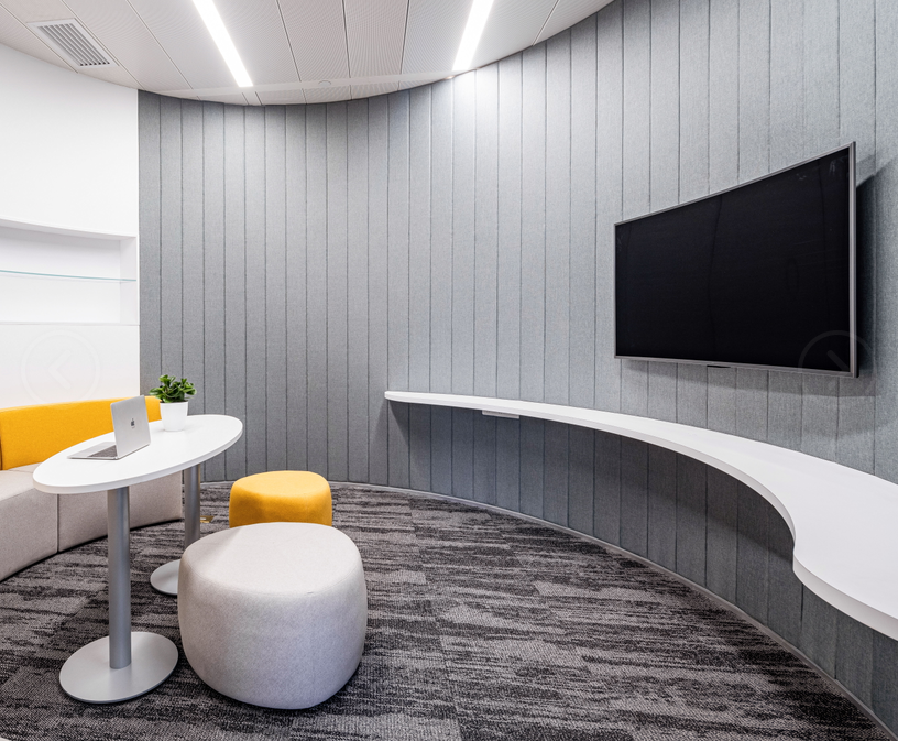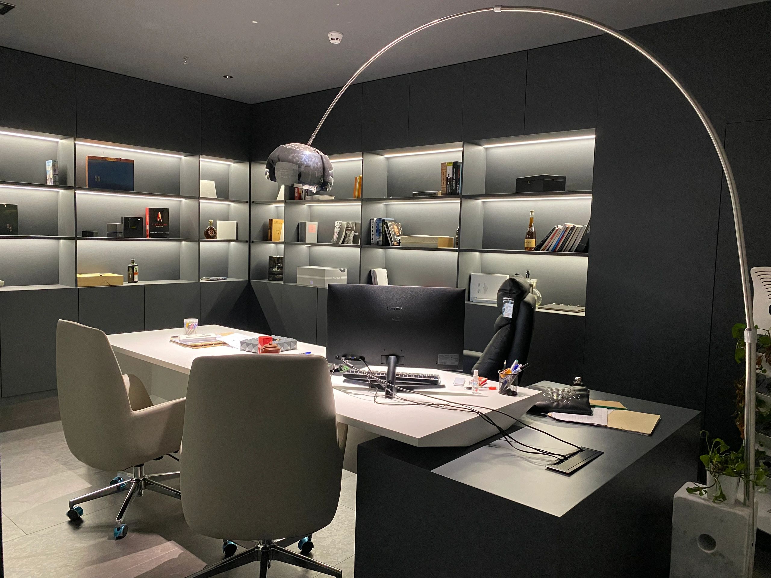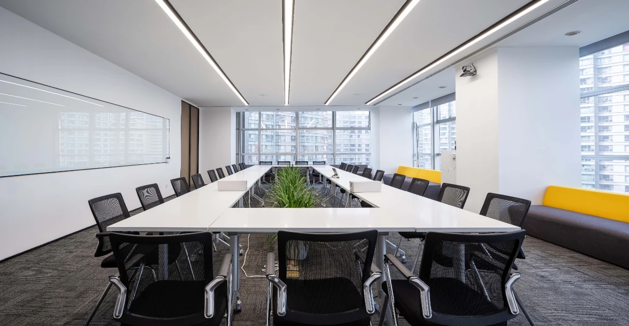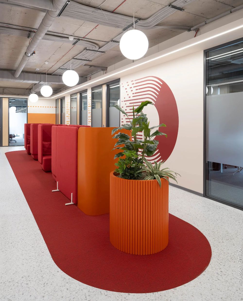 在家具和软装的搭配上,以黑白灰作为基础色调,局部搭配企业颜色,鲜亮的色彩使整体办公空间更加具有年轻化和现代感,工作时也会更有活力和激情