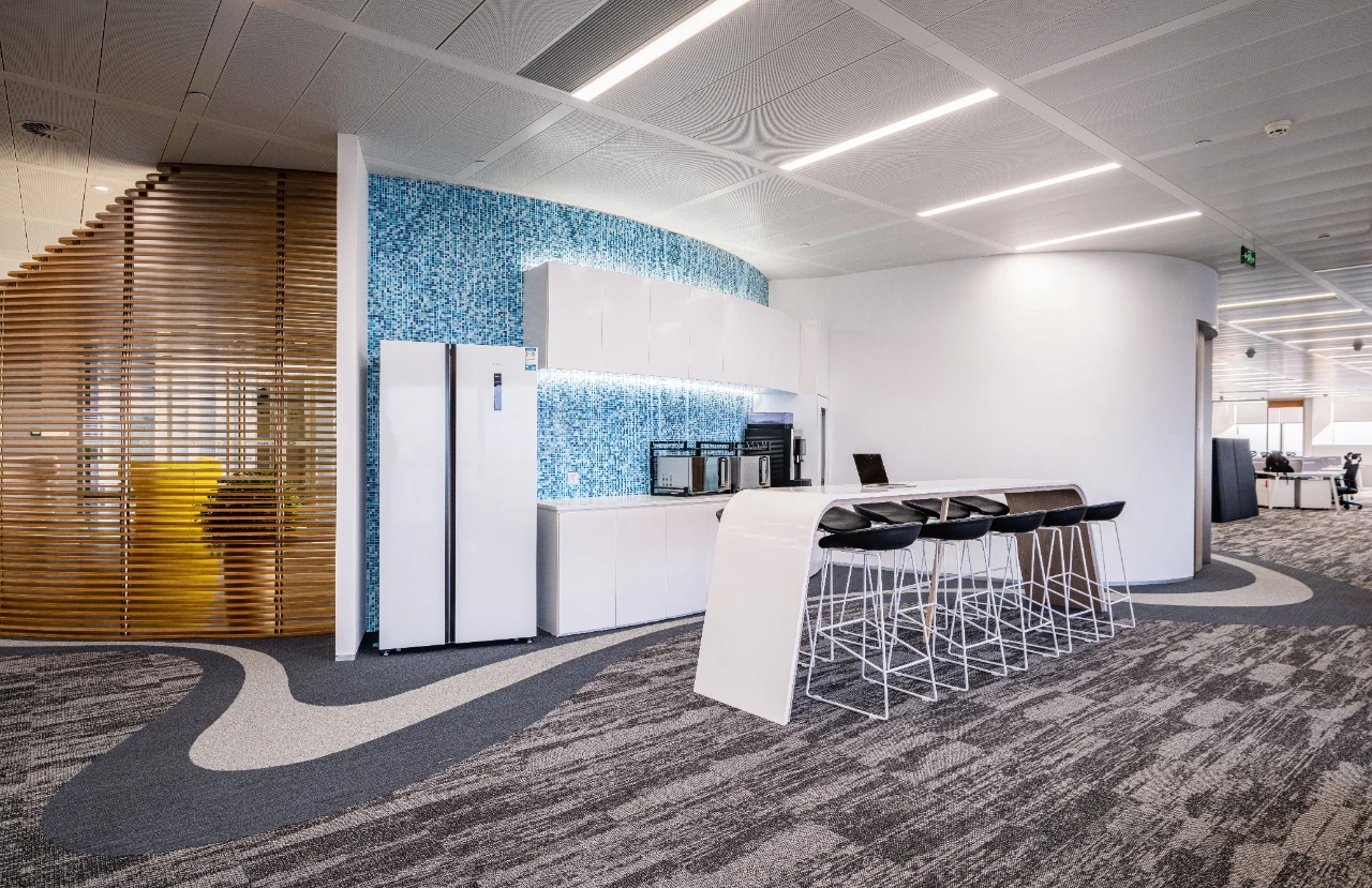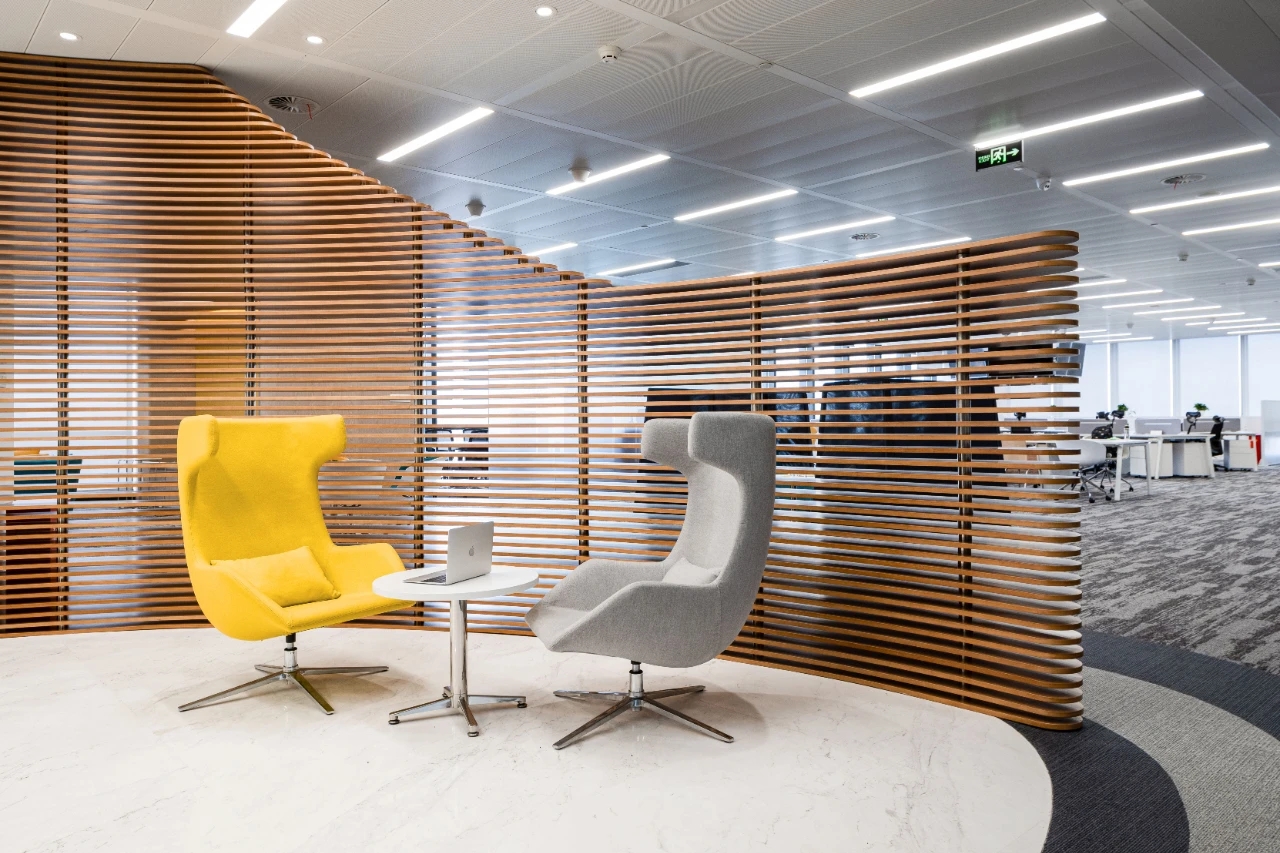 整体的曲线墙体结合地面曲线铺装,让整个空间充满动感。轻柔的木隔断充满活力,为多彩的空间增添一抹温馨怡人的自然气息。本案另外一大特征是各种休闲区域,以及众多大小不同、功能各异的会议室和培训室。曲线设计手法从前厅自然流入,使各个分区具有连续性和节奏感。