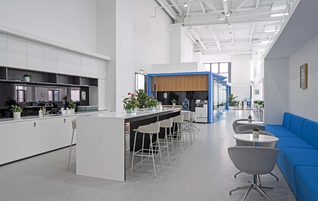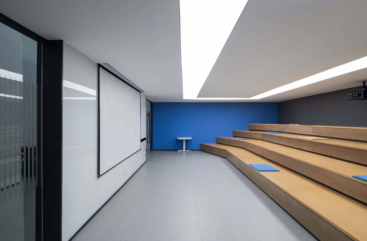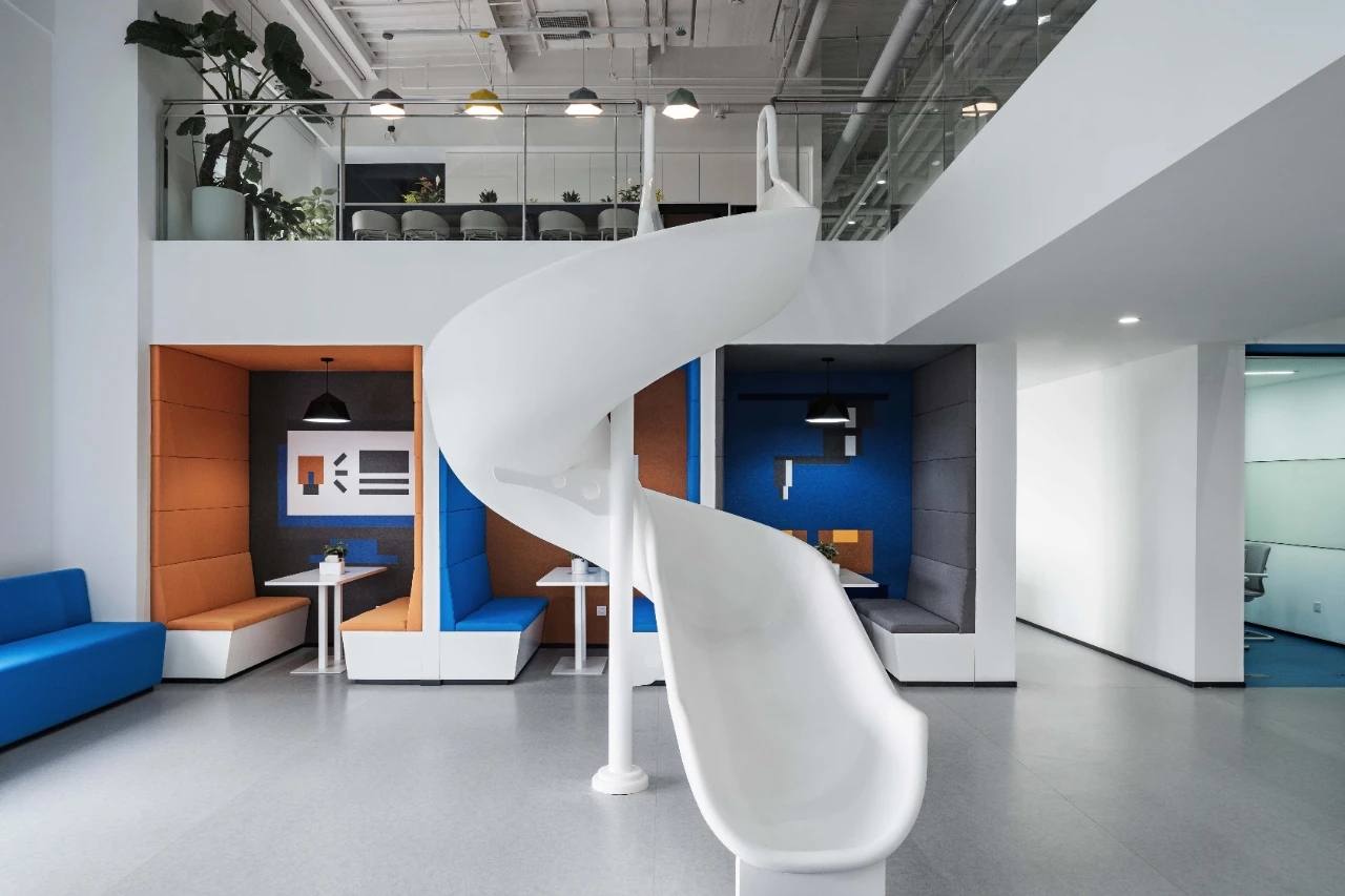 前厅开放式台阶和前台结合,极具整体性和空间延续感。多级台阶不但解决了主入口交通流线问题,视觉上也具有代入感和延伸感,使人一进门就充满走入内部空间探索的欲望。休闲区域采用了中庭设计,大大减少了休息时空间的压迫感,并用滑梯连接上下层,在节约员工时间的同时也能缓解工作带来的紧张压力。家具和软装的搭配,以企业颜色为主线,将蓝色的企业元素贯穿整个空间。