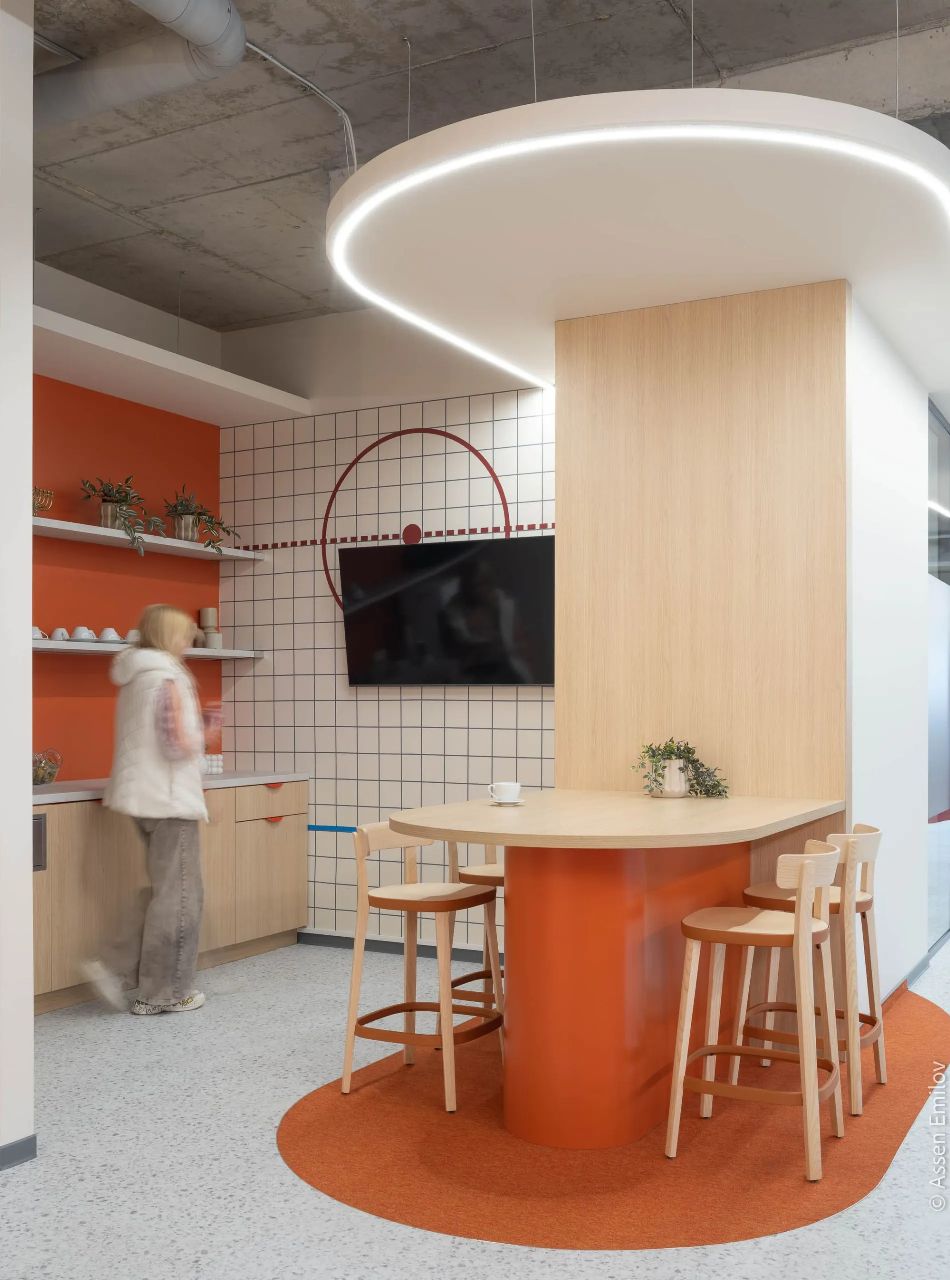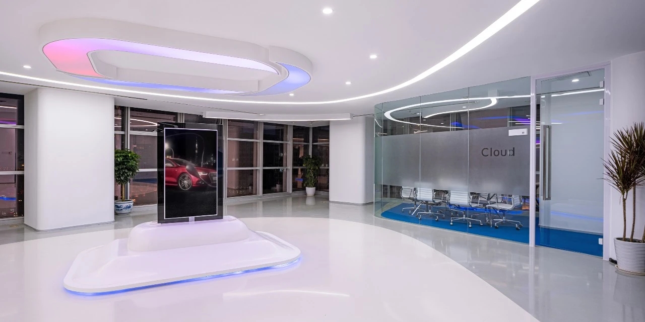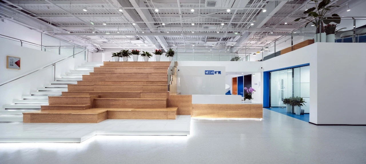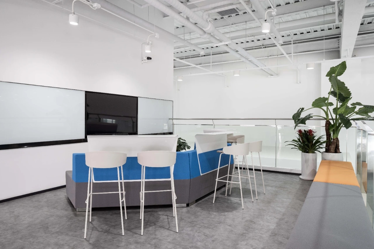 前厅开放式台阶和前台结合,极具整体性和空间延续感。多级台阶不但解决了主入口交通流线问题,视觉上也具有代入感和延伸感,使人一进门就充满走入内部空间探索的欲望。休闲区域采用了中庭设计,大大减少了休息时空间的压迫感,并用滑梯连接上下层,在节约员工时间的同时也能缓解工作带来的紧张压力。家具和软装的搭配,以企业颜色为主线,将蓝色的企业元素贯穿整个空间。