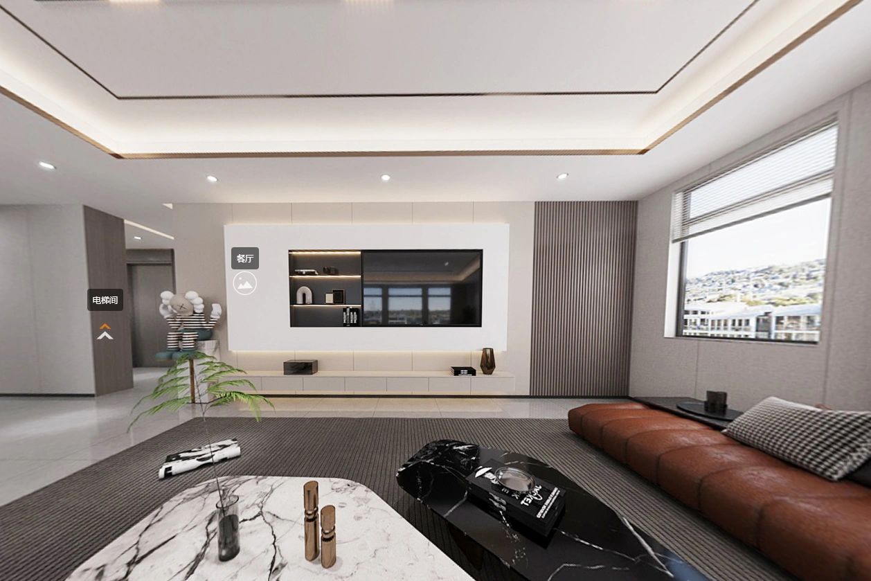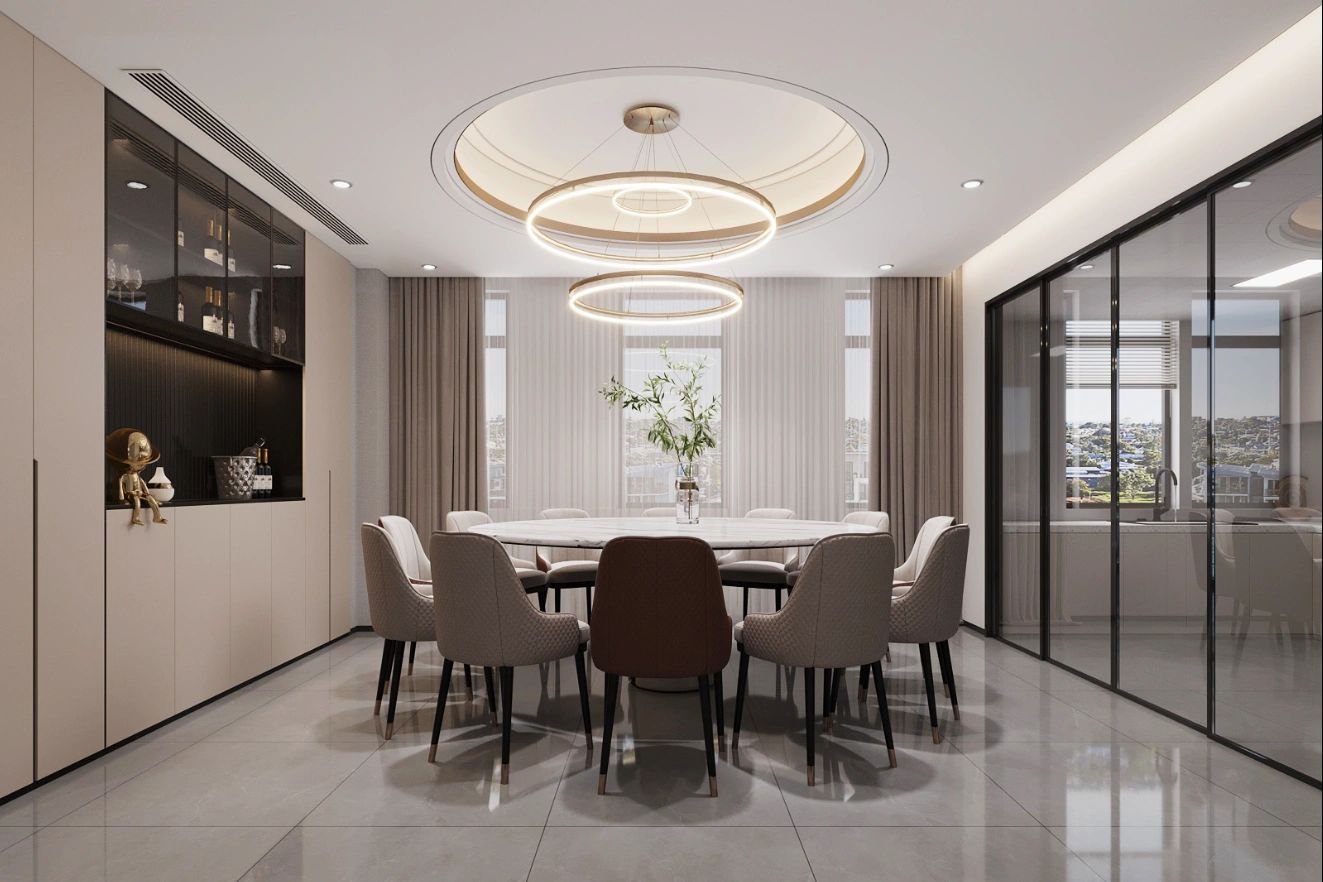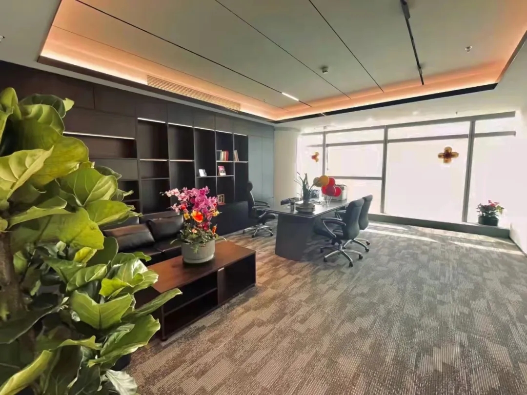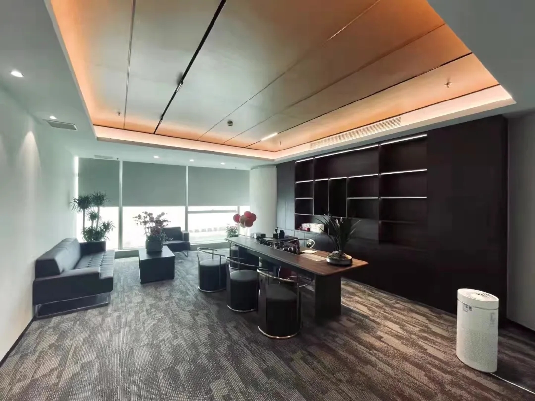 总经理办公室设计从彰显沉稳形象的角度出发,设计一个相对的高雅宽敞办公环境,采用无主灯的灯光线条进行设计,效果柔和自然。装饰柜面板搭配茶镜加灯带,拉高整个办公空间轻奢大气的高级感。