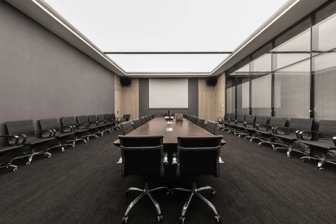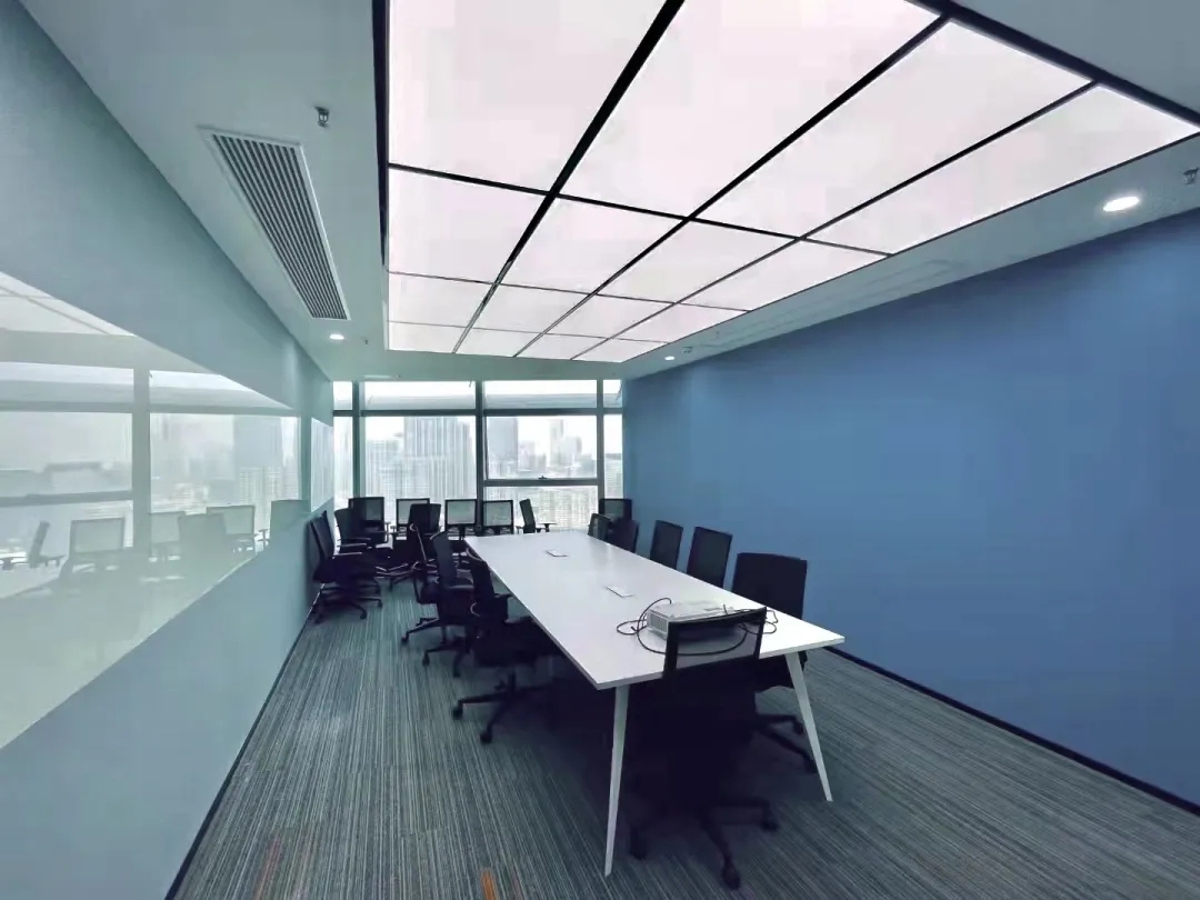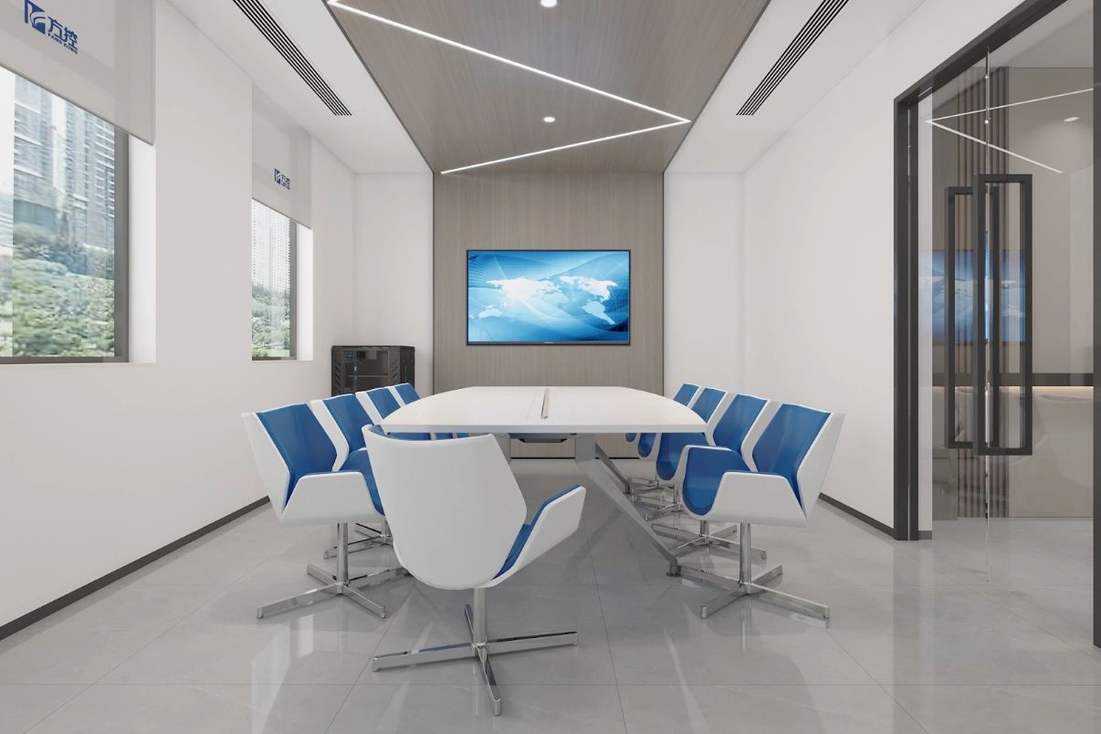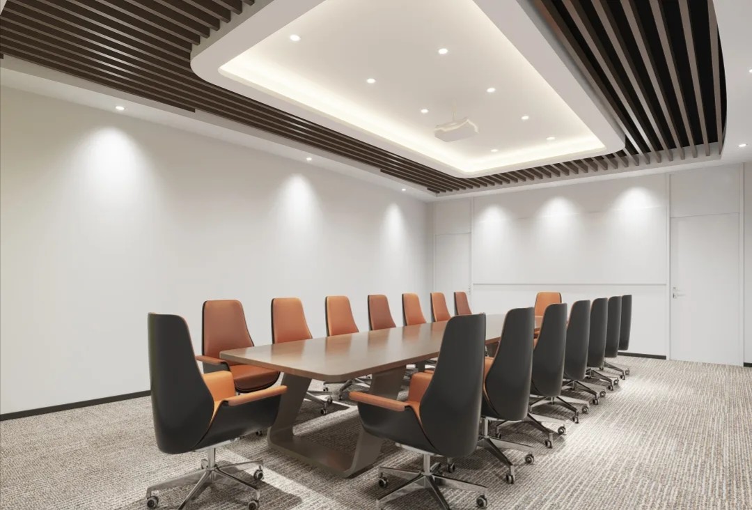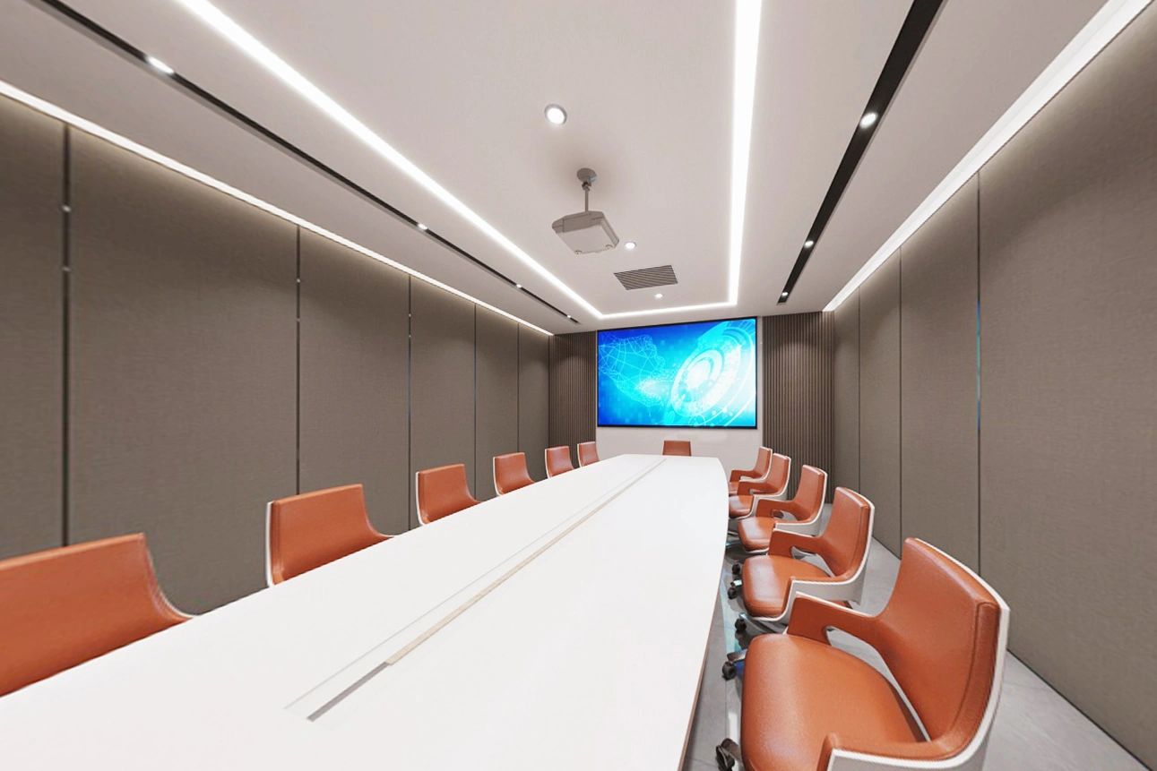 小型会议室的天花板设计规整的方形白色灯膜,科技蓝涂料配搭世界地图挂饰营造的科技空间感,墙上设计挂上白板玻璃,能更好的在开会中进行流畅的研讨。多功能会议室天花板规划设计方形吊顶提供氛围照明,整齐木饰铝方通配搭简洁干净的白色墙面,营造沉稳大气的综合性研讨空间,并设置多个氛围照明点亮整个会议空间。