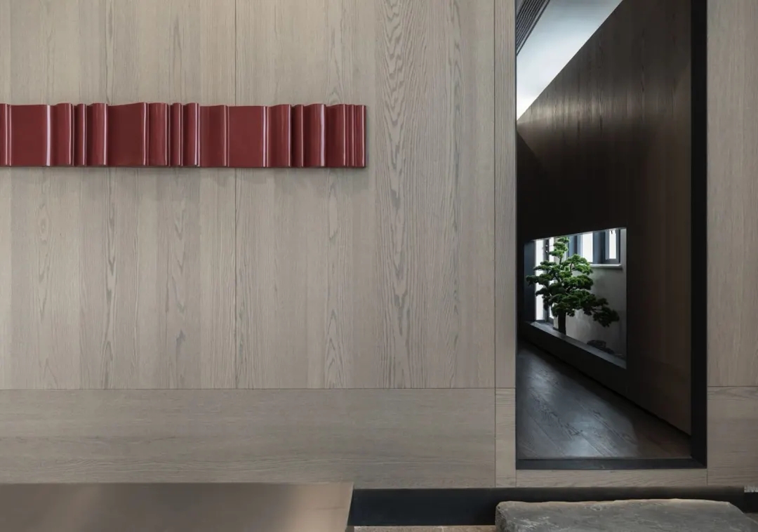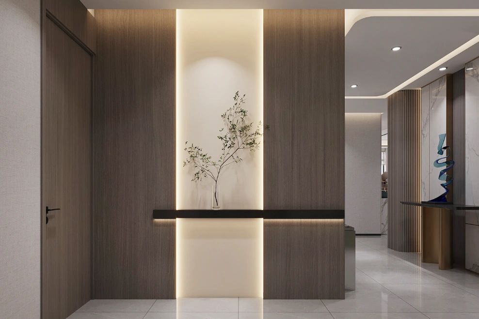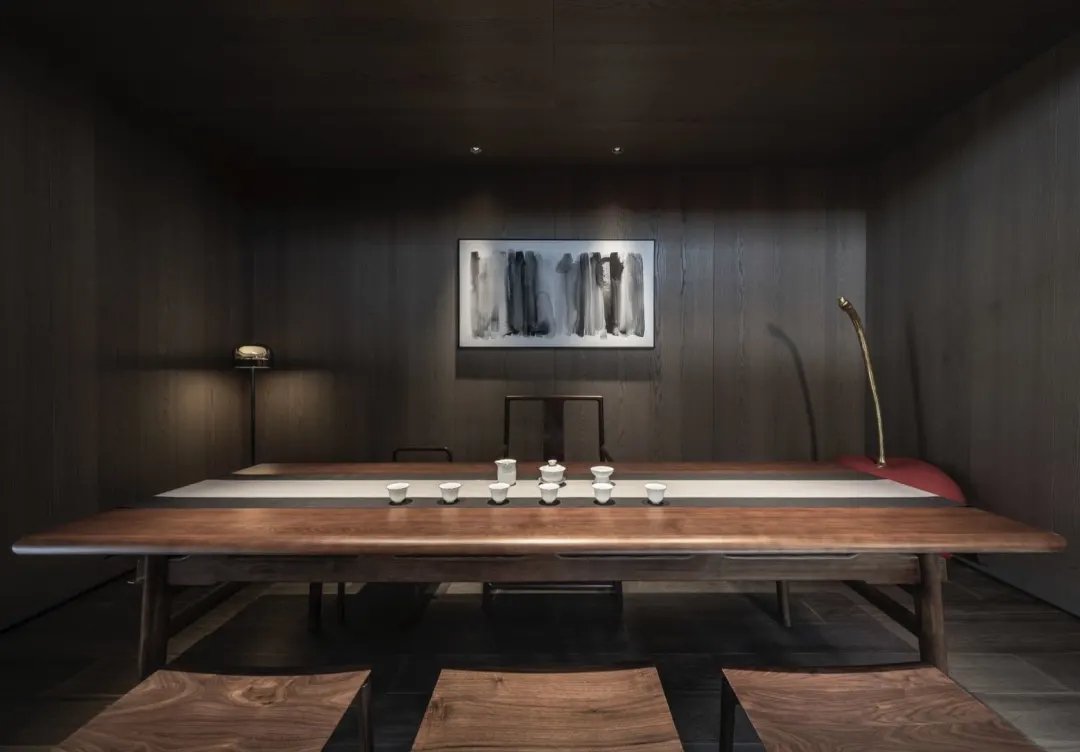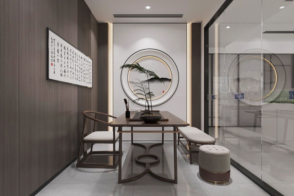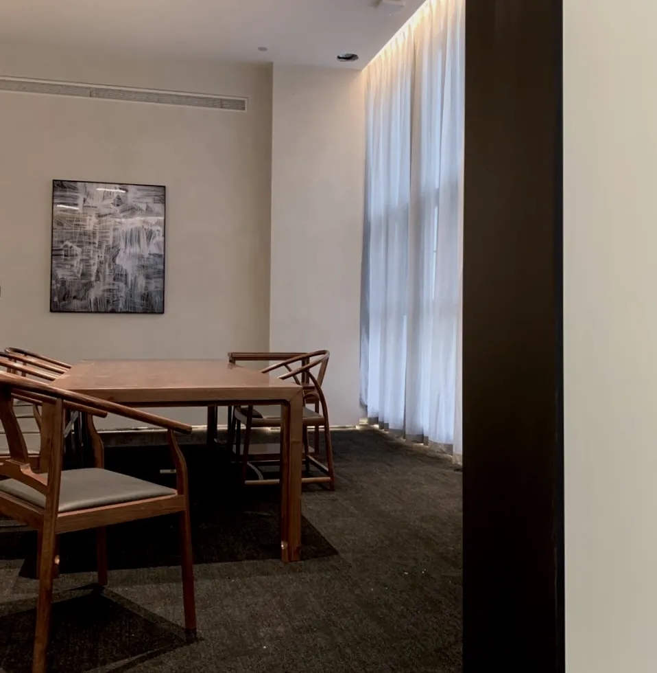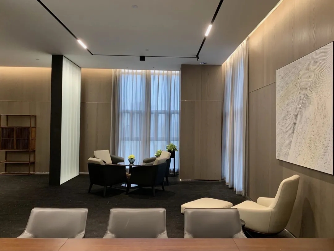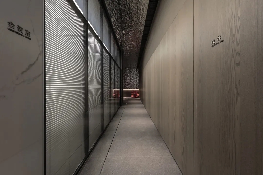 接待室利用大面积木饰面天花板嵌入条形灯,在装饰柜面板上,搭配茶镜加灯带,使空间营造出稳重大气感,打造可用于接待、办公等多用途的空间。走道设计时空间的流动力加強,增加空间的整体律动性,使其心理视觉角度更加宽敞、空间感圆润、平和。做到天花底的木板门使颜色独立、在视觉上且不突兀。