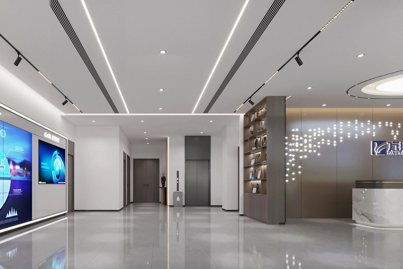 公区前厅的椭圆形天花吊顶让展厅空间捕捉到装饰艺术所表达的意境,搭配面灯呈现椭圆形的聚光效果。让整个展厅空间衔接巧妙,灯膜效果集均衡、和谐、完整于一体,视觉上给人以圆满无缺、包容无限的美好感受。善用弧线,嵌入简约风格的科技感线灯装饰,整个展厅空间呈现大气简洁的氛围。