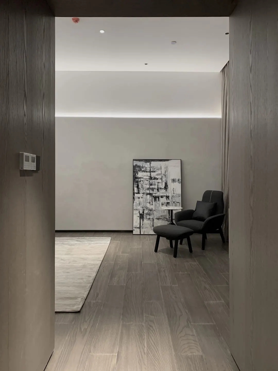 素色木质的墙面搭配白纱利落的线性灯带简约的软装款式干净的色彩搭配越是简洁越是注重质感细节