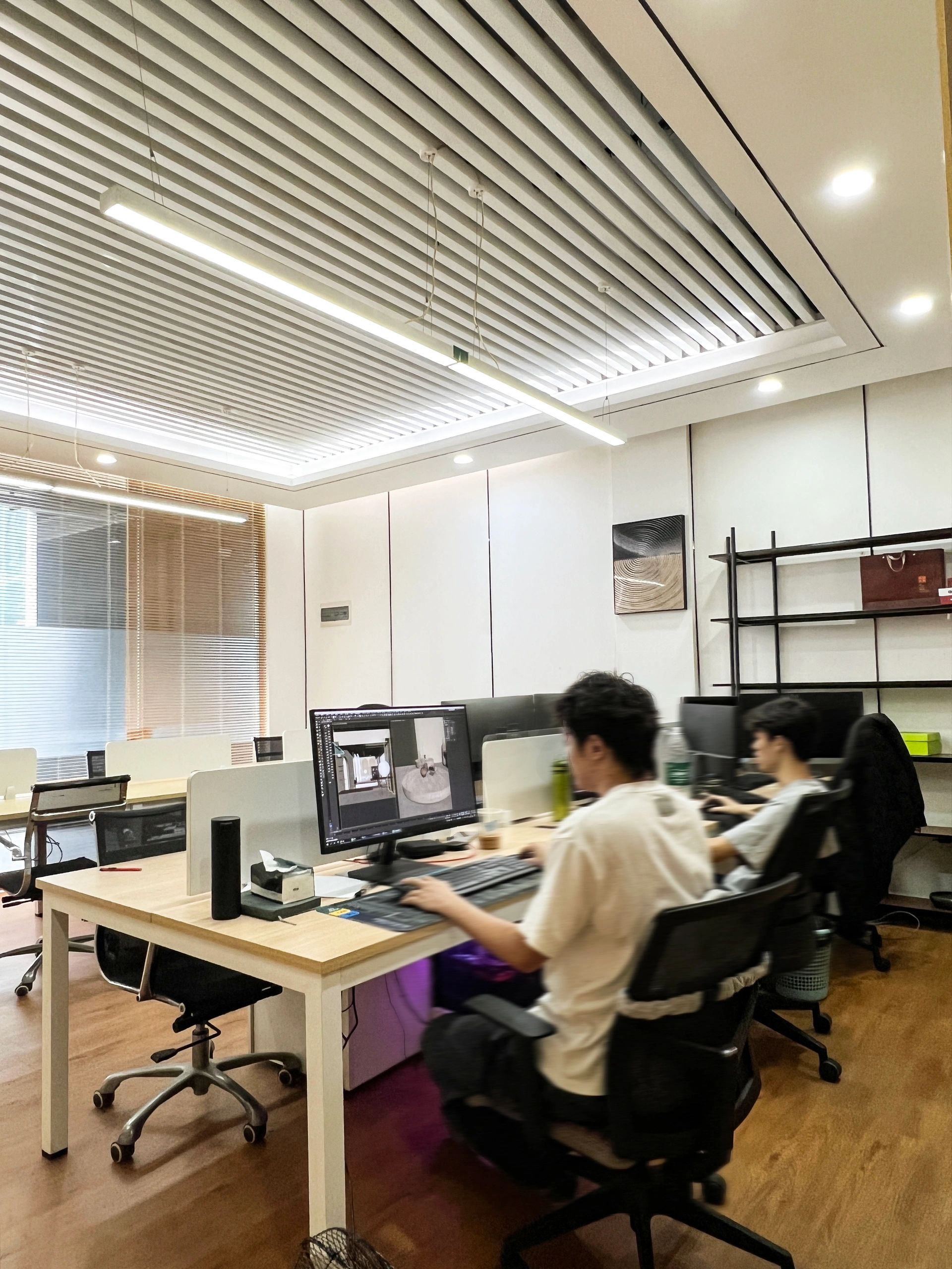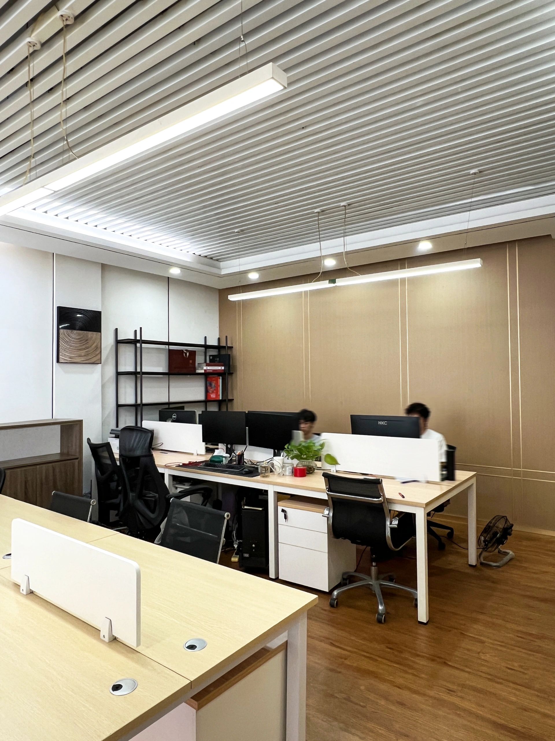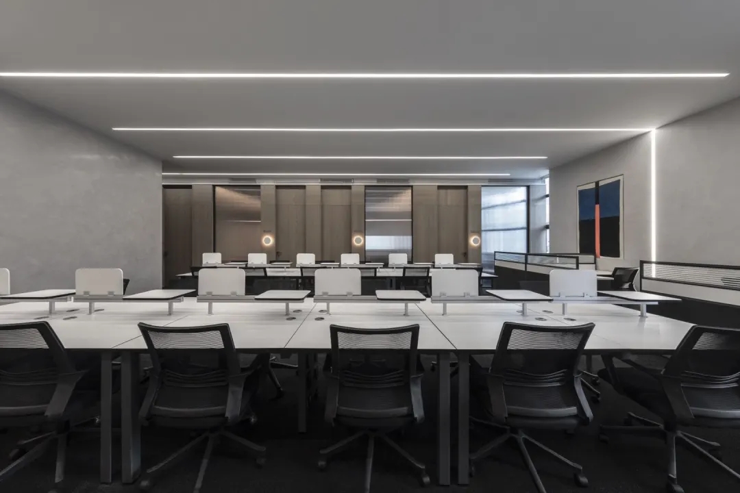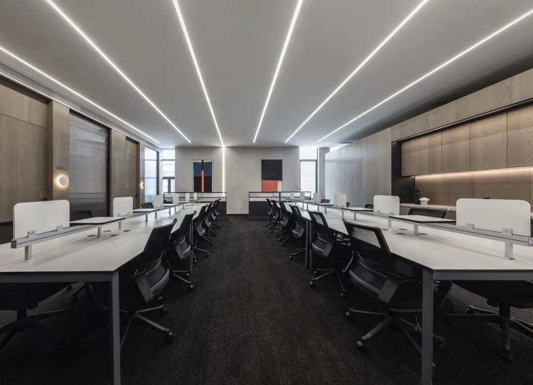 作为公共办公空间来说简洁的线条更能体现干练遍布天花的灯带保证了工作室的充足光线