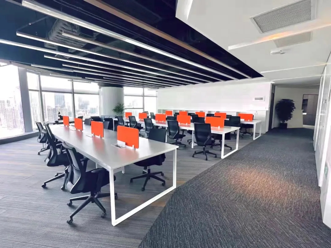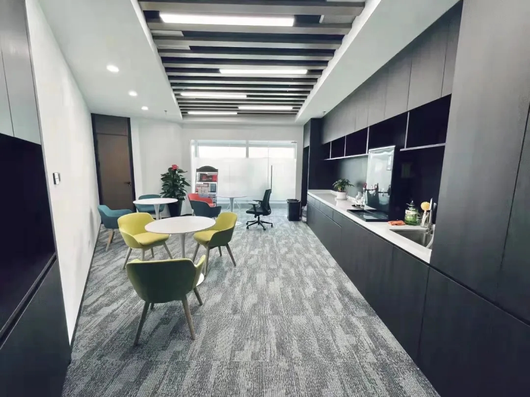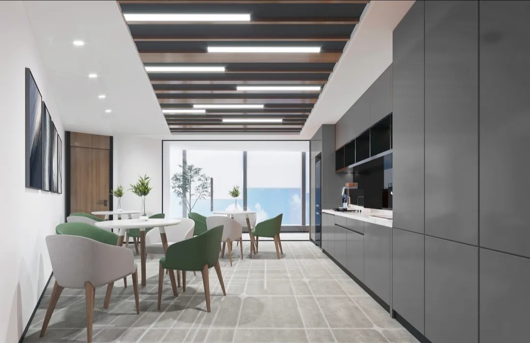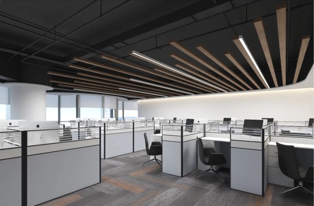 作为公共办公空间来说简洁的线条更能体现干练遍布天花的灯带保证了工作室的充足光线