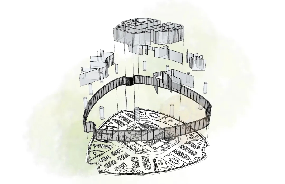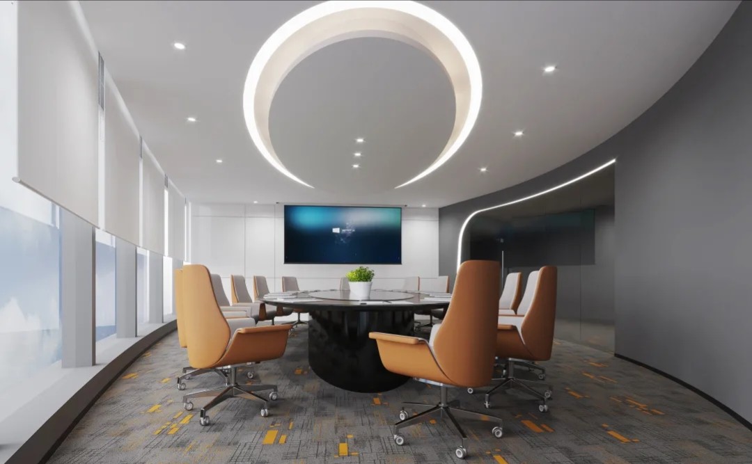 会议室作为讨论和汇报工作的区域,色彩搭配采用适合会议环境的浅色系灰色涂料及白色涂料墙面漆,吊顶选择白色,相对呼应展厅的椭圆吊顶,会议室空间也使用椭圆顶内嵌灯条造型,能够与灯光配合更好的提升会议室的亮度。