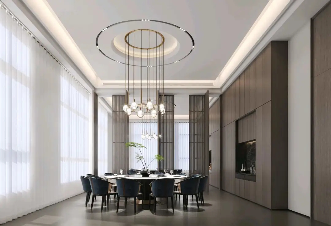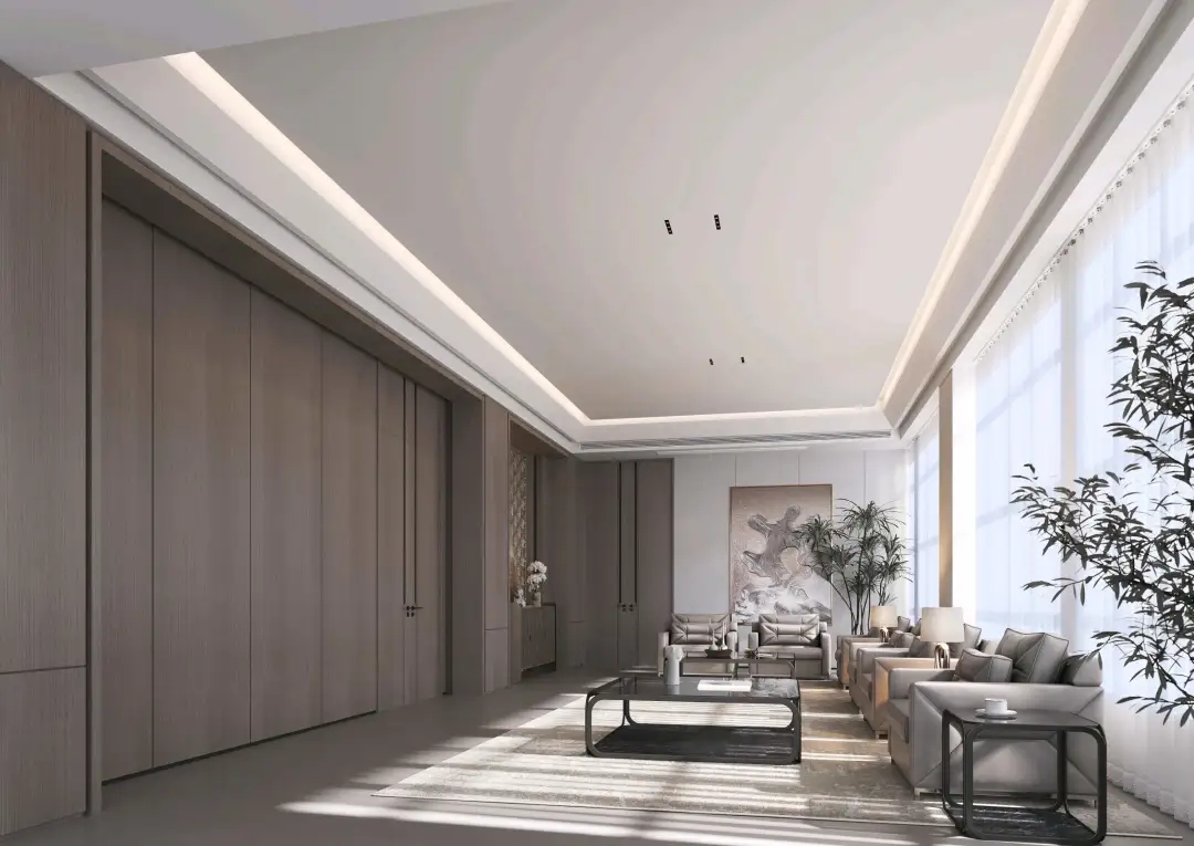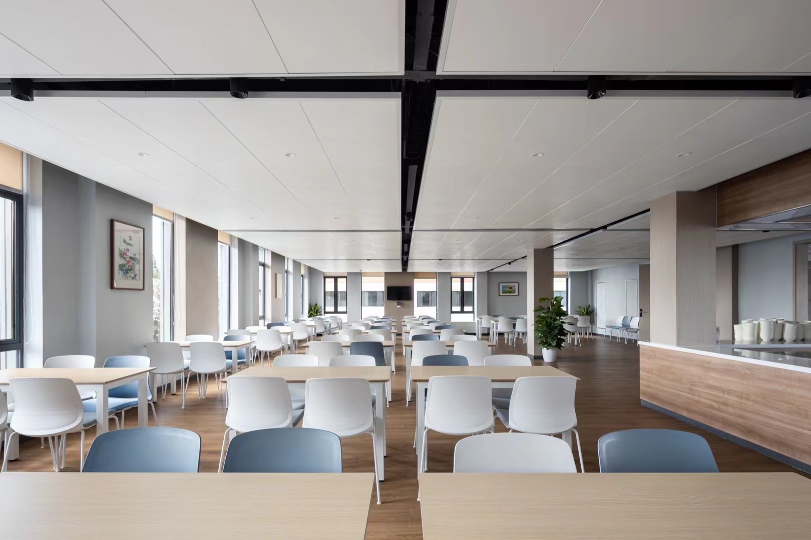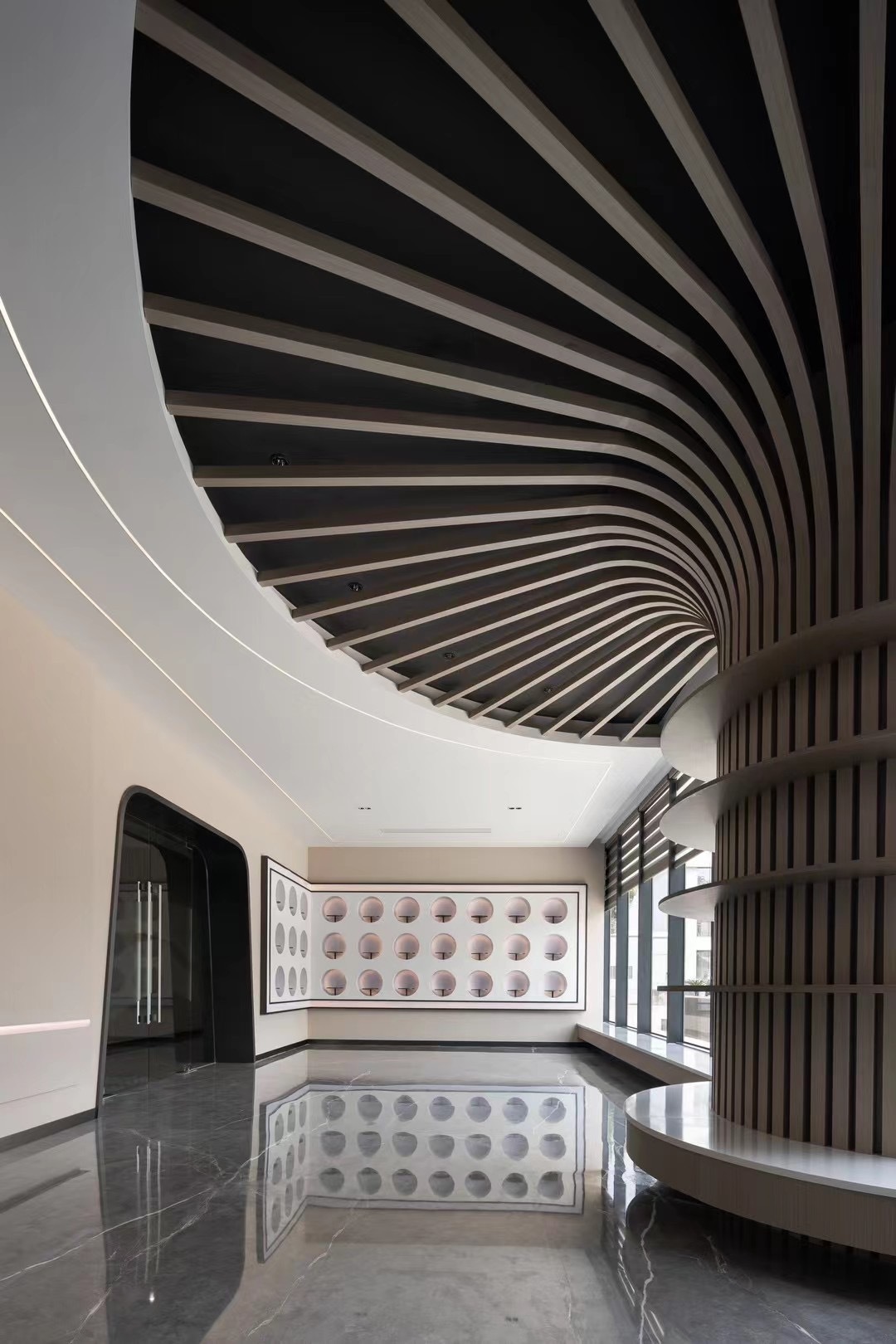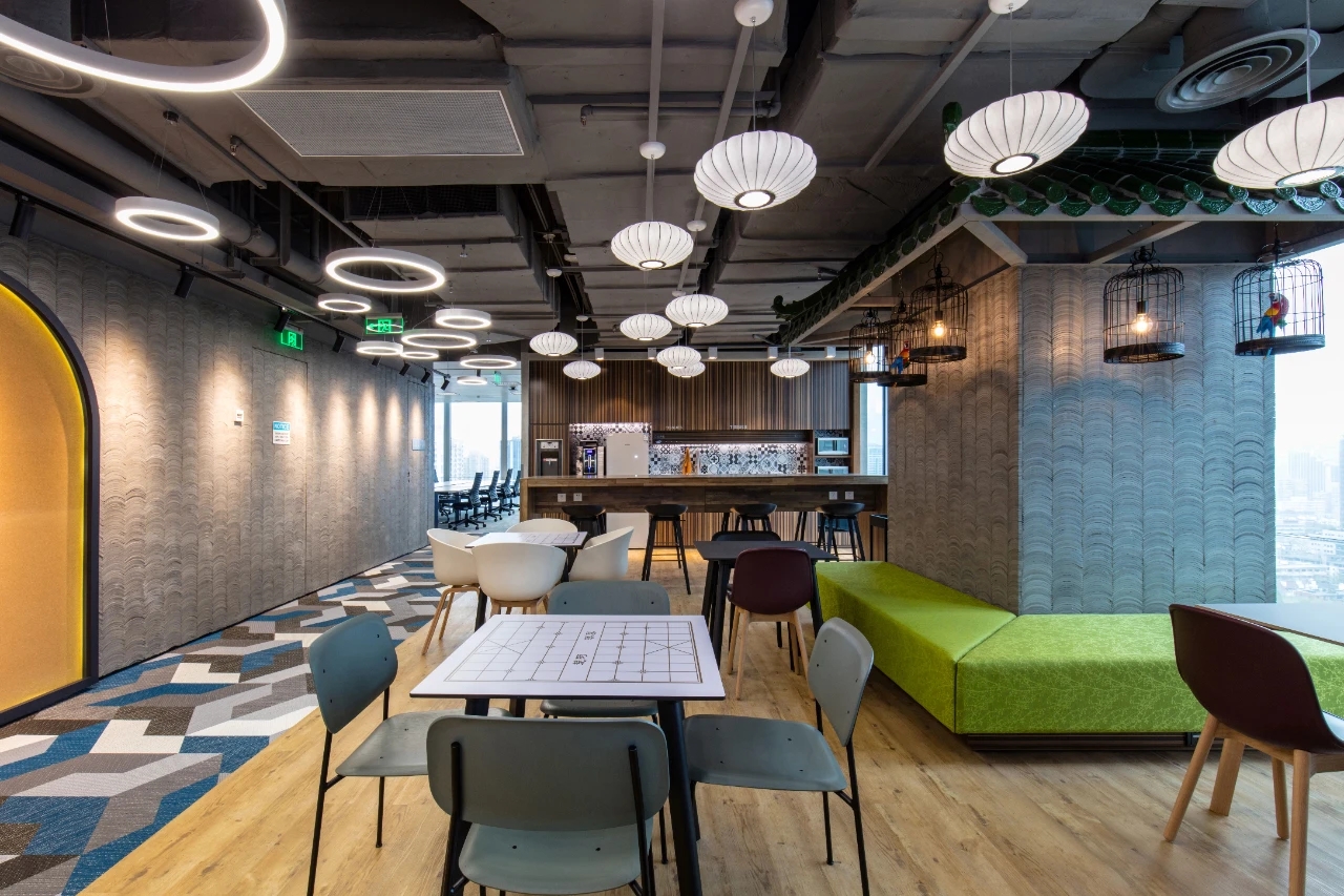 随着脚步的深入,一个开放式咖啡吧映入眼帘,这里是供大家休憩放松、洽谈交流的理想场所。独特的定制灯具与古朴的中式建筑元素相互映衬,既展现了所在地域的文化韵味,又营造出一种闲适与艺术的氛围。