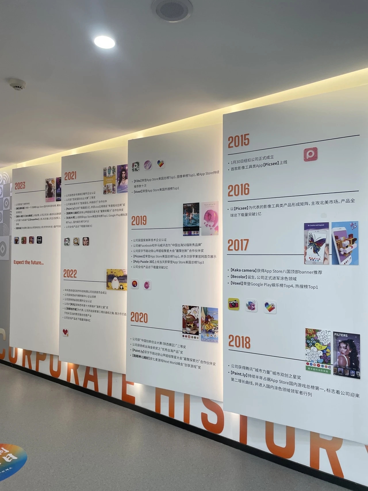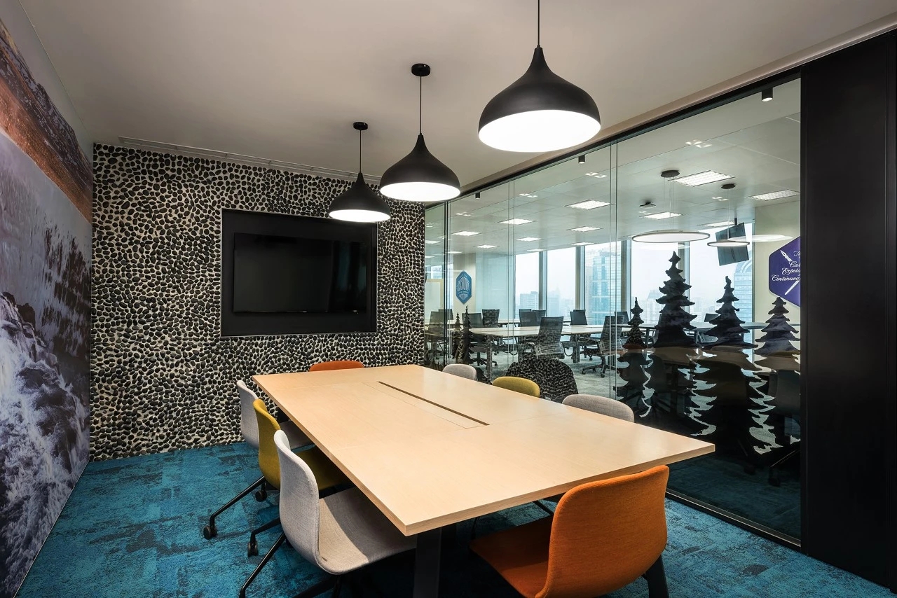 穿过咖啡吧,办公区域豁然开朗:办公桌沿窗铺展,自然光线倾泻而下,形成了一片明亮的工作区域,有助于员工的身心健康与工作效率。而会议室的设计,则为这段旅程赋予了归属感:员工旅途中拍摄的照片被印制成大幅壁纸,打造出一系列具有特定主题的房间,让整个办公空间更加生动有趣。