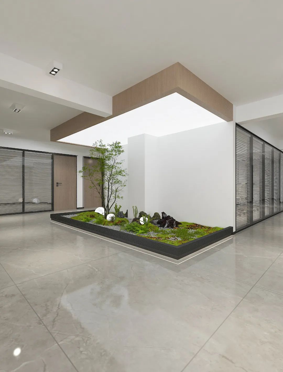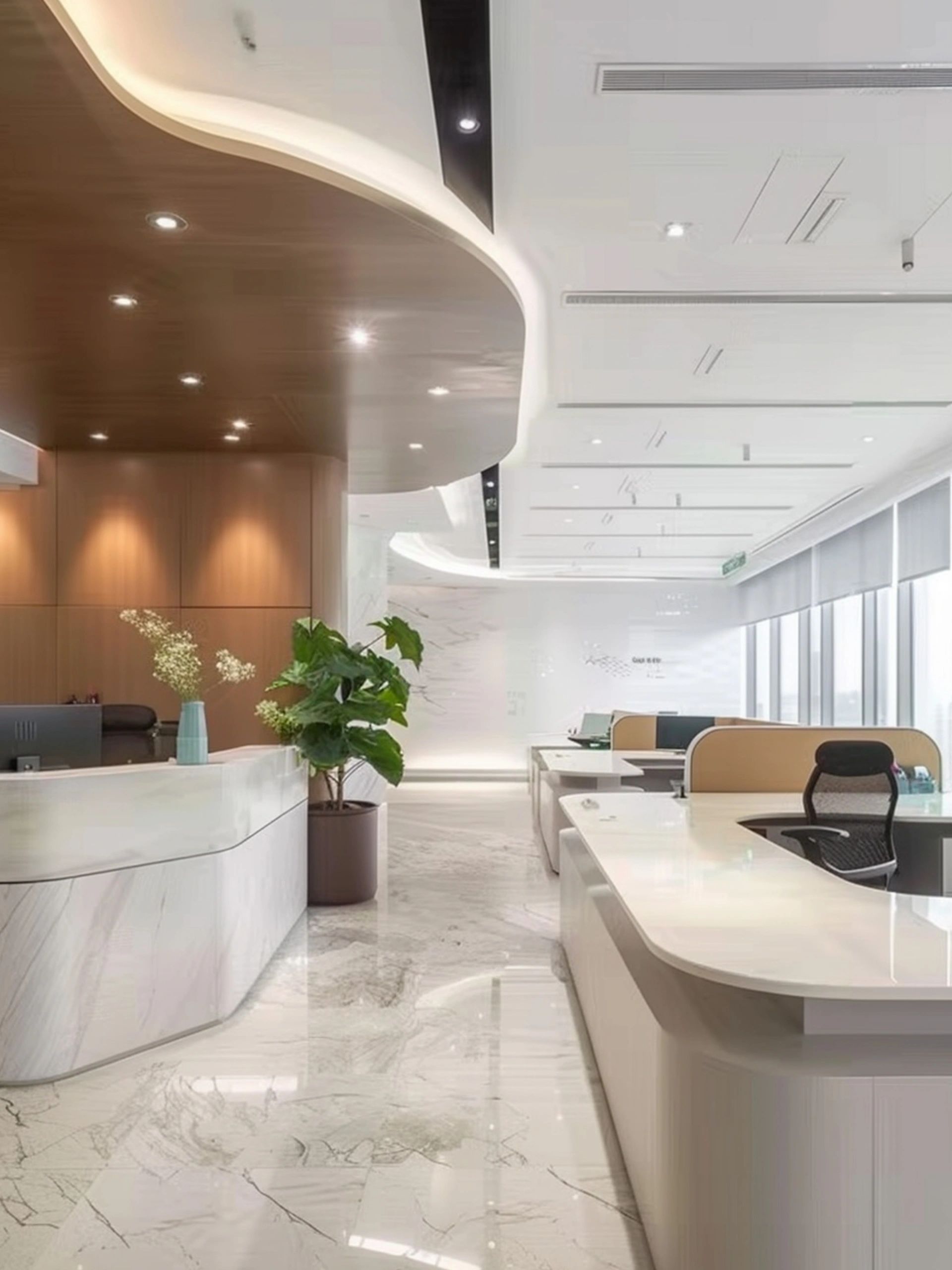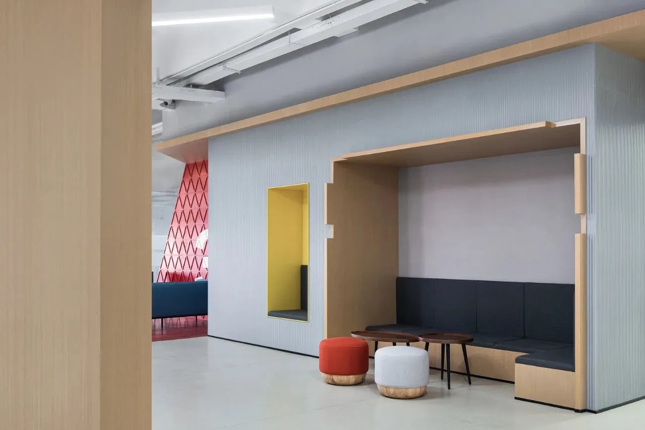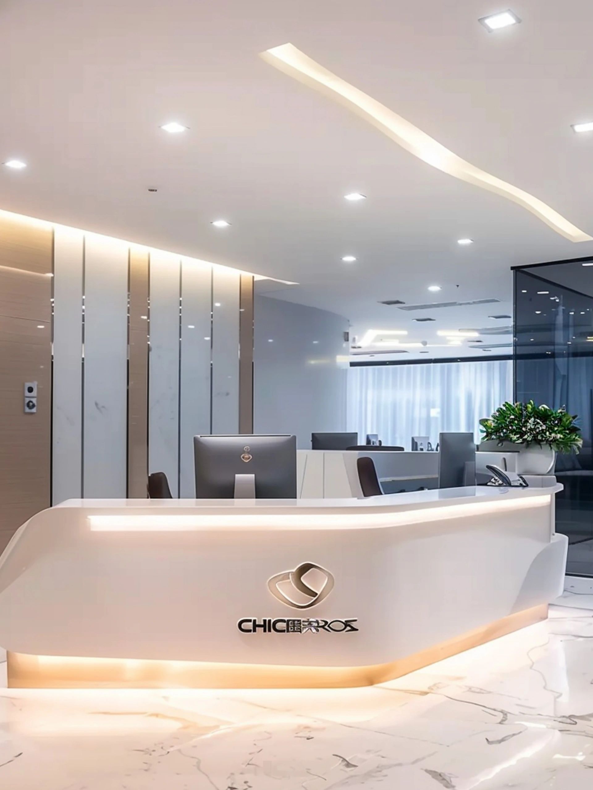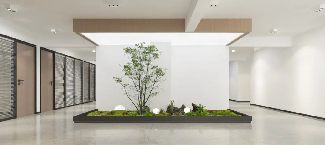 面对5.2米高的开阔空间,我们采取了垂直扩展策略,巧妙地增设夹层,不仅最大化了空间利用率,还便于俯瞰生产区,提升监控效率。通高位置边缘一圈被规划为开放的工作区,可根据员工的需求和项目的变化进行调整,多元灵活。在“回”字行过道转角处,仿真微生物景观成为空间中的艺术品。在电梯厅等候区,隐形门巧妙地融入logo墙,增强了空间的连贯性。而真·景观绿植盆栽则与logo墙形成对望。