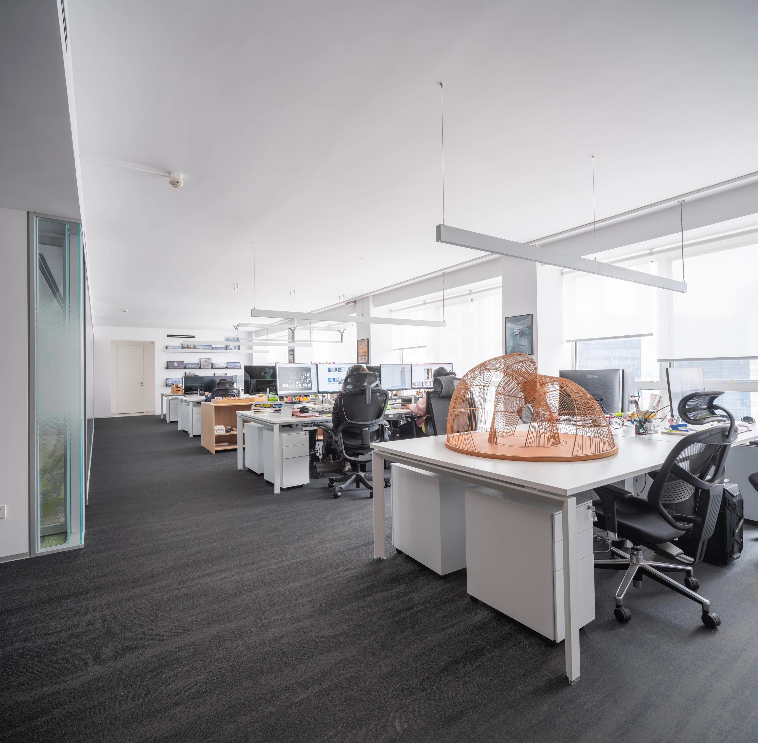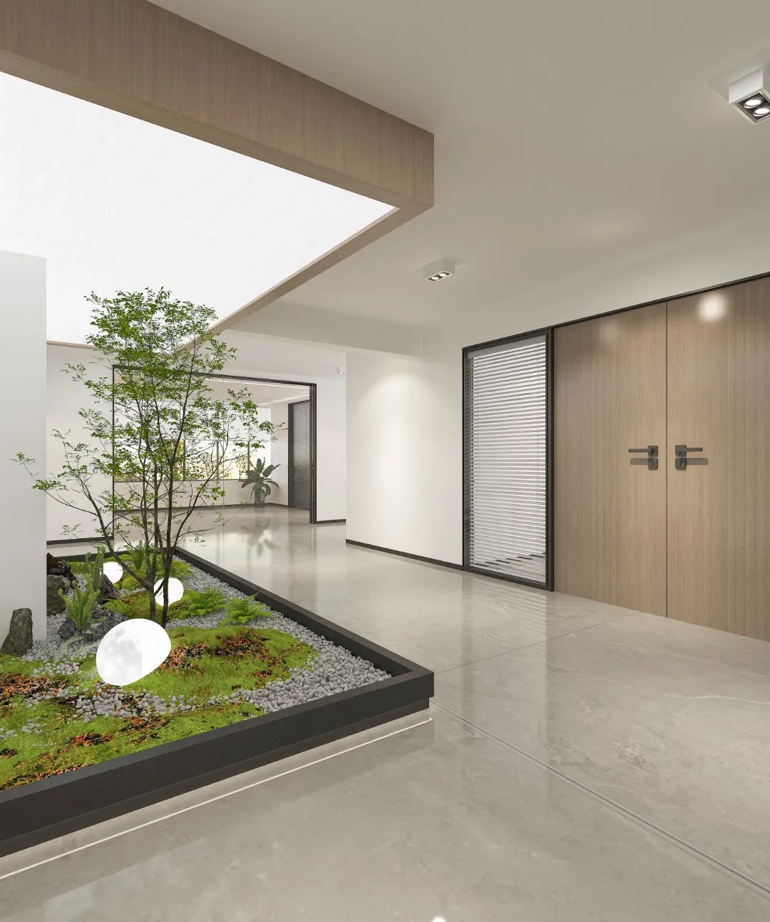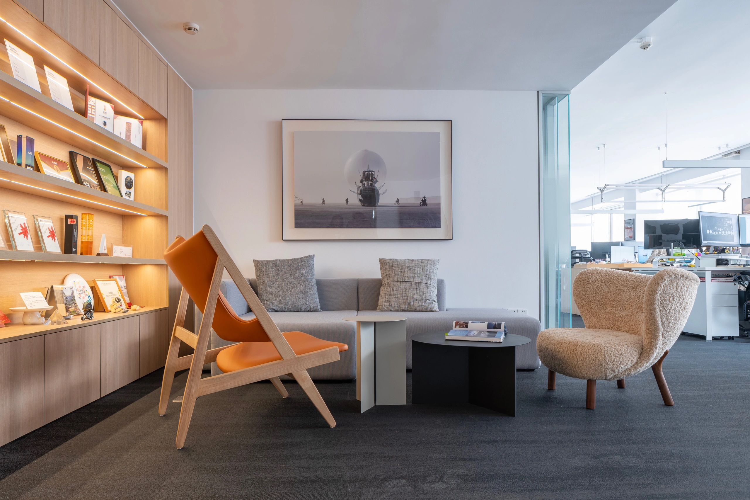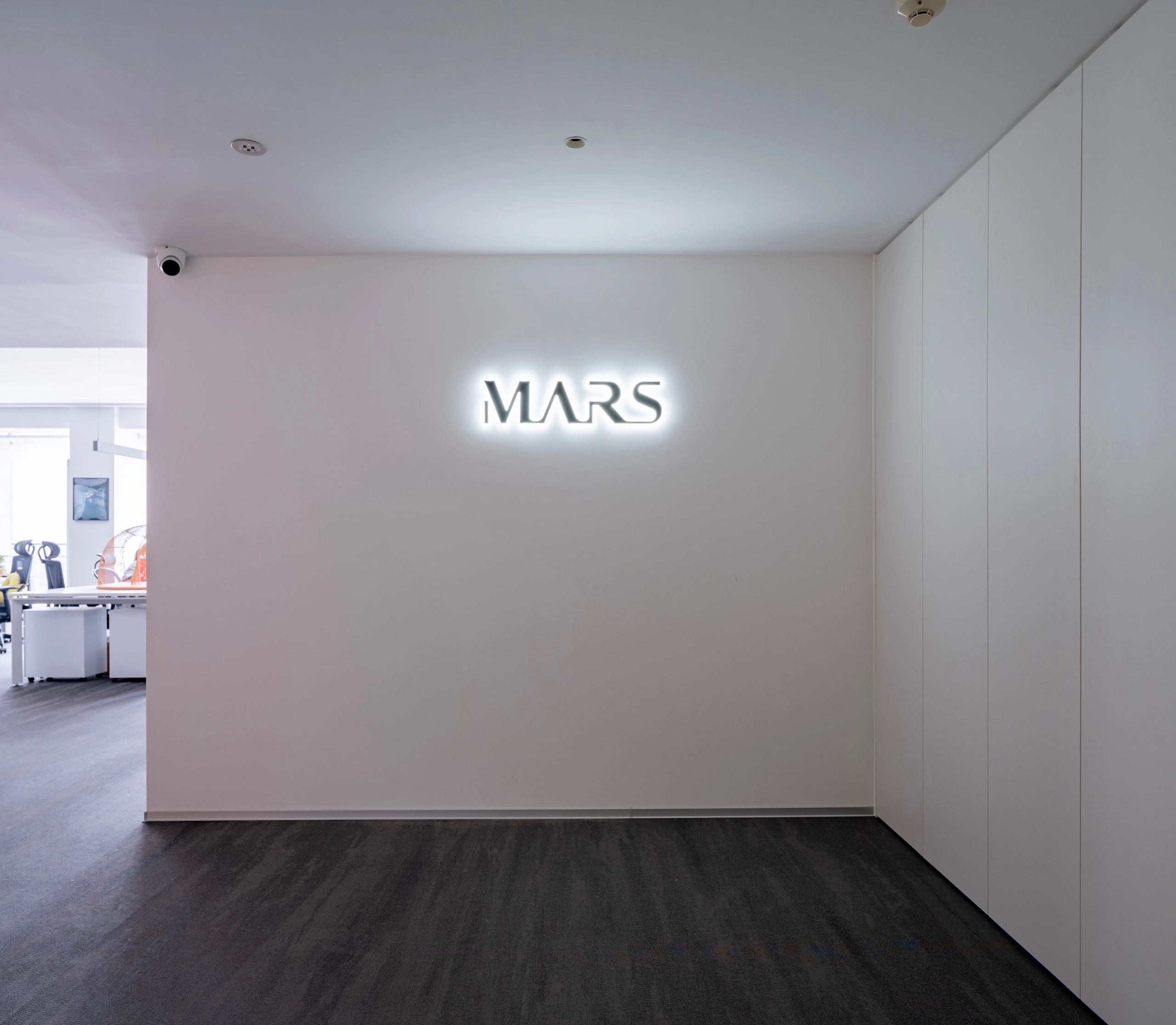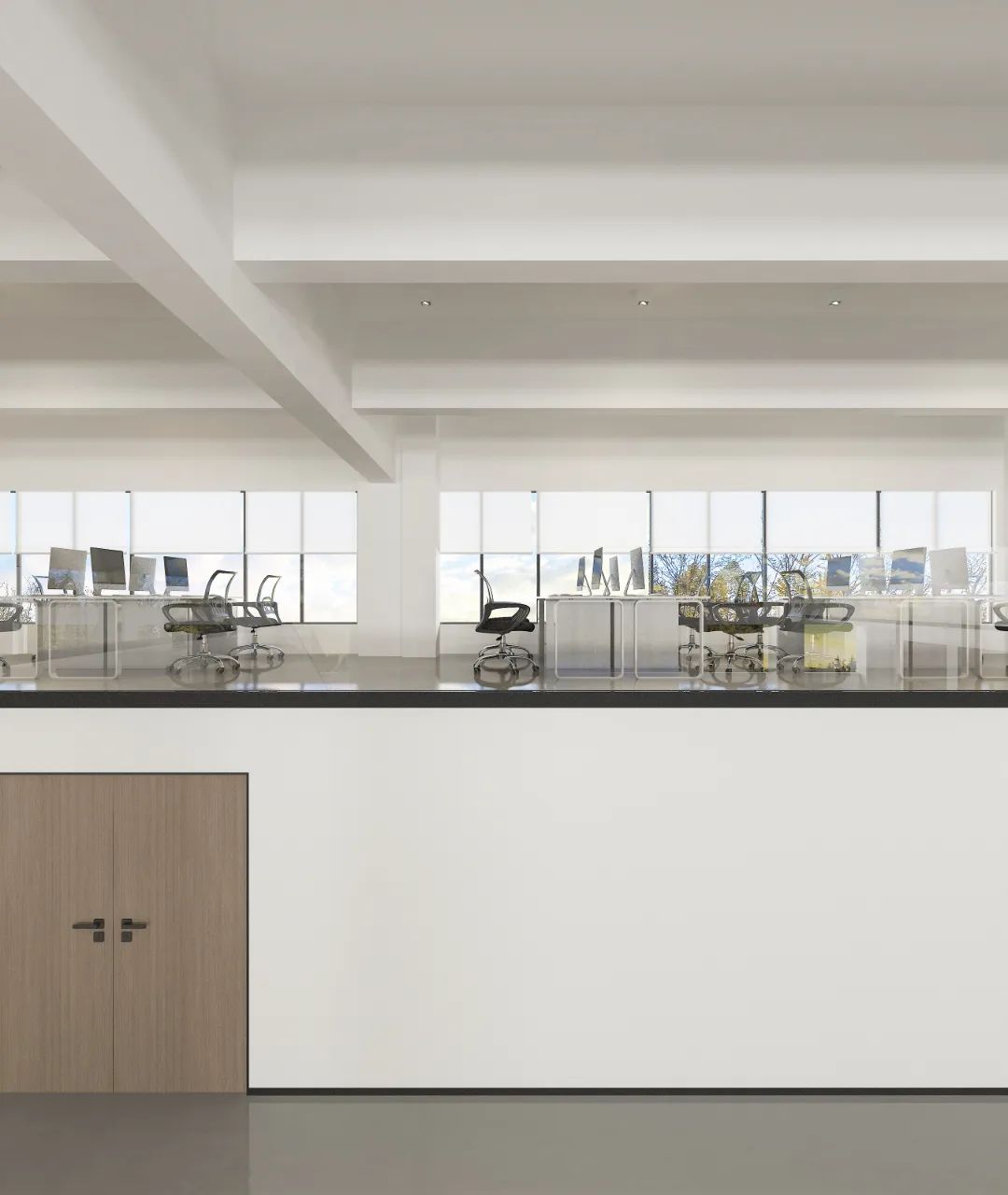 面对5.2米高的开阔空间,我们采取了垂直扩展策略,巧妙地增设夹层,不仅最大化了空间利用率,还便于俯瞰生产区,提升监控效率。通高位置边缘一圈被规划为开放的工作区,可根据员工的需求和项目的变化进行调整,多元灵活。在“回”字行过道转角处,仿真微生物景观成为空间中的艺术品。在电梯厅等候区,隐形门巧妙地融入logo墙,增强了空间的连贯性。而真·景观绿植盆栽则与logo墙形成对望。