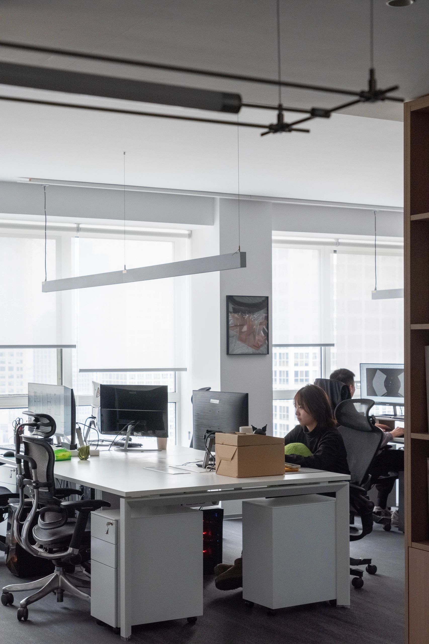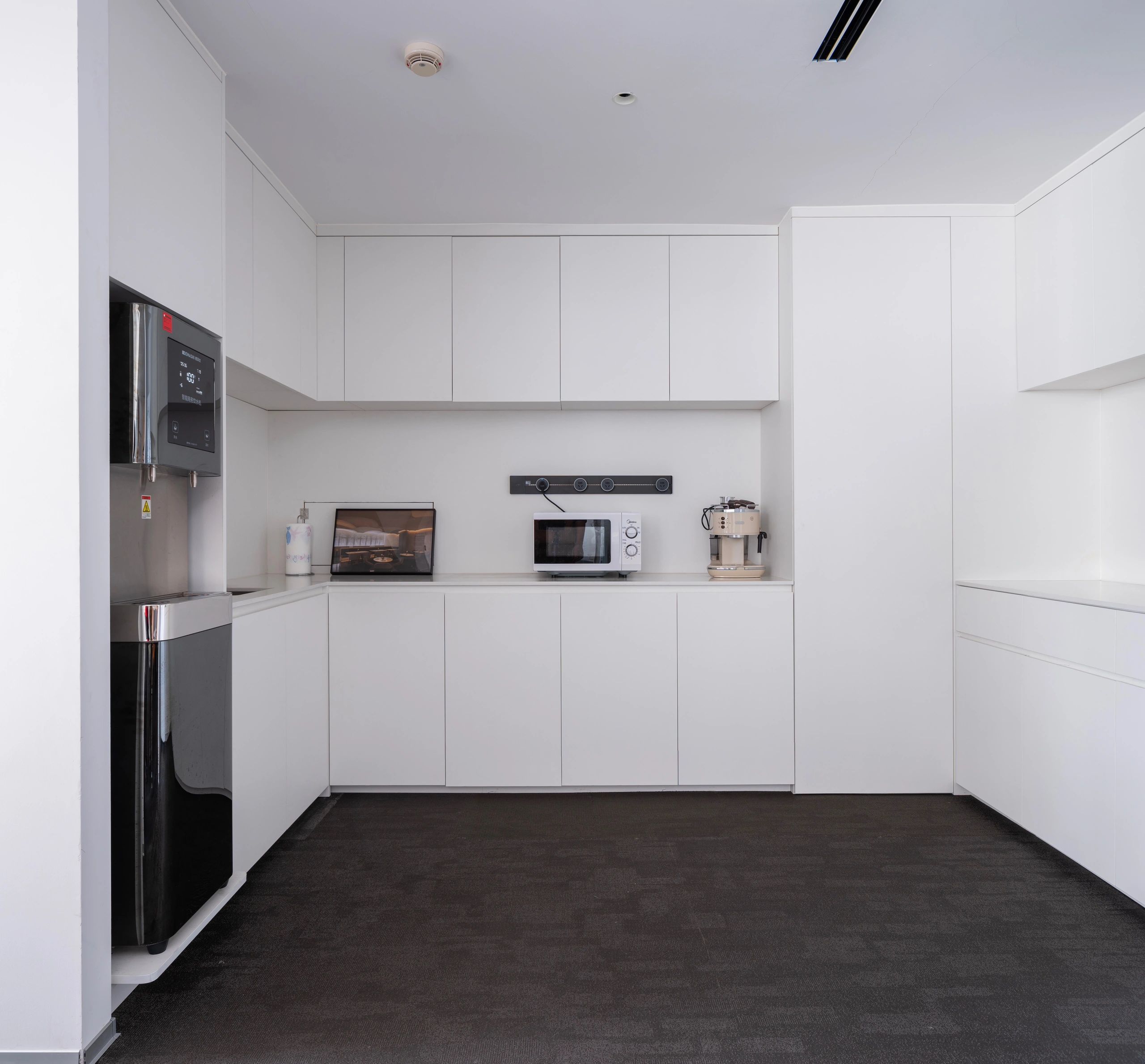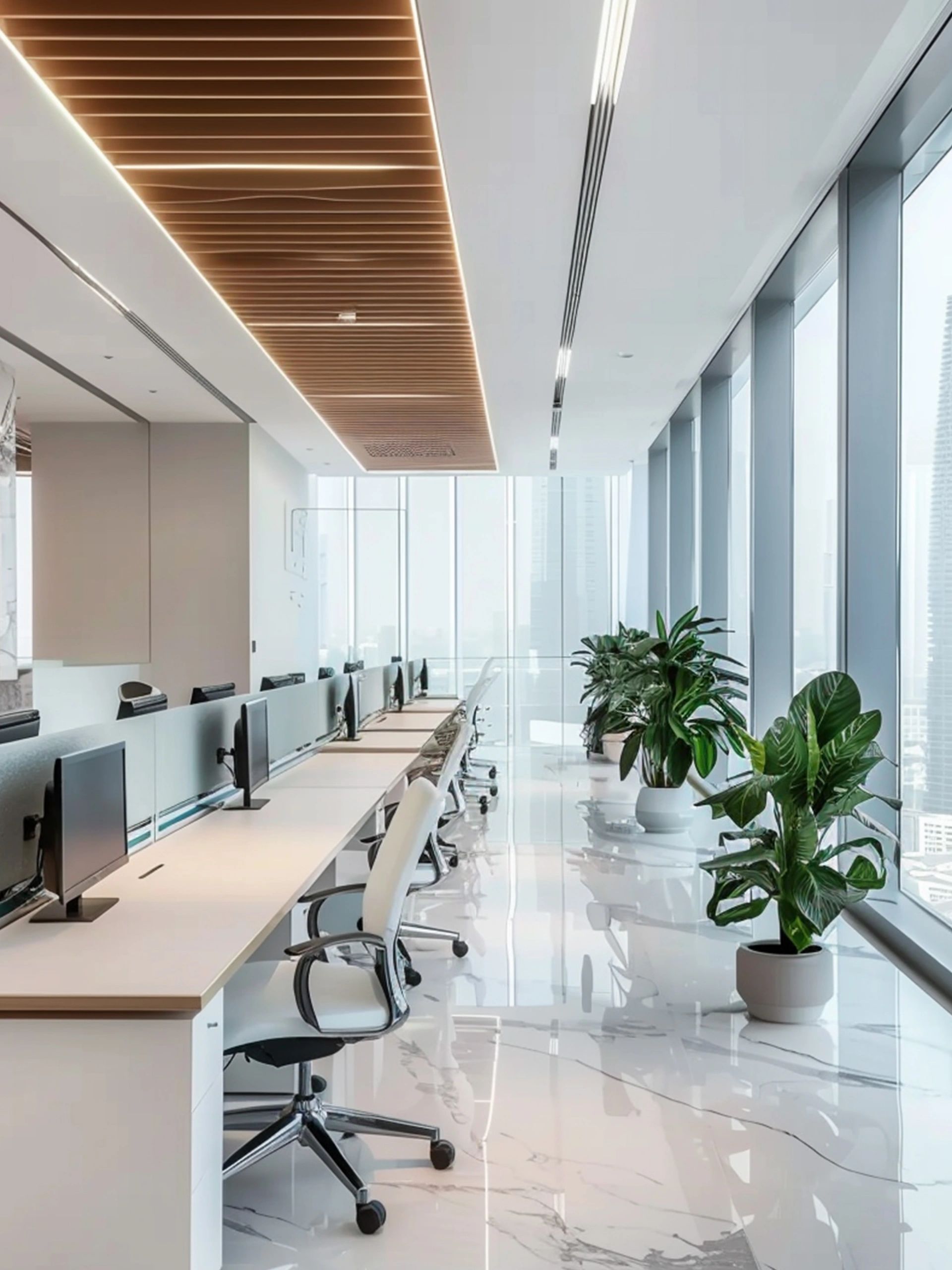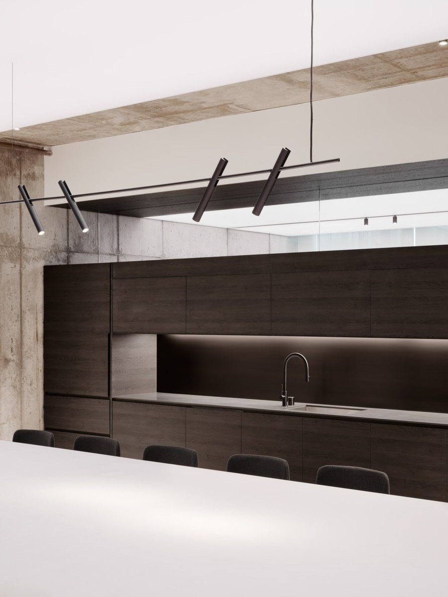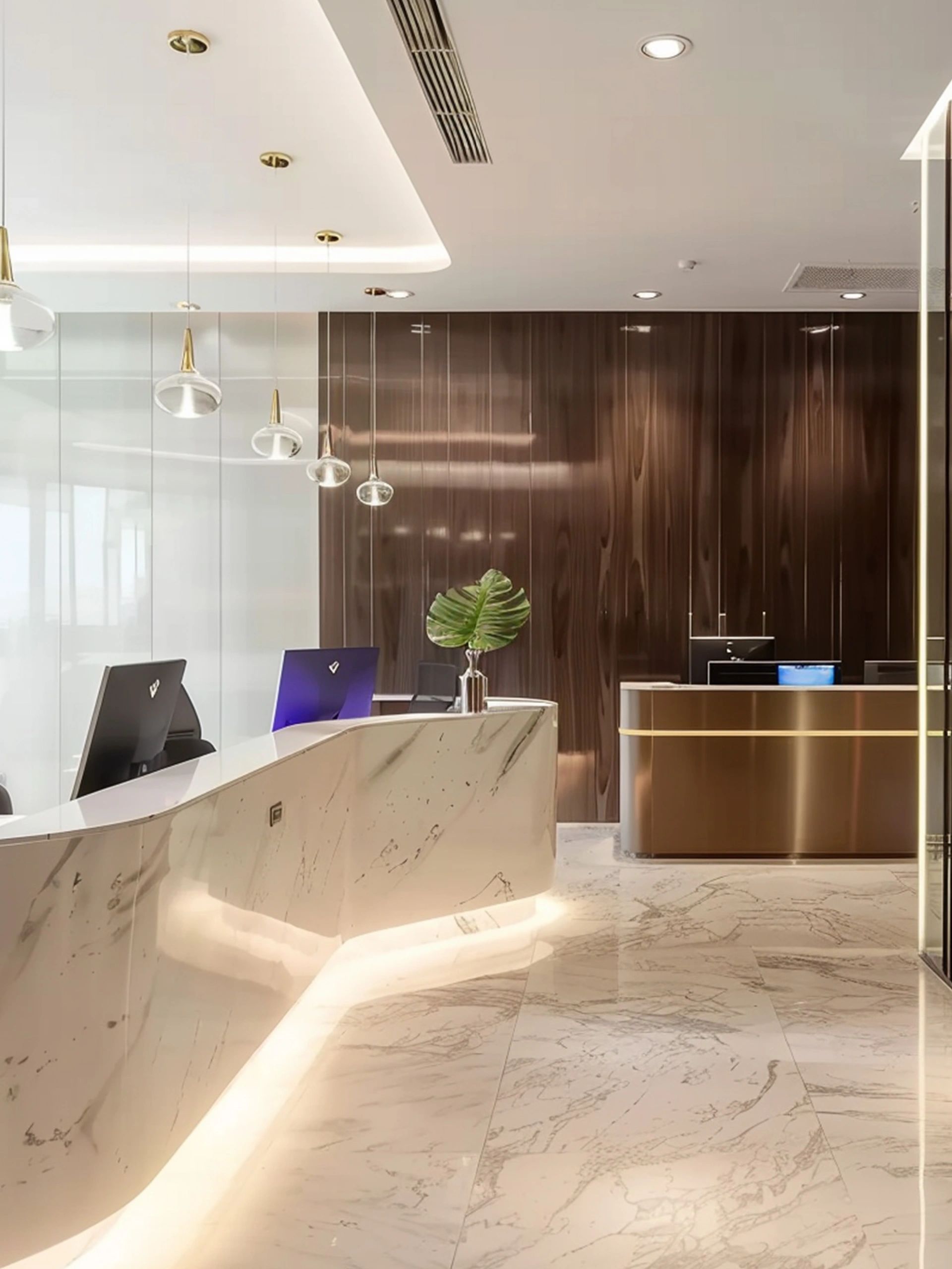 面对5.2米高的开阔空间,我们采取了垂直扩展策略,巧妙地增设夹层,不仅最大化了空间利用率,还便于俯瞰生产区,提升监控效率。通高位置边缘一圈被规划为开放的工作区,可根据员工的需求和项目的变化进行调整,多元灵活。在“回”字行过道转角处,仿真微生物景观成为空间中的艺术品。在电梯厅等候区,隐形门巧妙地融入logo墙,增强了空间的连贯性。而真·景观绿植盆栽则与logo墙形成对望。