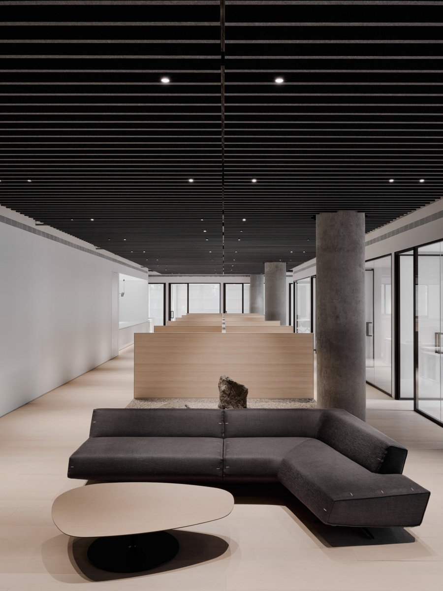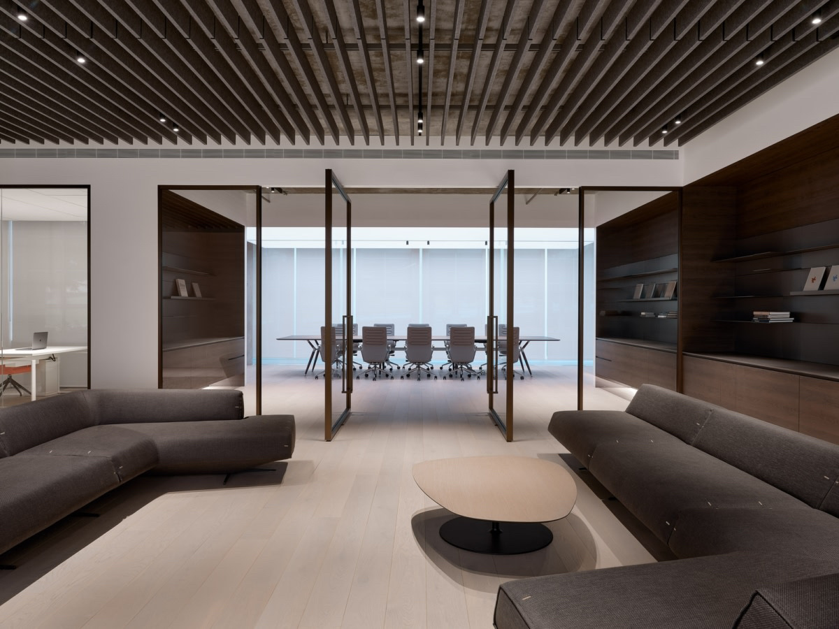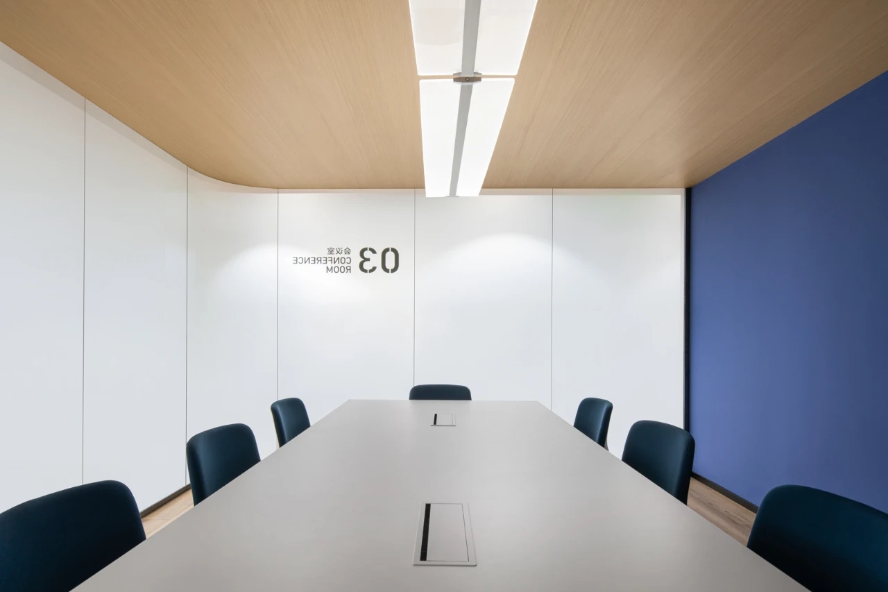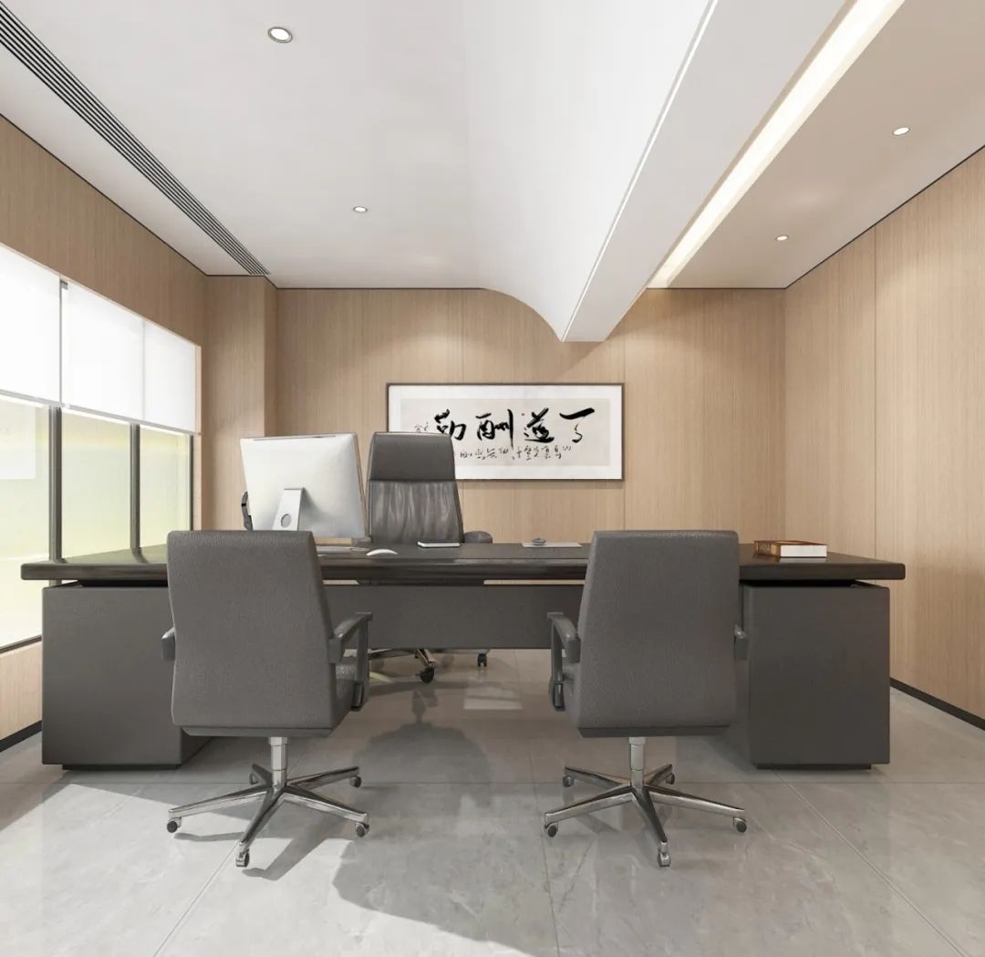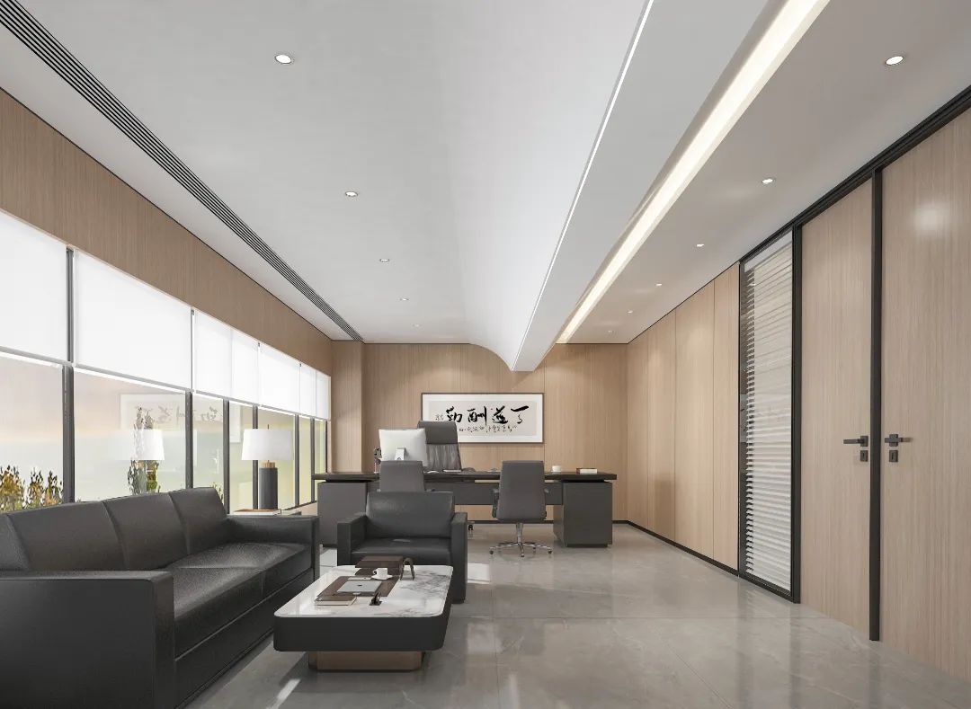 “回”字形的走廊环绕着会议室,全玻璃隔断设计不仅增强了视觉通透性,也让与会者能够轻松捕捉到室外的动态。在总裁办公室内,一根偏位梁原本打破了空间的完整性,但通过曲线装饰吊顶的设计,我们巧妙地柔化了空间线条,赋予了室内一种和谐而流畅的美感。