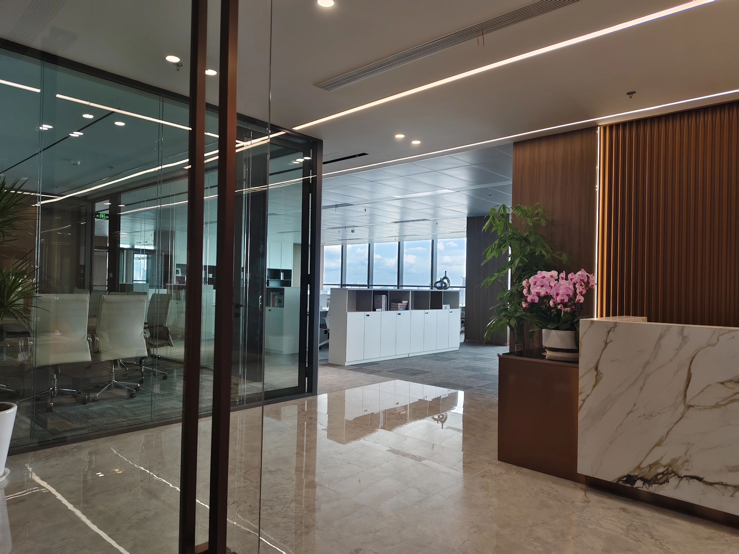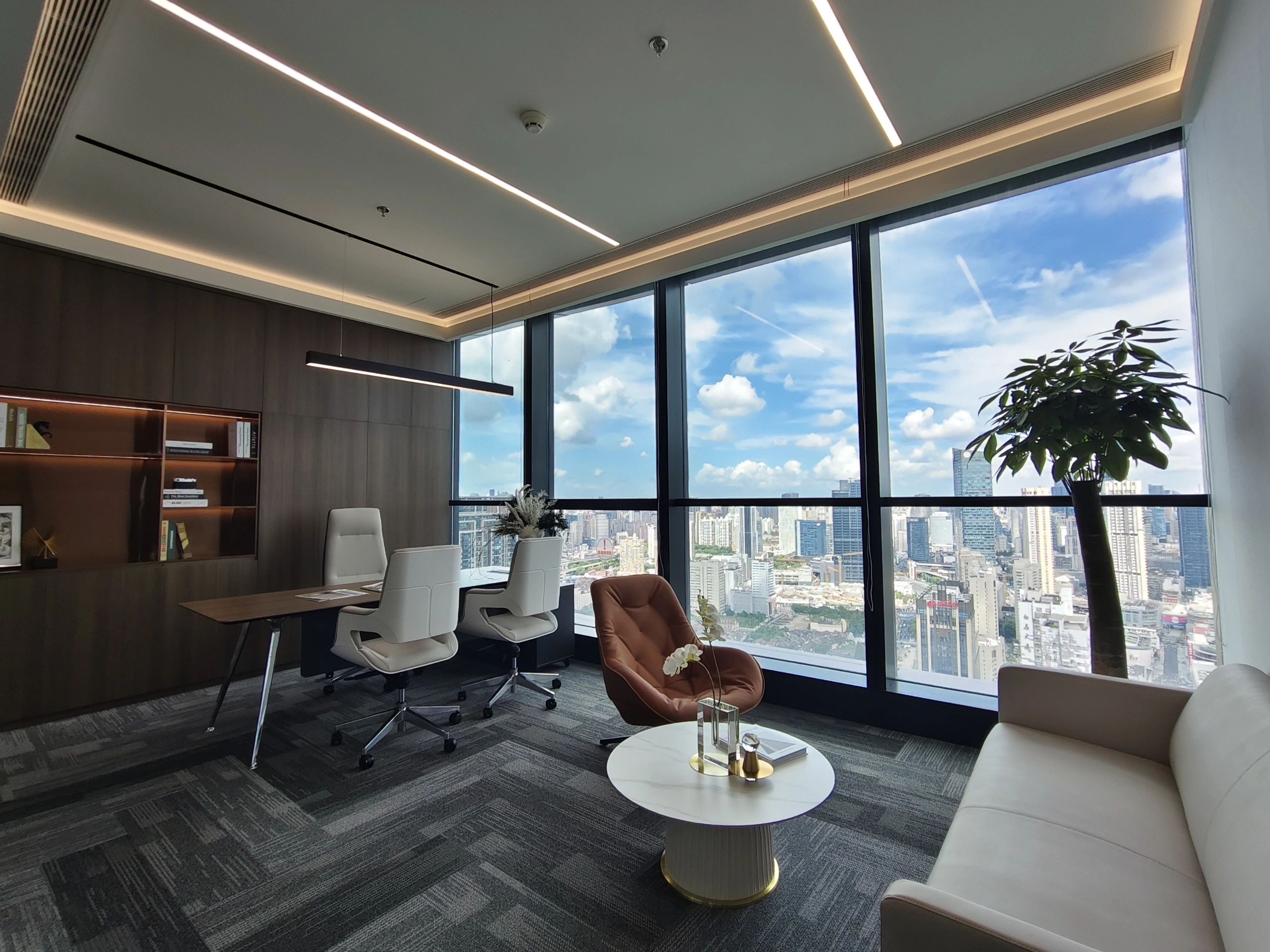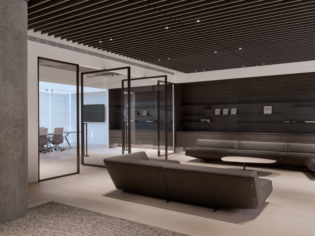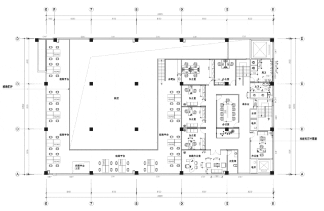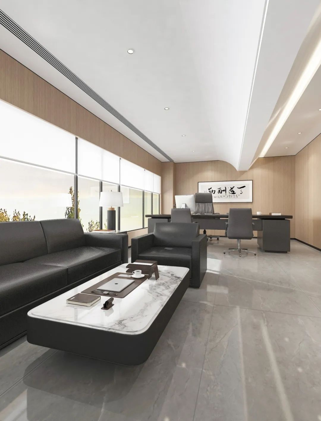 “回”字形的走廊环绕着会议室,全玻璃隔断设计不仅增强了视觉通透性,也让与会者能够轻松捕捉到室外的动态。在总裁办公室内,一根偏位梁原本打破了空间的完整性,但通过曲线装饰吊顶的设计,我们巧妙地柔化了空间线条,赋予了室内一种和谐而流畅的美感。