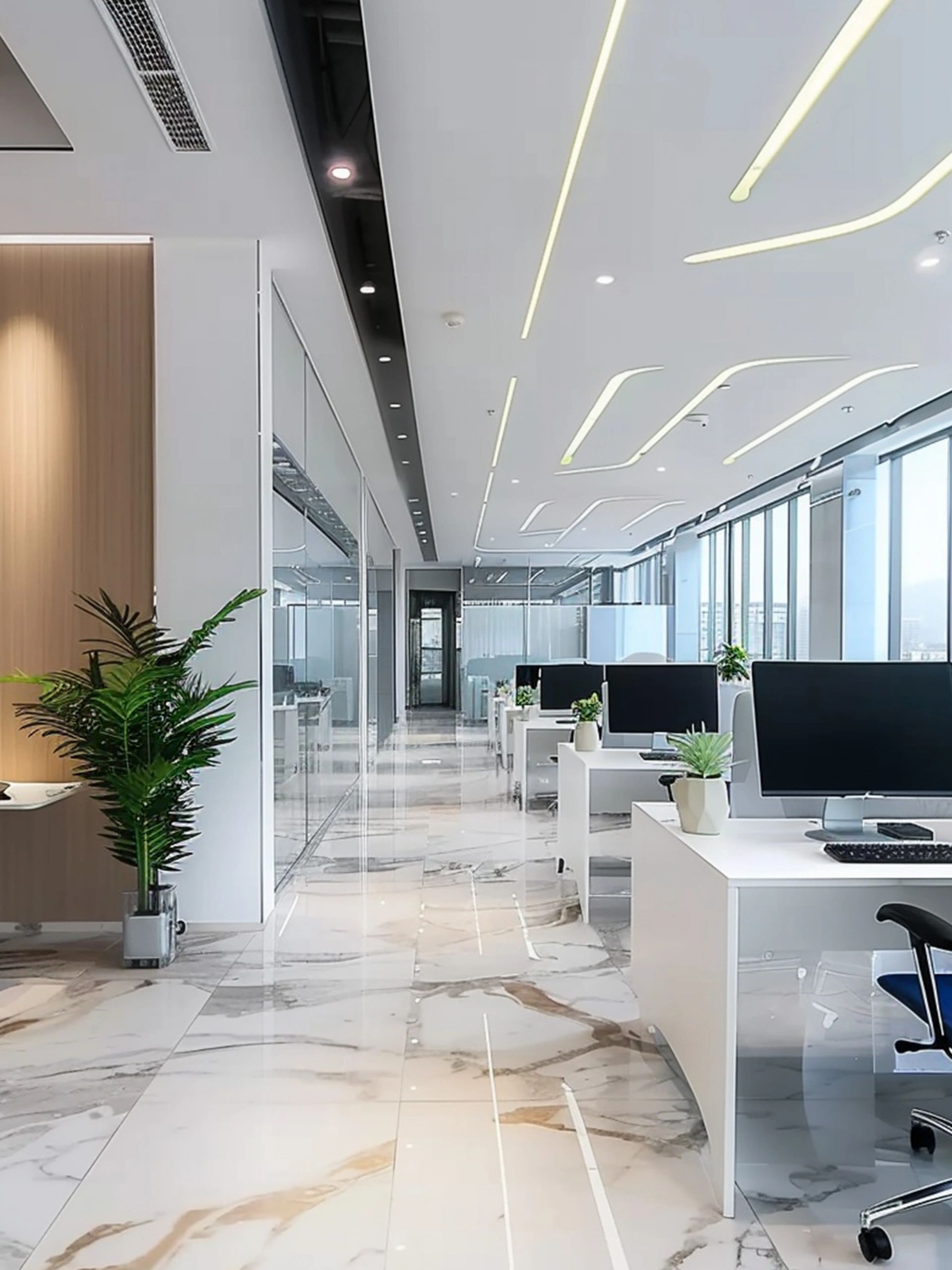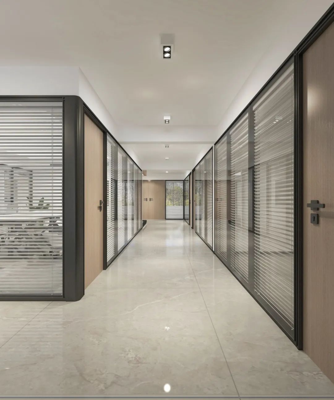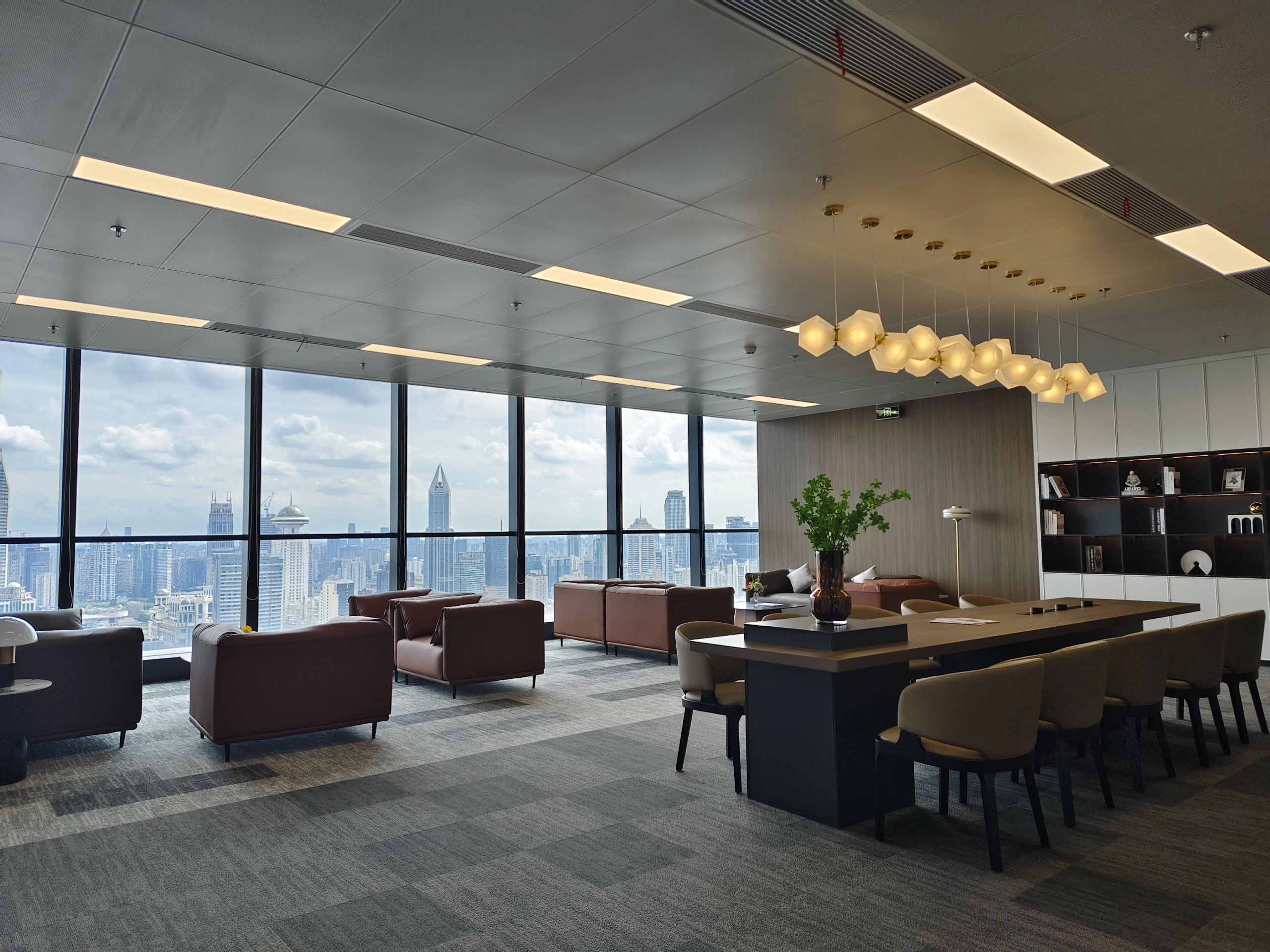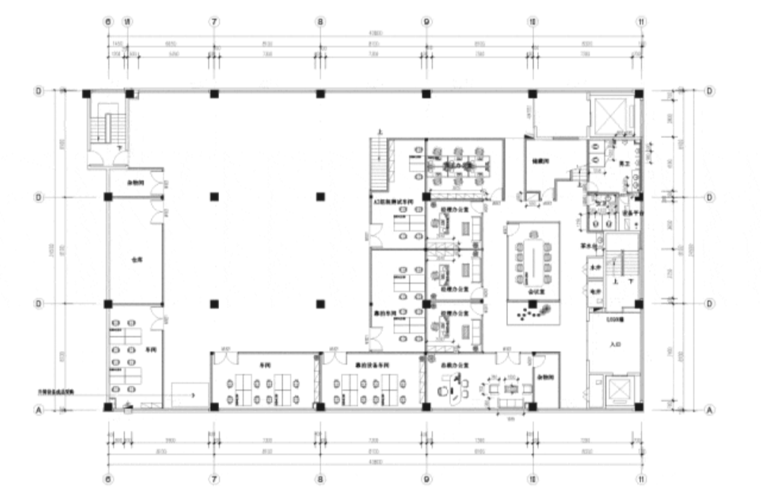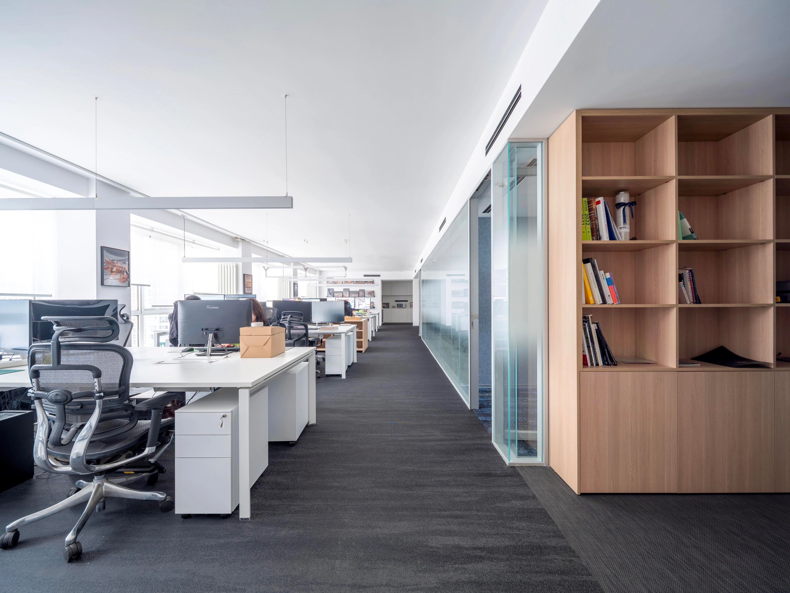 “回”字形的走廊环绕着会议室,全玻璃隔断设计不仅增强了视觉通透性,也让与会者能够轻松捕捉到室外的动态。在总裁办公室内,一根偏位梁原本打破了空间的完整性,但通过曲线装饰吊顶的设计,我们巧妙地柔化了空间线条,赋予了室内一种和谐而流畅的美感。