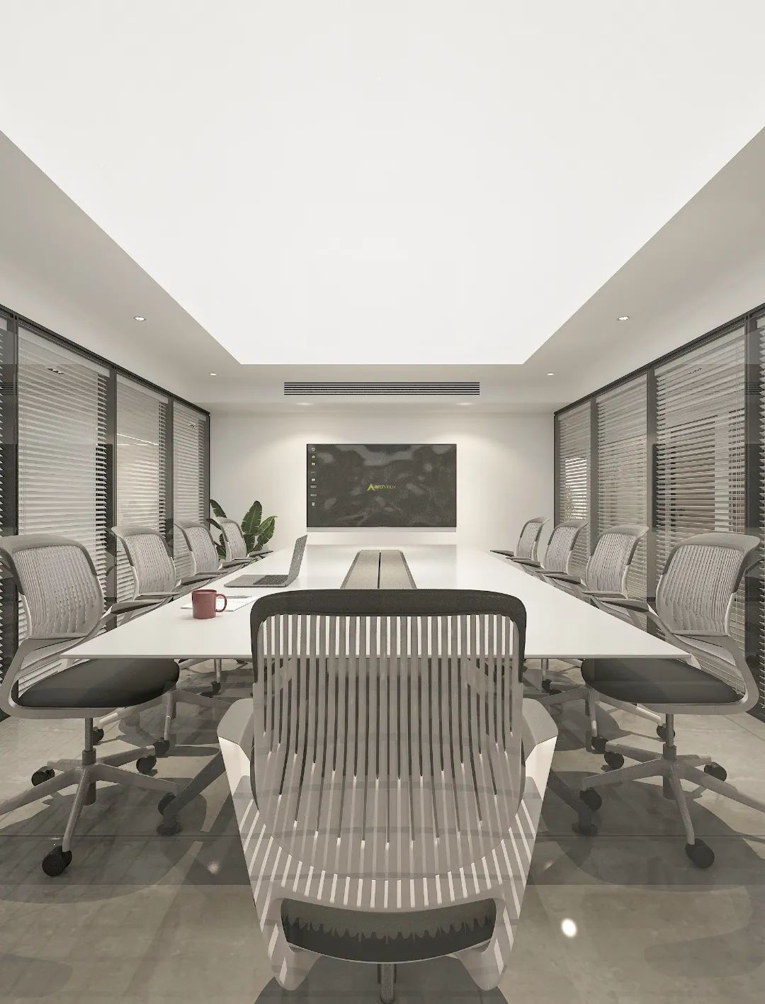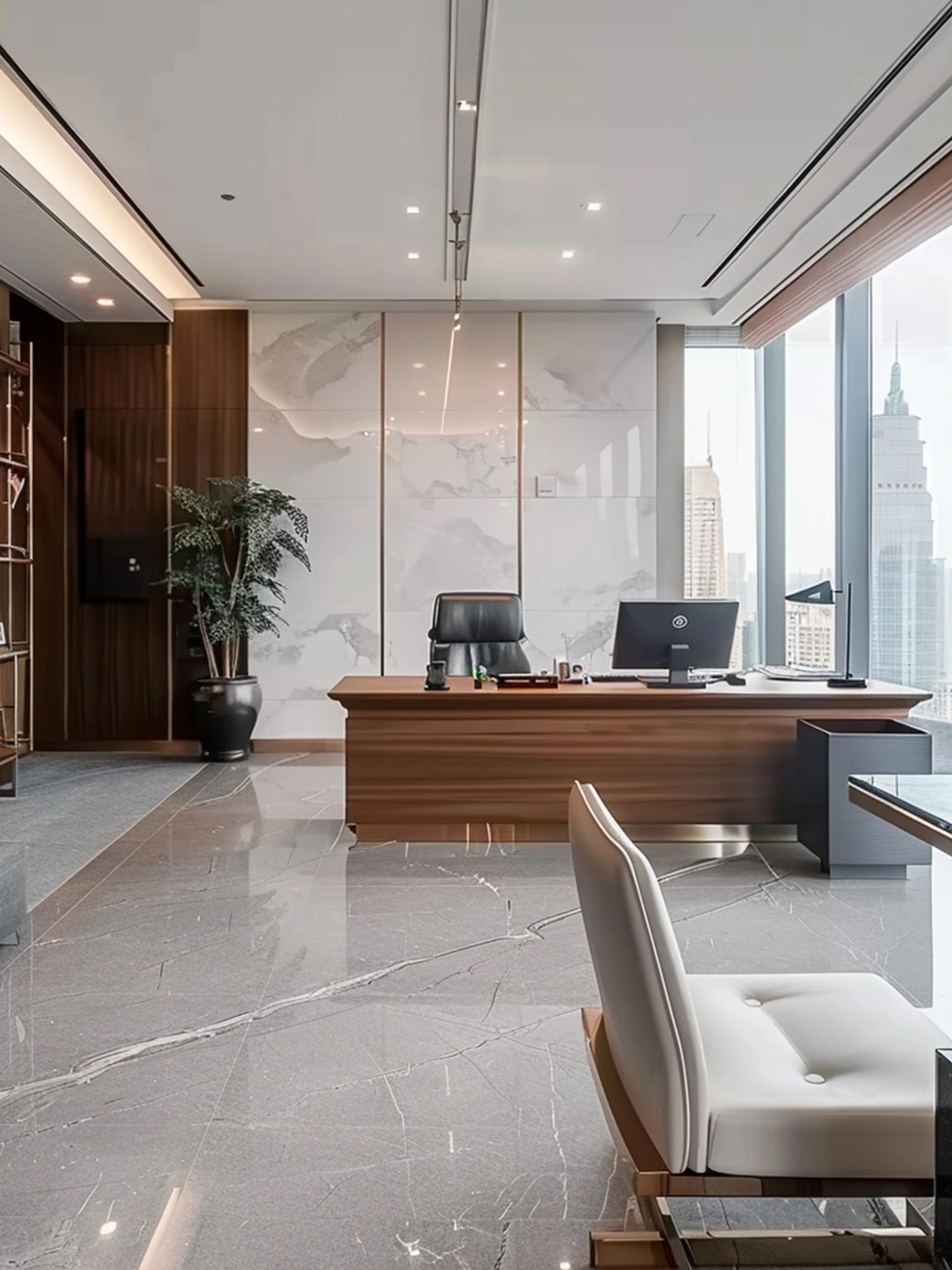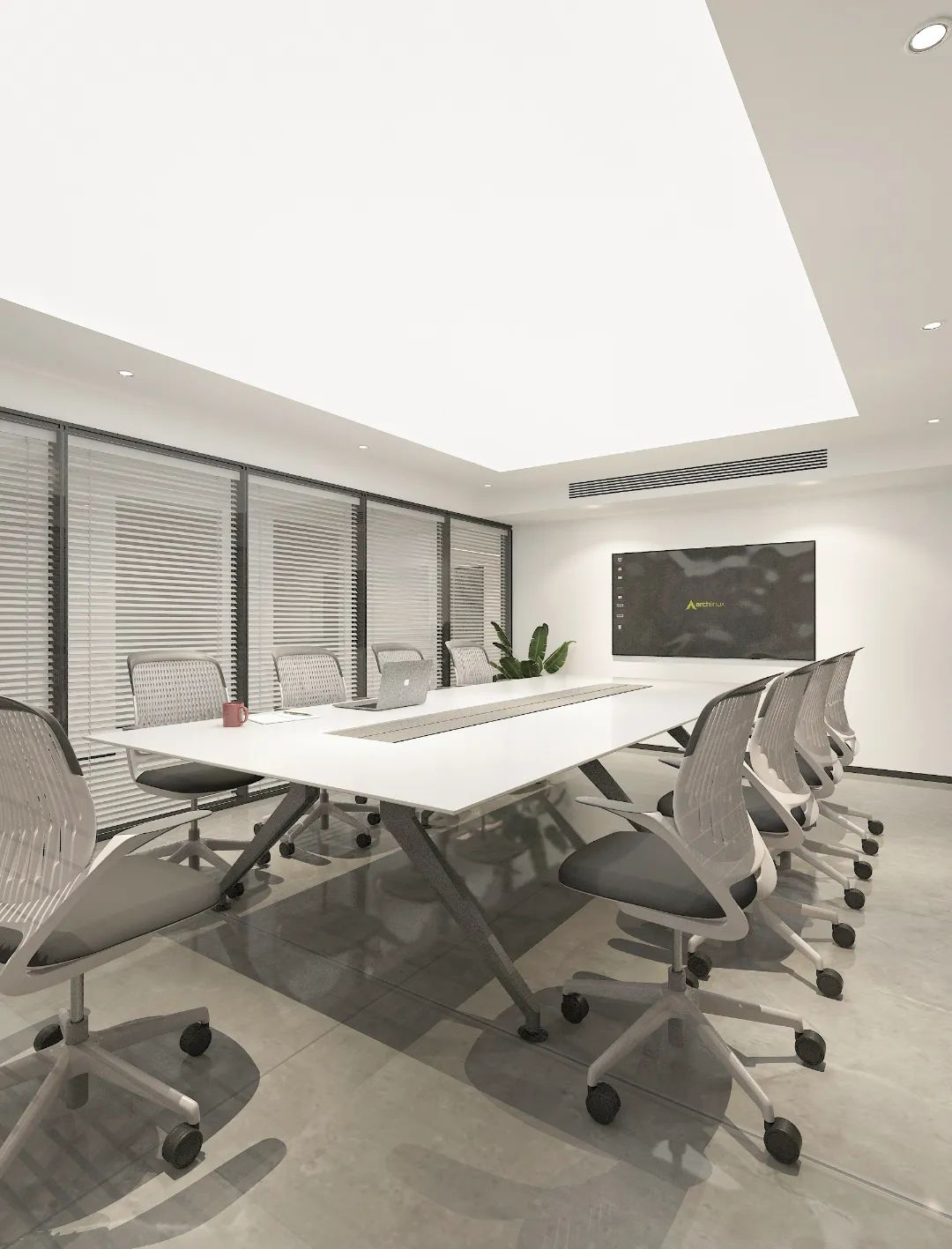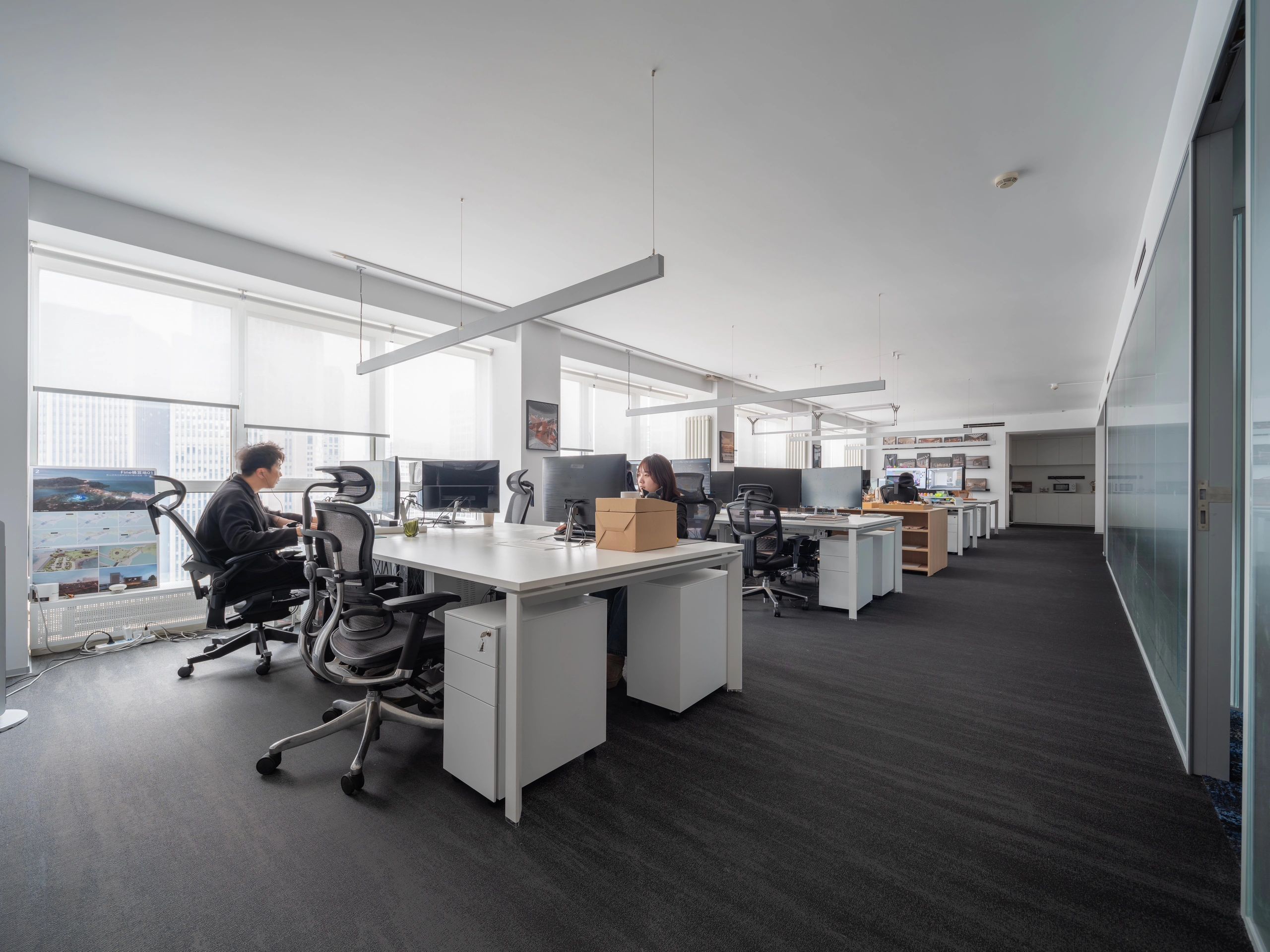 “回”字形的走廊环绕着会议室,全玻璃隔断设计不仅增强了视觉通透性,也让与会者能够轻松捕捉到室外的动态。在总裁办公室内,一根偏位梁原本打破了空间的完整性,但通过曲线装饰吊顶的设计,我们巧妙地柔化了空间线条,赋予了室内一种和谐而流畅的美感。
