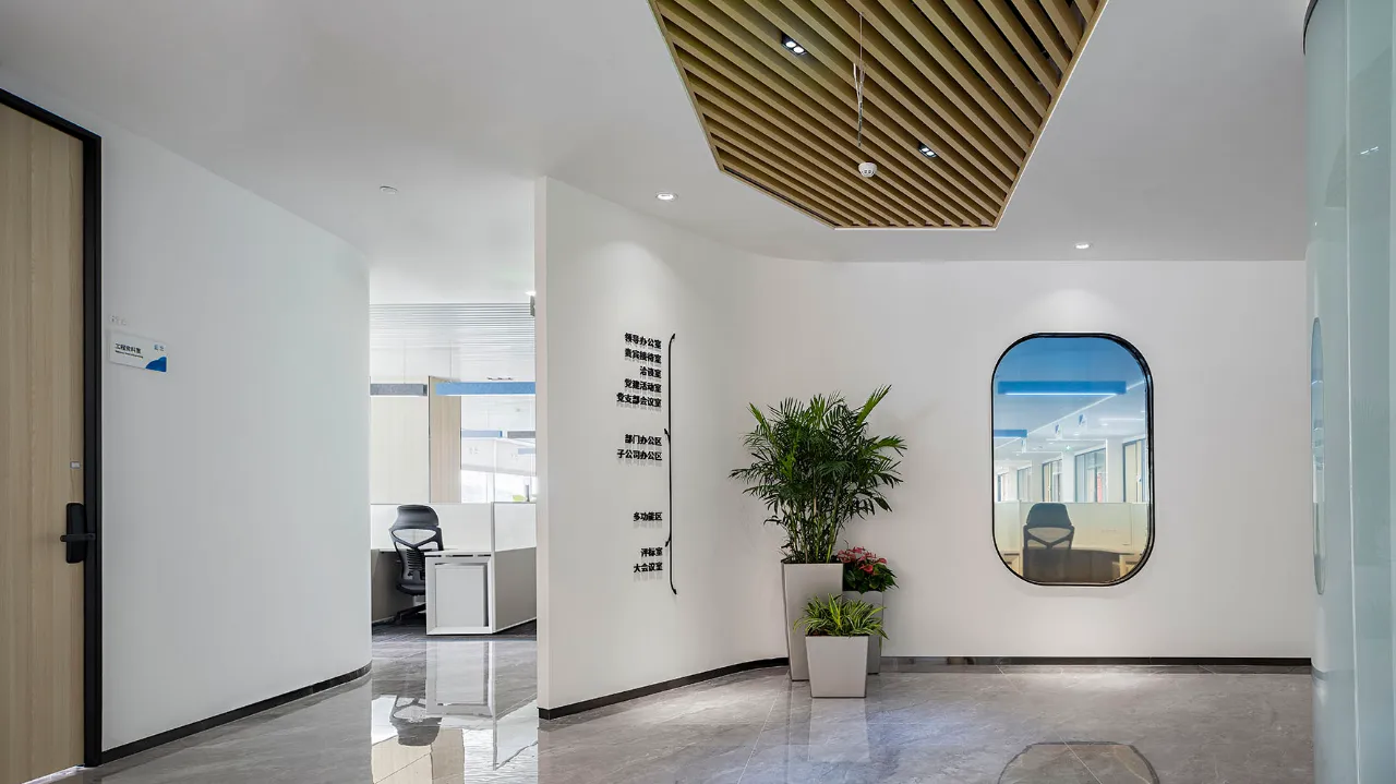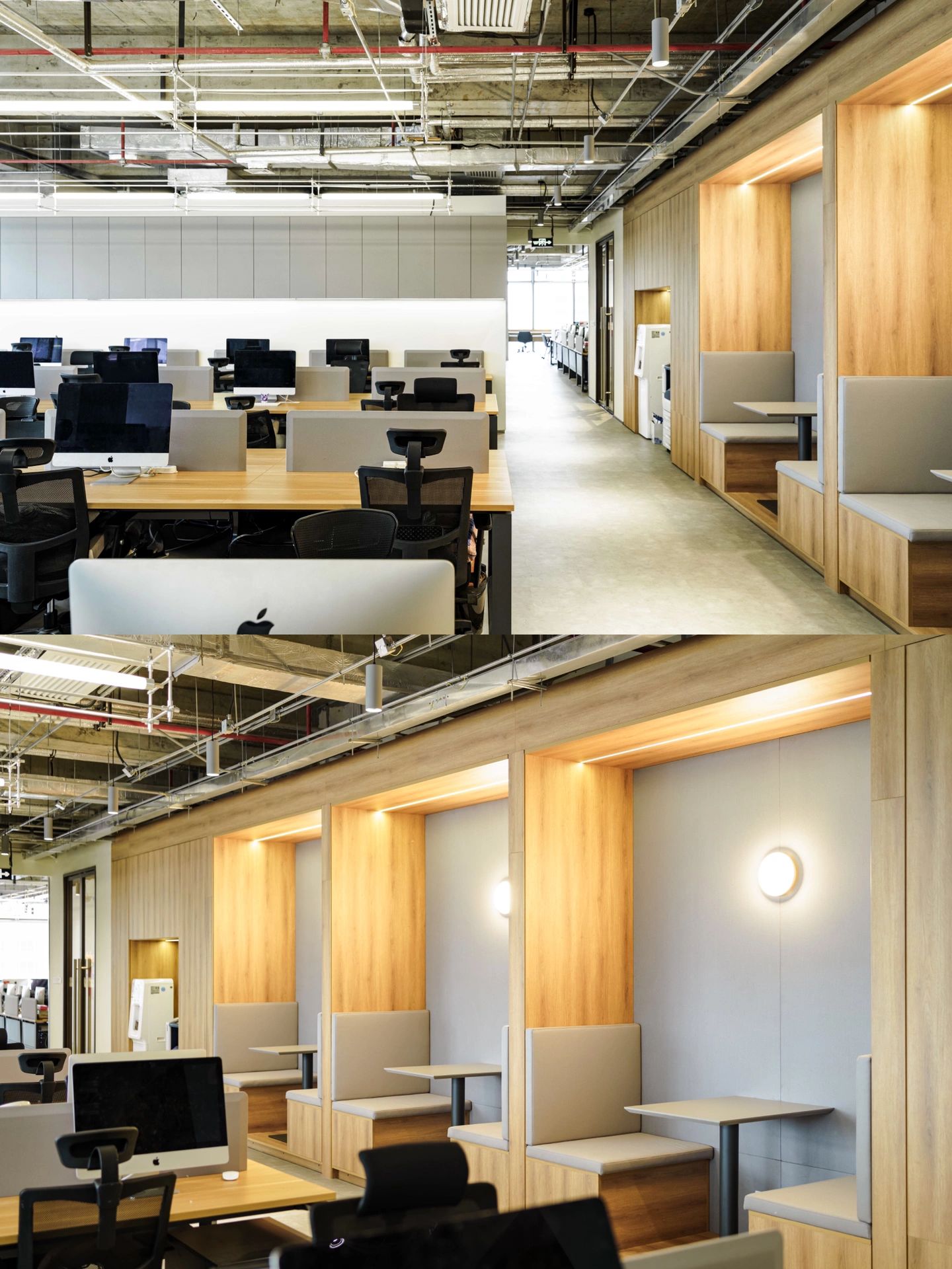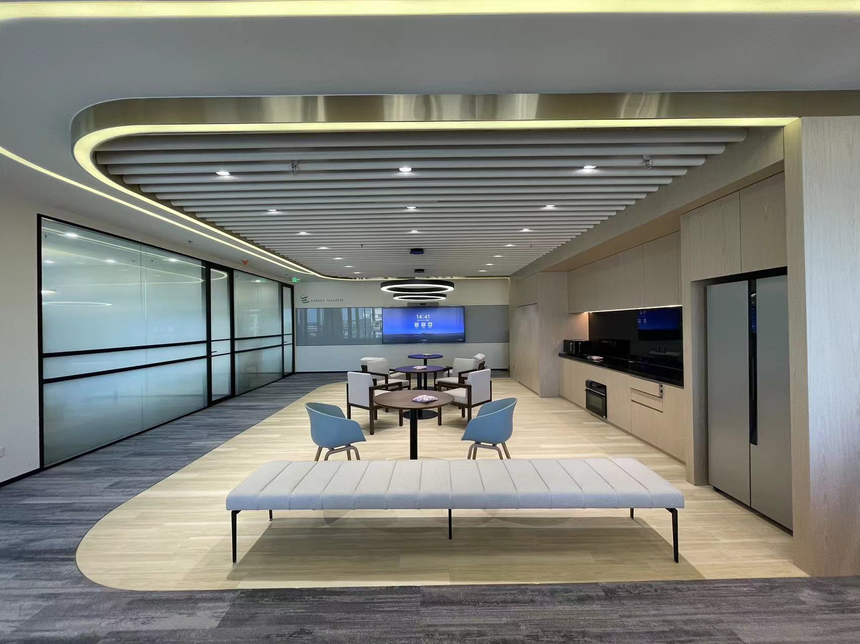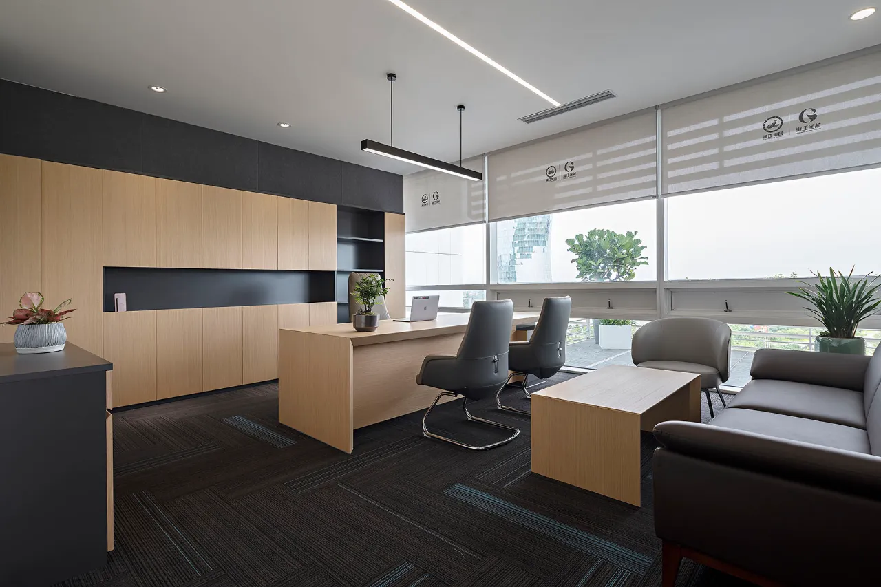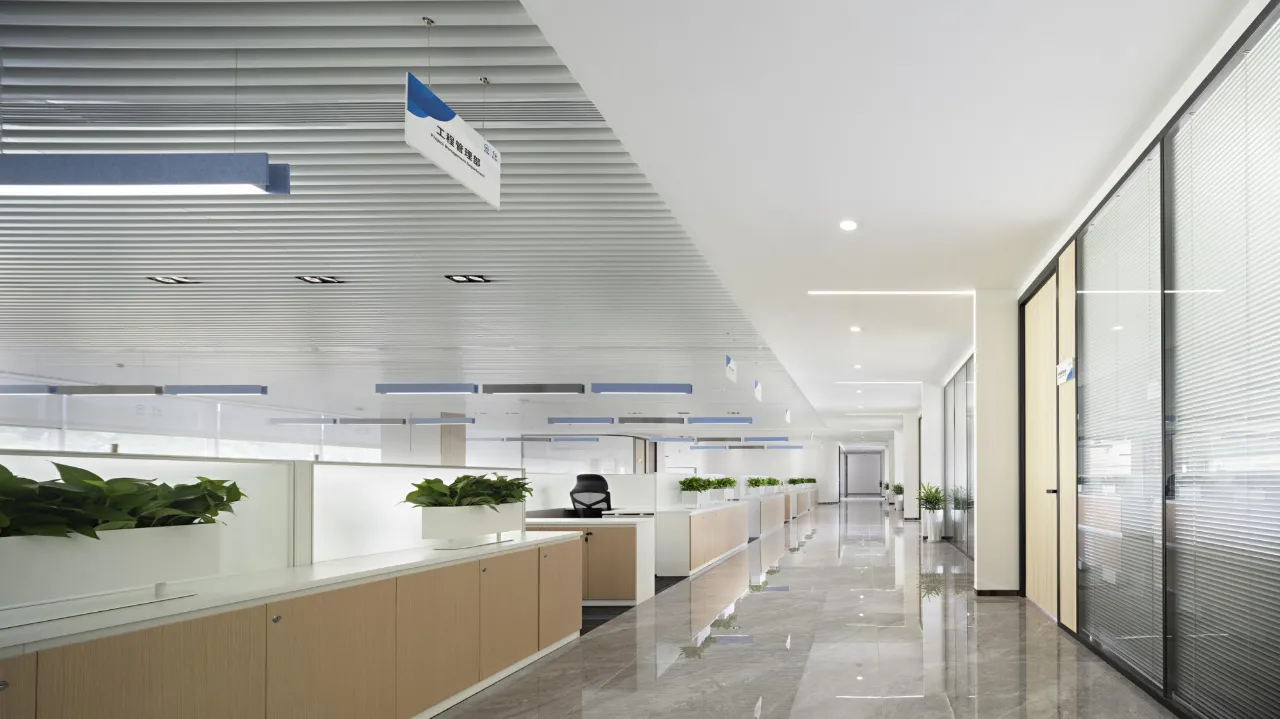浅木色办公家具和皮质班椅的搭配,让空间整体氛围更加年轻时尚。嵌入式线性灯与金属材质的运用让空间更具科技感,打破了传统国企形象给人的刻板印象,同时又平衡了稳重感与严肃性。