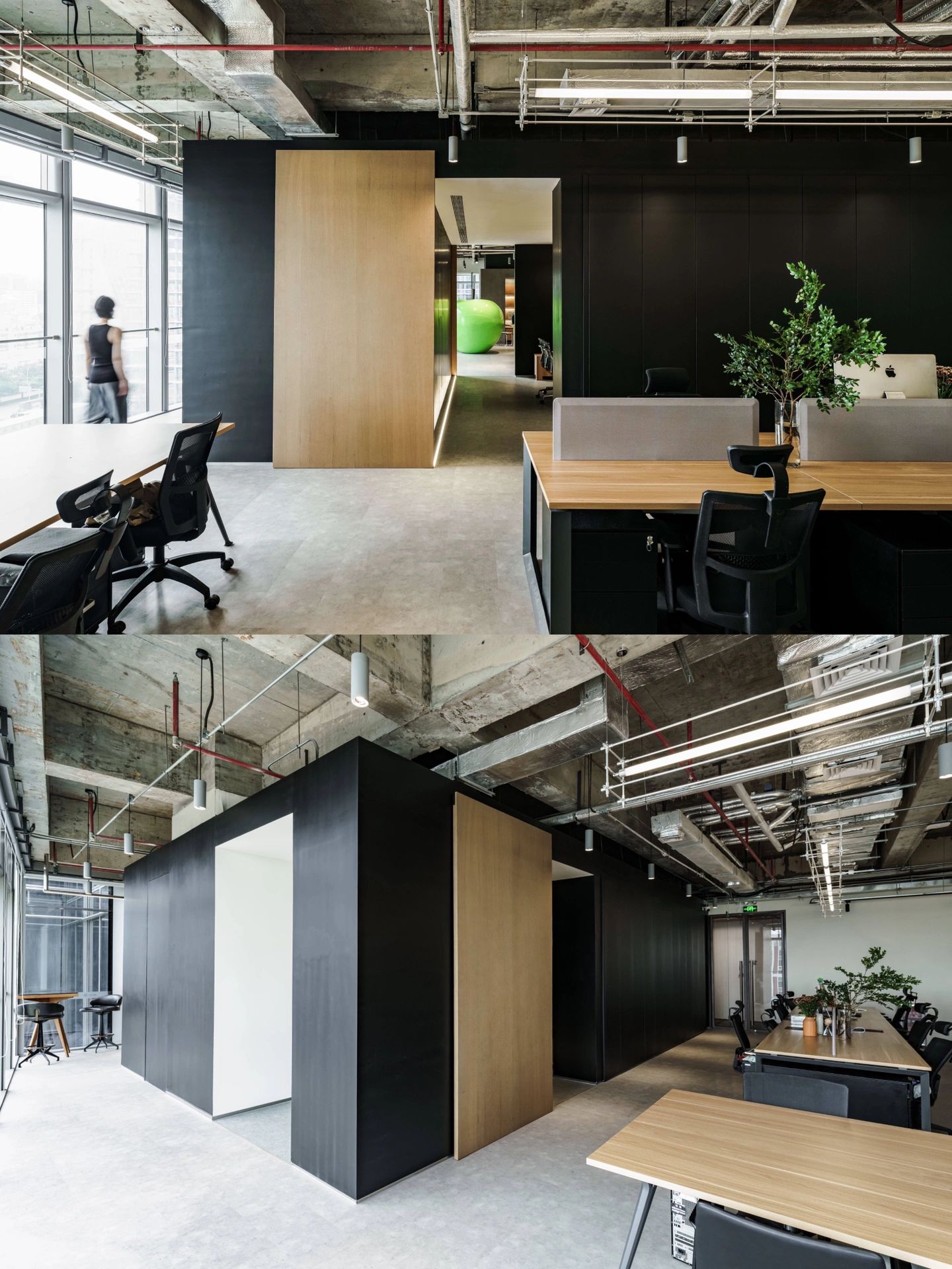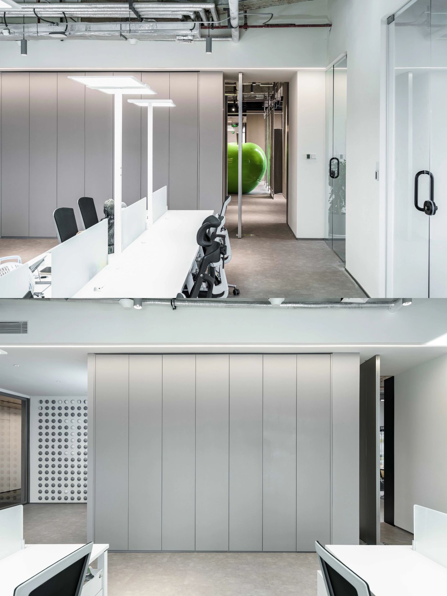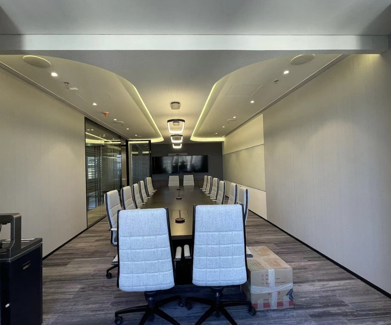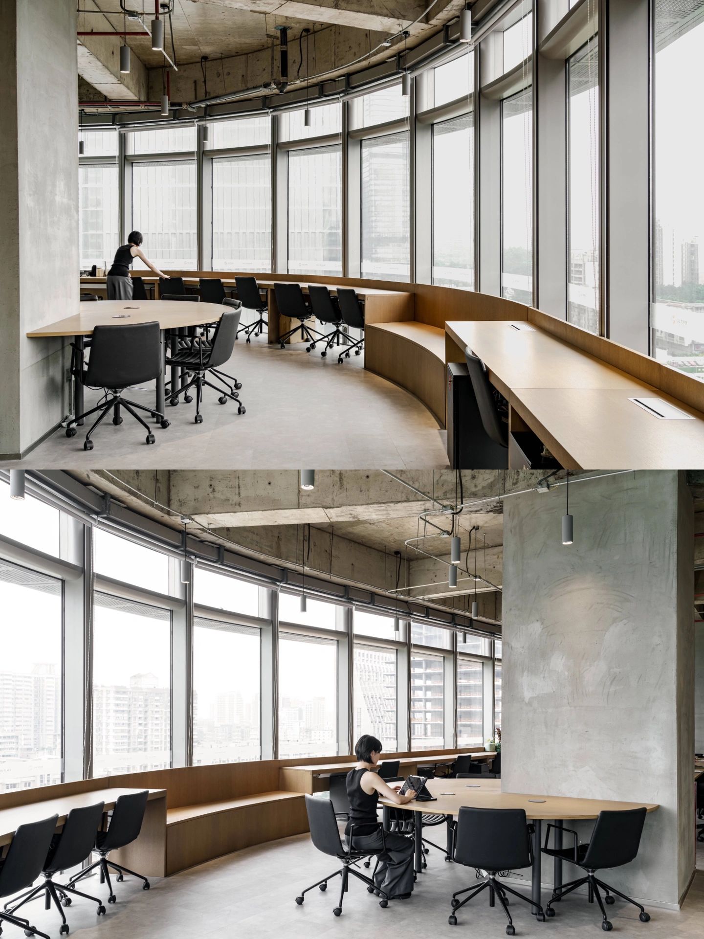 浅木色办公家具和皮质班椅的搭配,让空间整体氛围更加年轻时尚。嵌入式线性灯与金属材质的运用让空间更具科技感,打破了传统国企形象给人的刻板印象,同时又平衡了稳重感与严肃性。