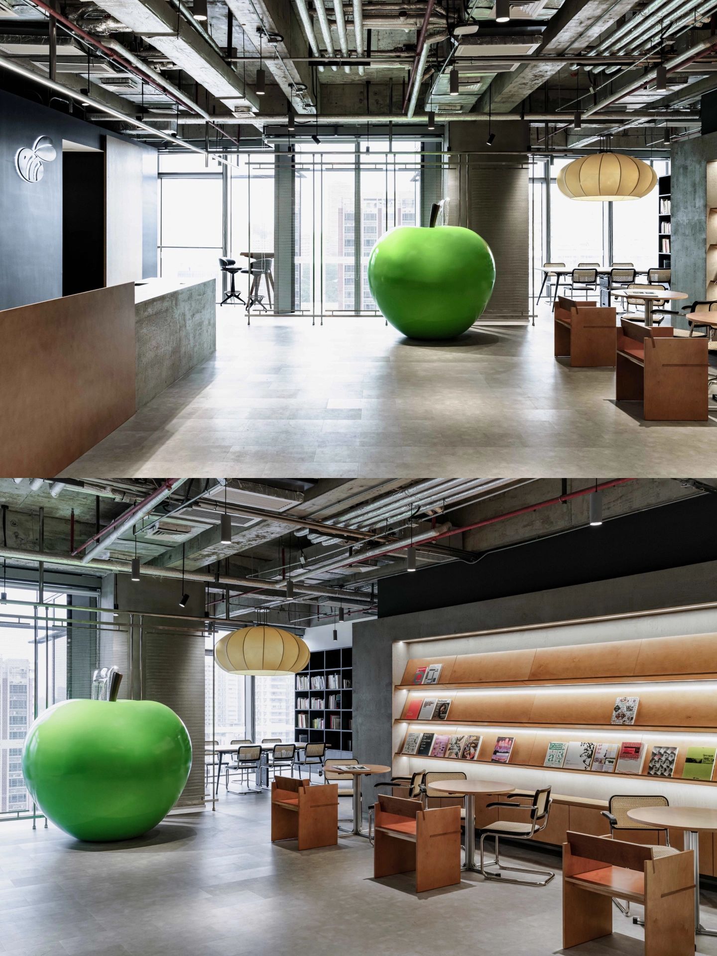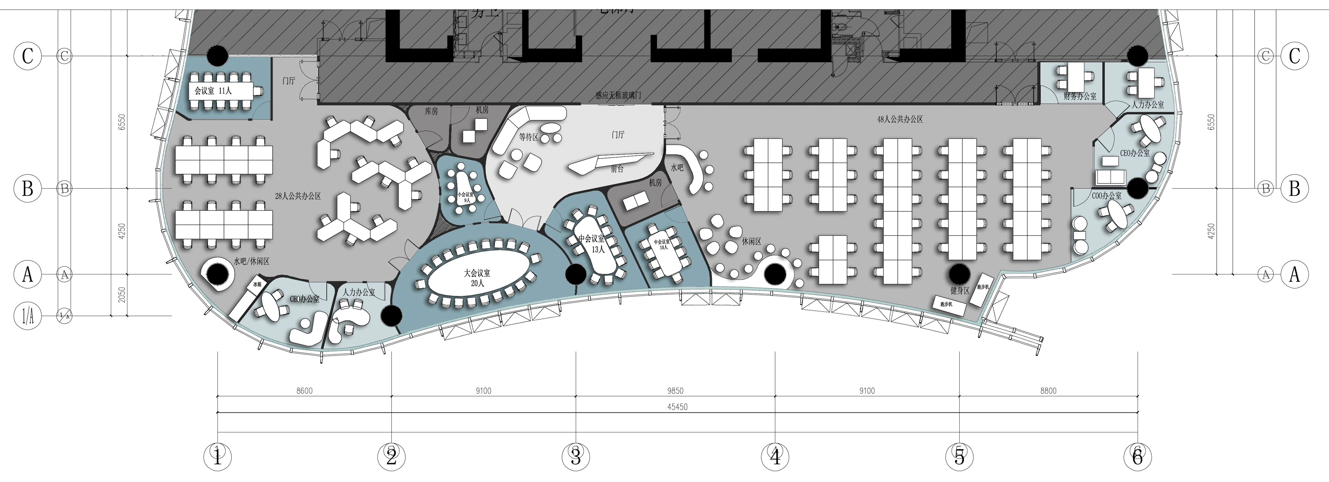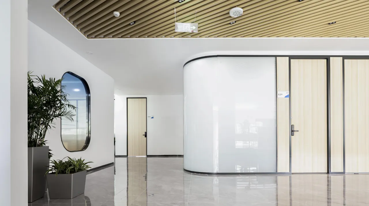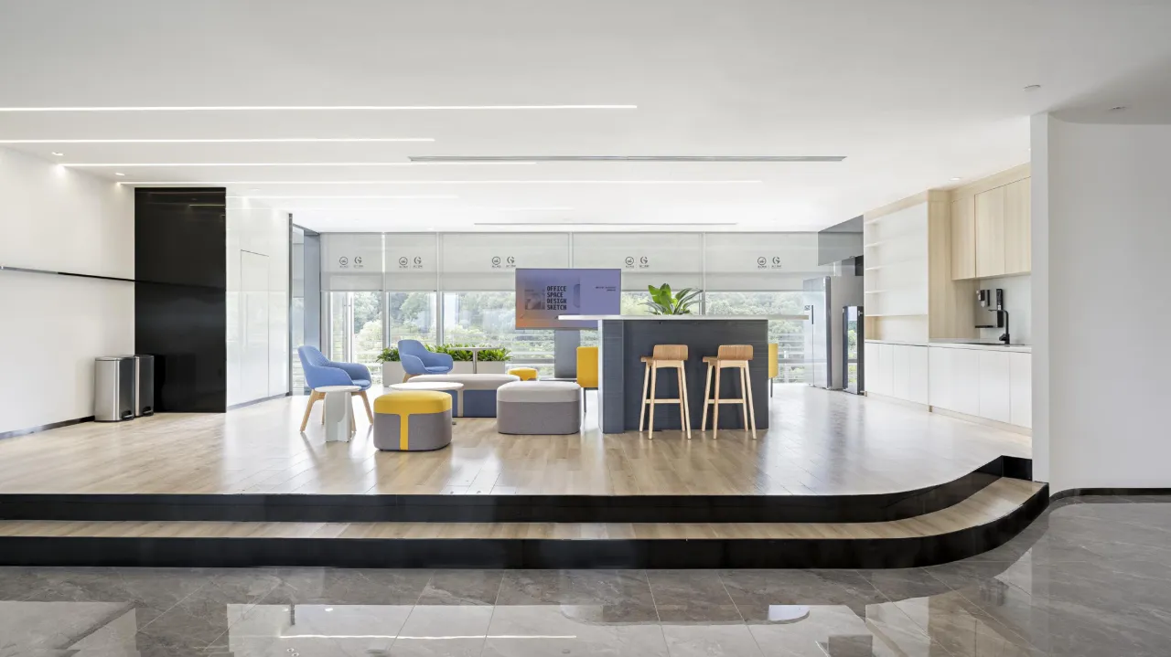 白色被称为一种设计理念,本身蕴含了丰富的可能性和容纳性。在整个项目中,白色作为主色贯穿在整个办公空间里,并通过不同机理的材质呈现。黑色和木纹作为辅助色点缀空间。弧形的跑道贯穿了整个办公空间,对比直线的硬朗,曲线本身更能体现空间的流动性和柔美性。开放的茶水间区域,整体设计与空间氛围保持一致,选取颜色亮丽的家具产品为空间增添活力。