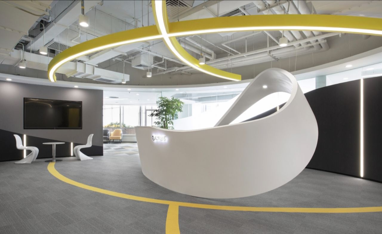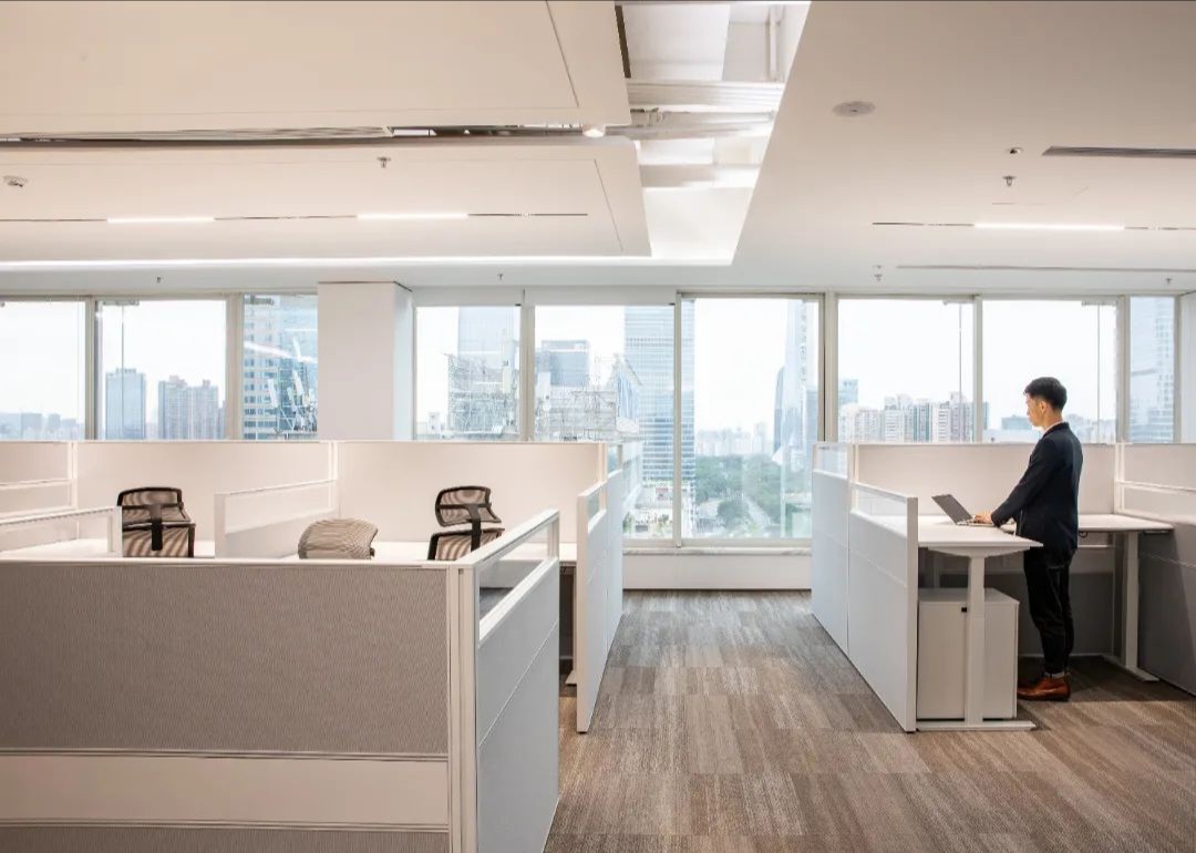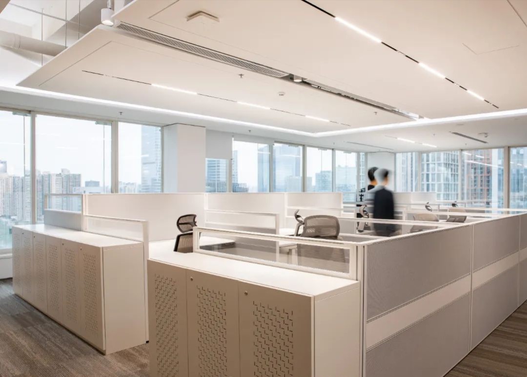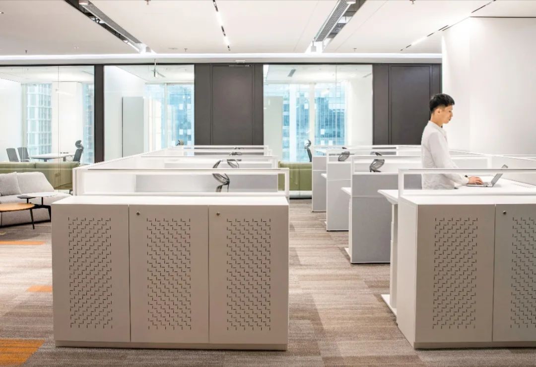 设计目标在于运用极简的设计手法,结合空间哲学及软装点缀,营造出干净优雅的工作环境。特色在于屏风办公位均利用了升降系统,文件柜均有吸音和隔音功能。会议区及管理人员办公室等外墙采用双层玻璃,专为有效的隔音和隐私而设计,以最大限度地提高集中度和工作效率。
