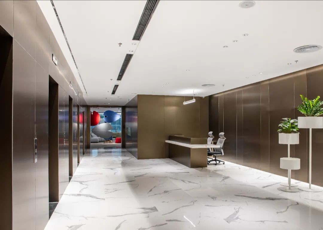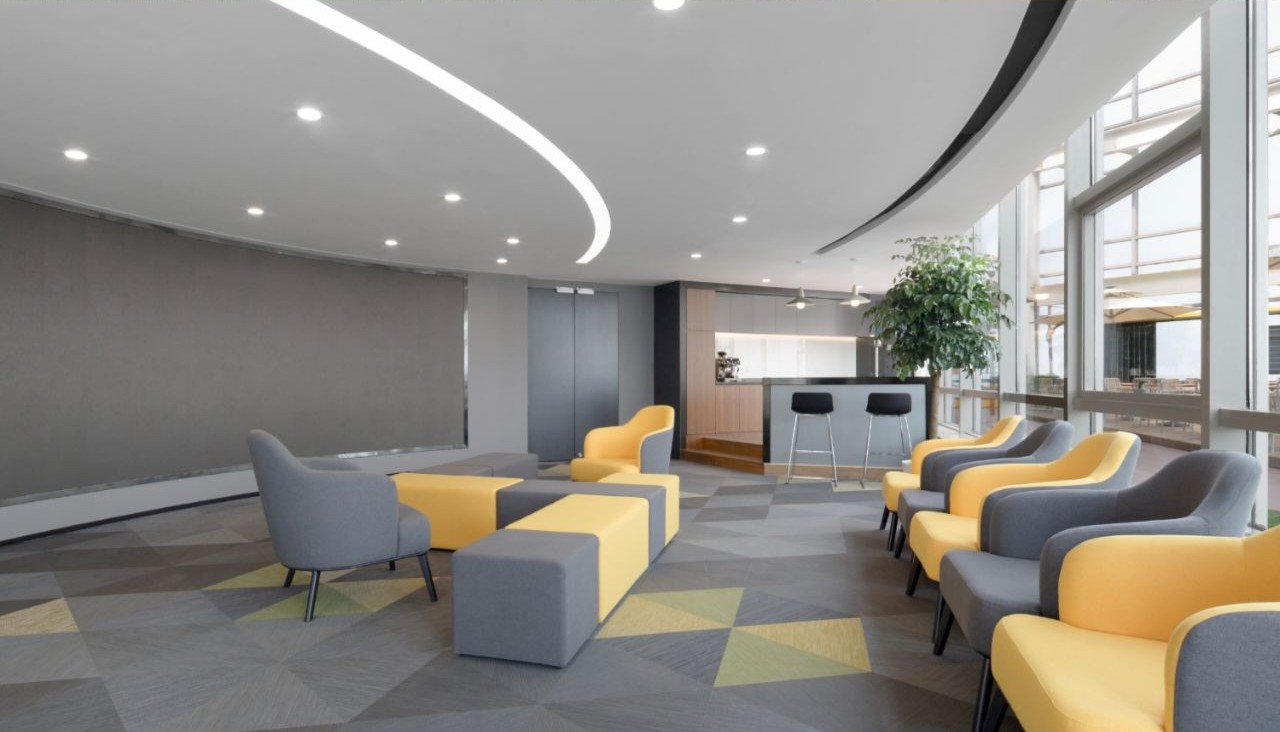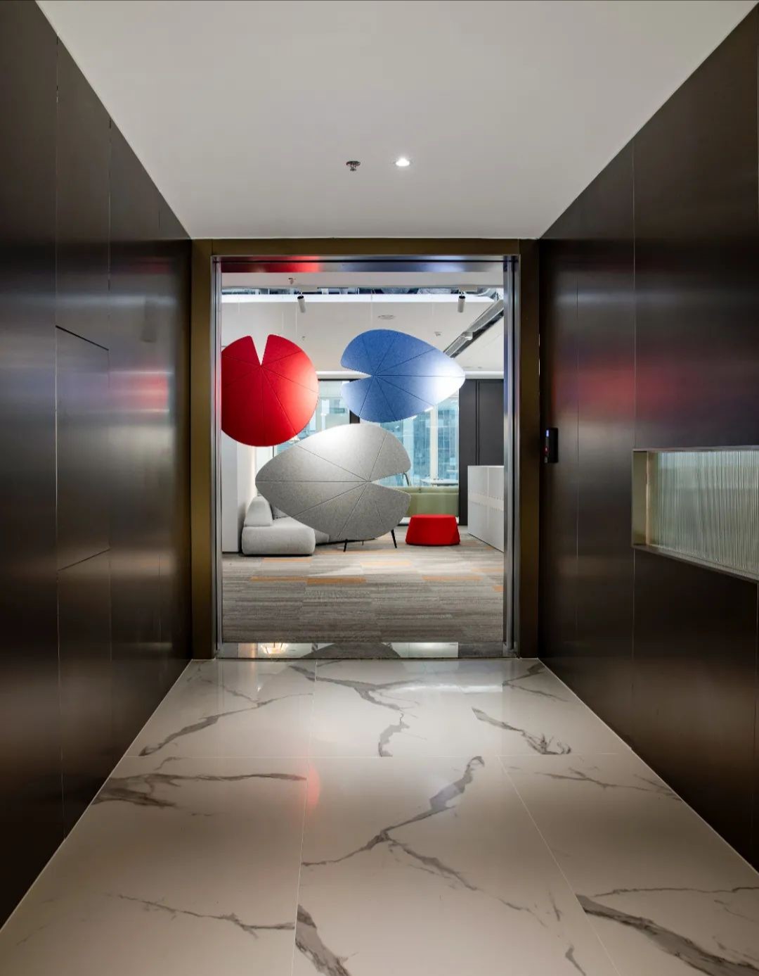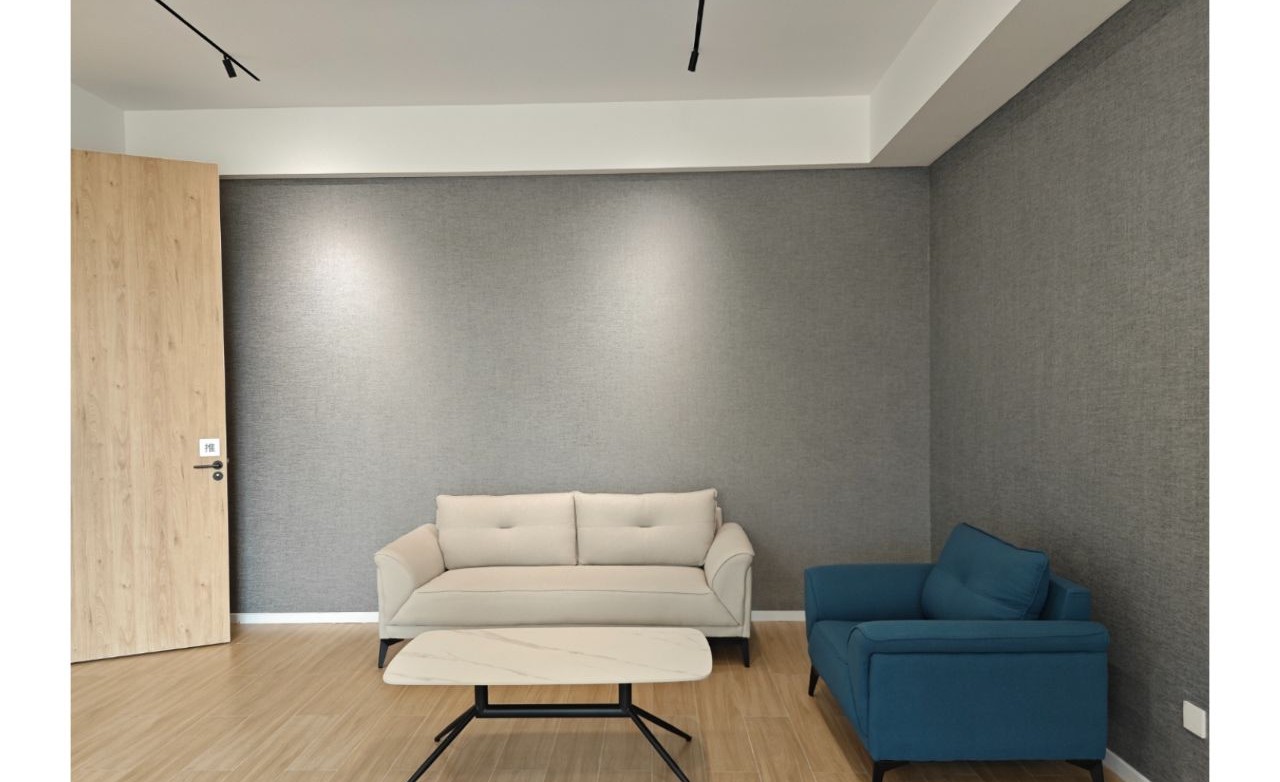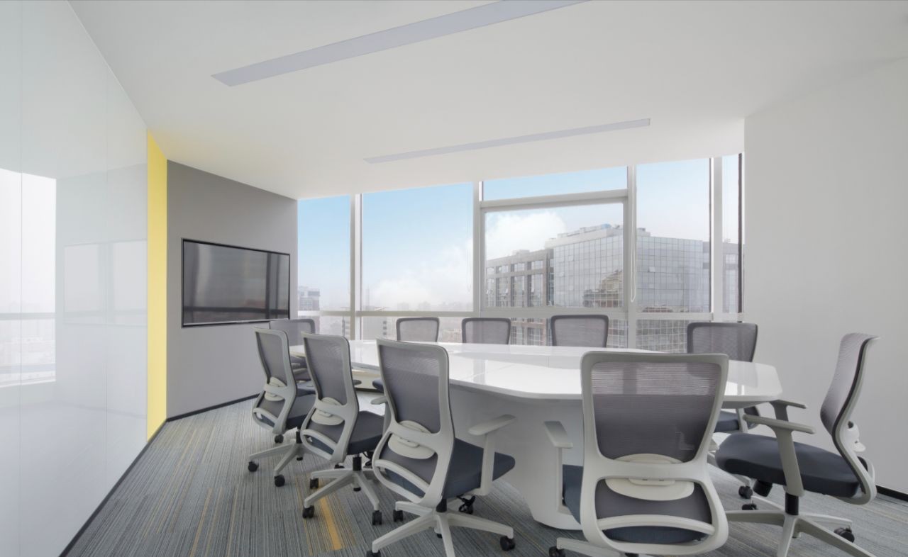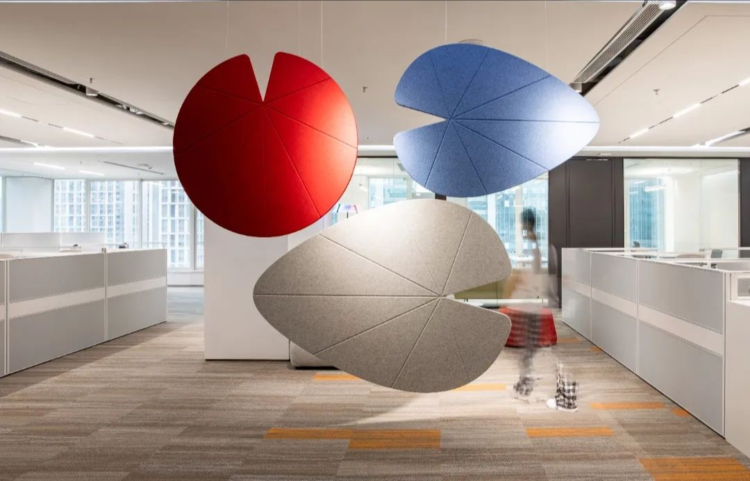 接待区作为进入办公室的第一空间,以简洁的线条和硬朗的材质为主要设计元素,打造出专业的第一感,通过灯光晕染的前厅空间亦给人冷静专注的视觉感受。入口便会看见以公司主色调的荷叶吊屏,在满足视觉隔断,分割空间等基础功能的同时,荷叶吊屏本身采用了吸音毛毡板作为内芯,能满足一定的吸音功能。