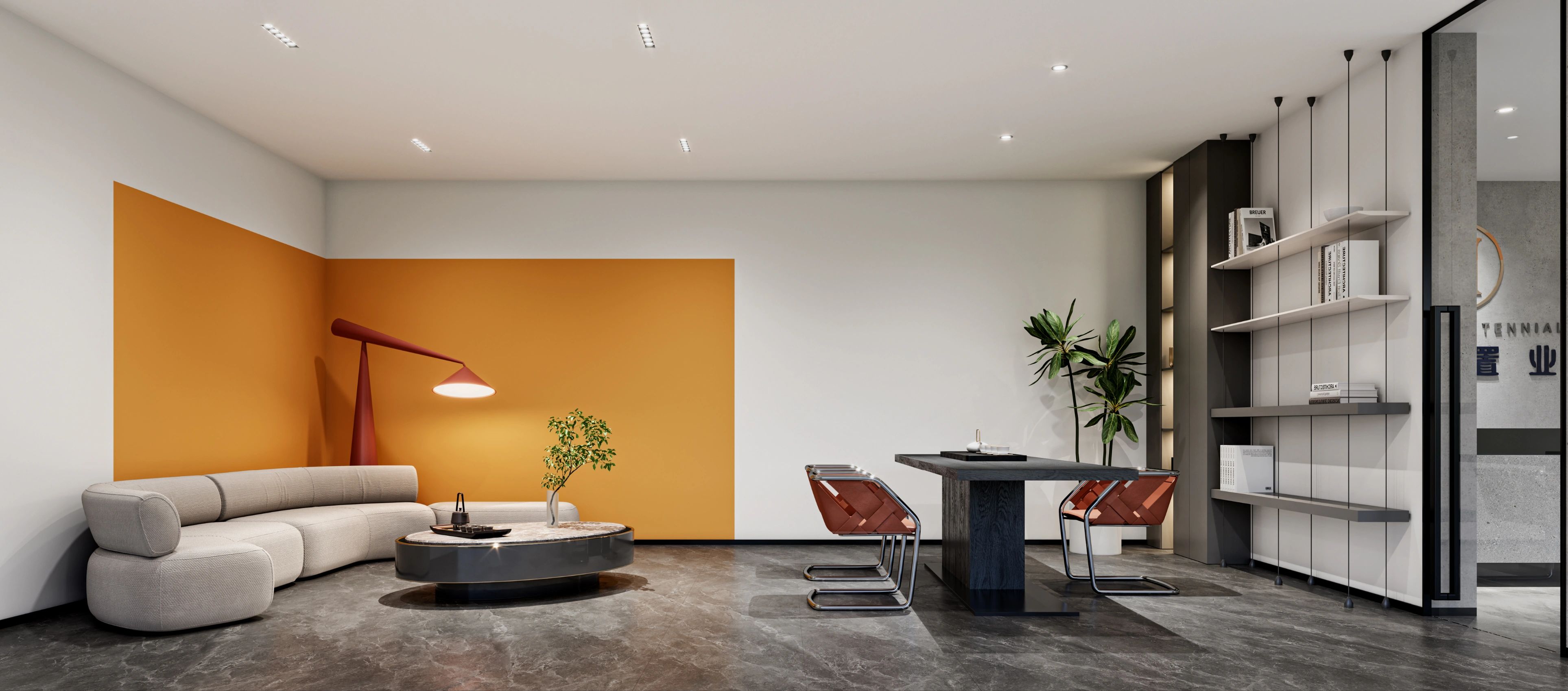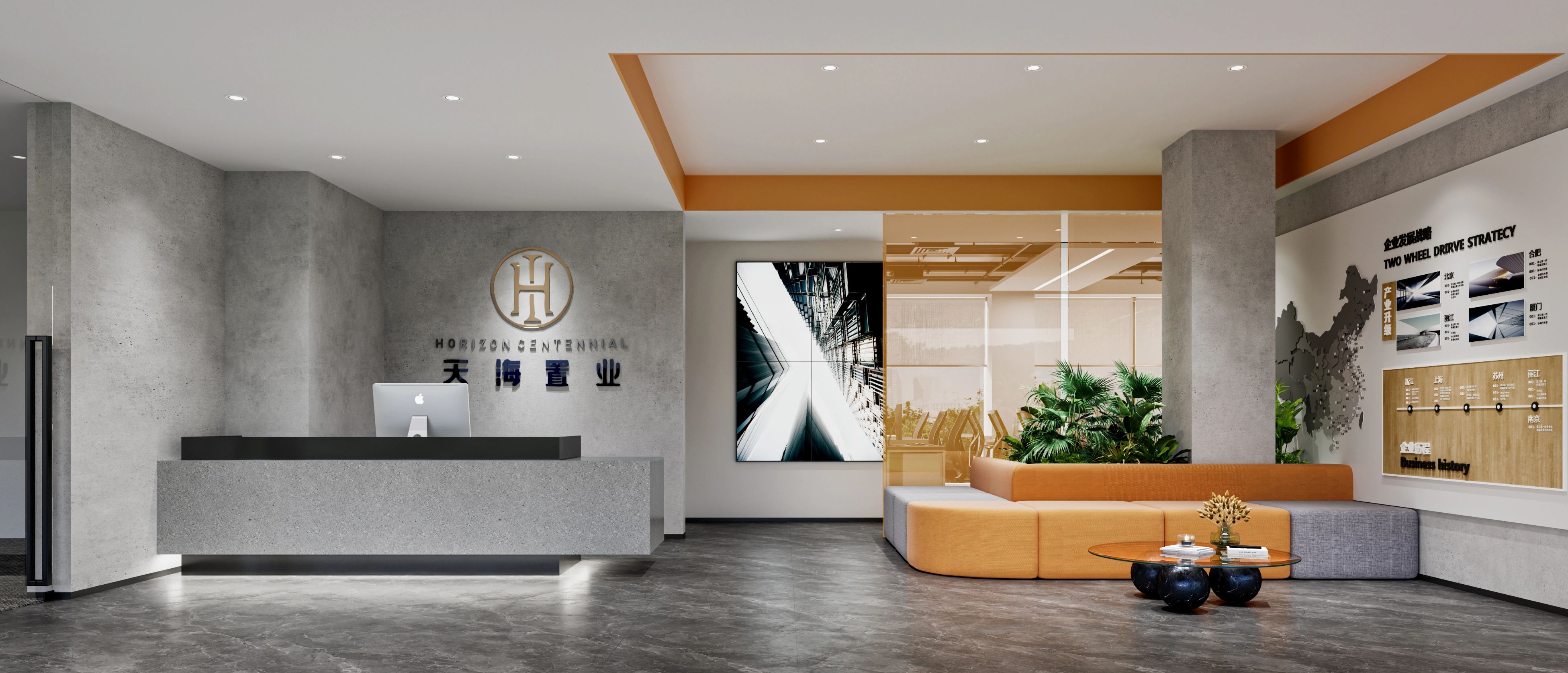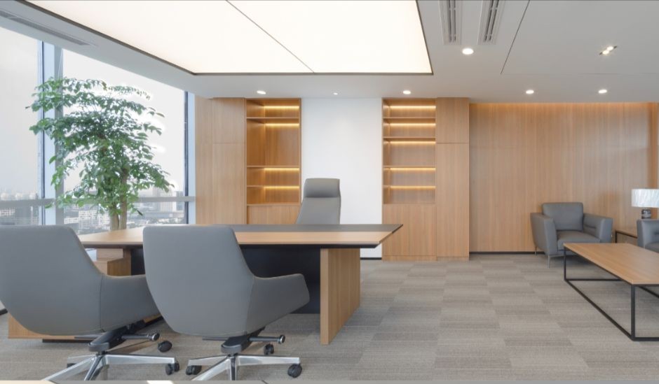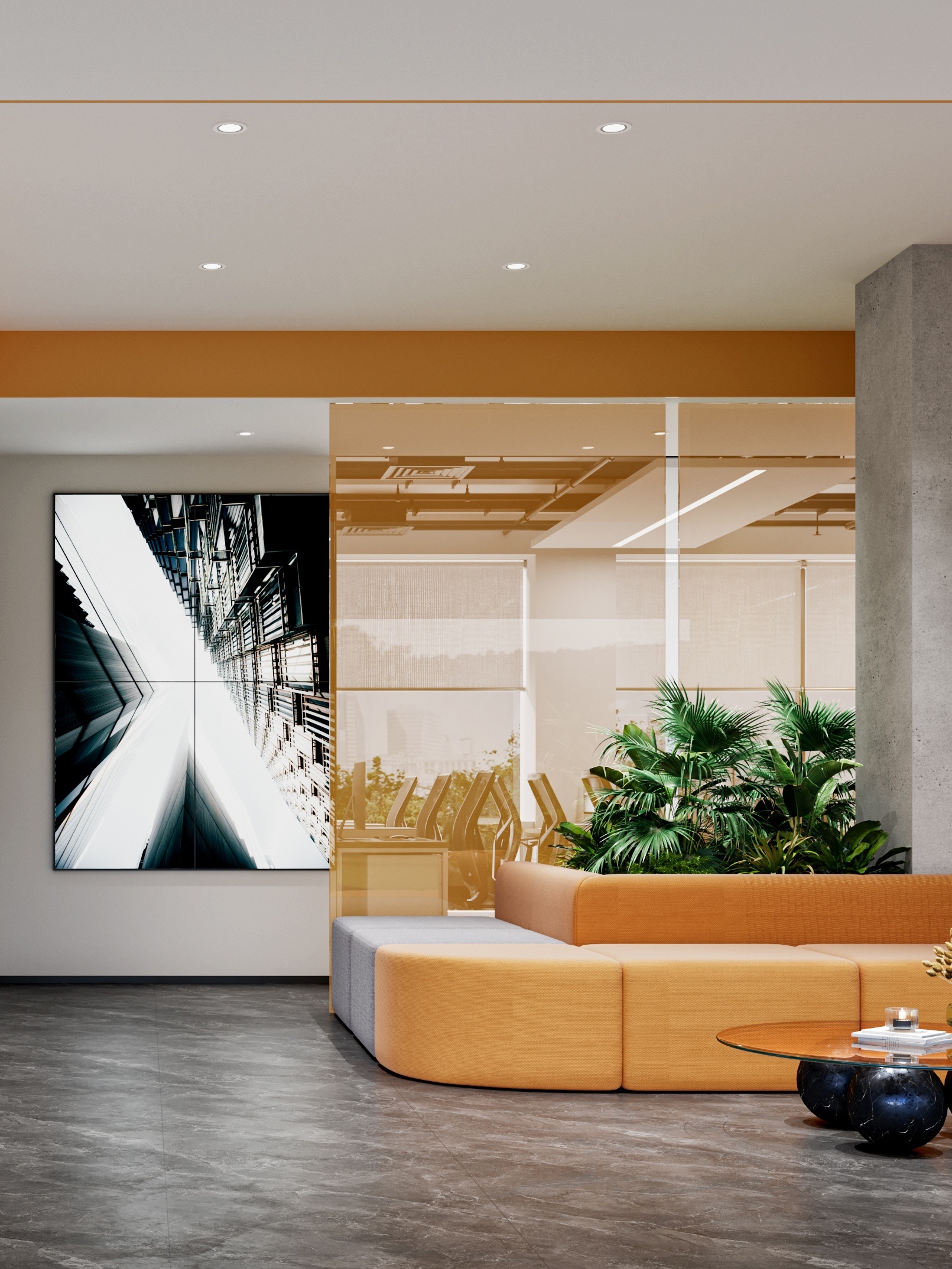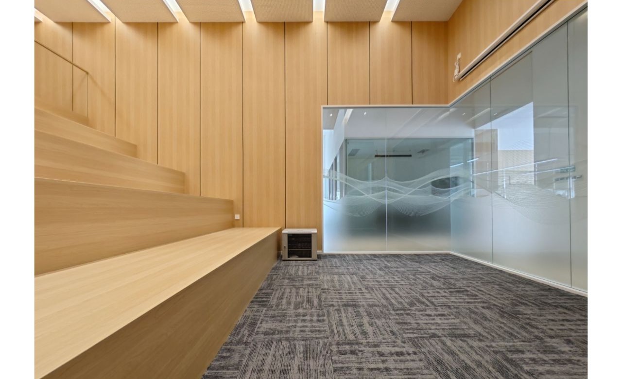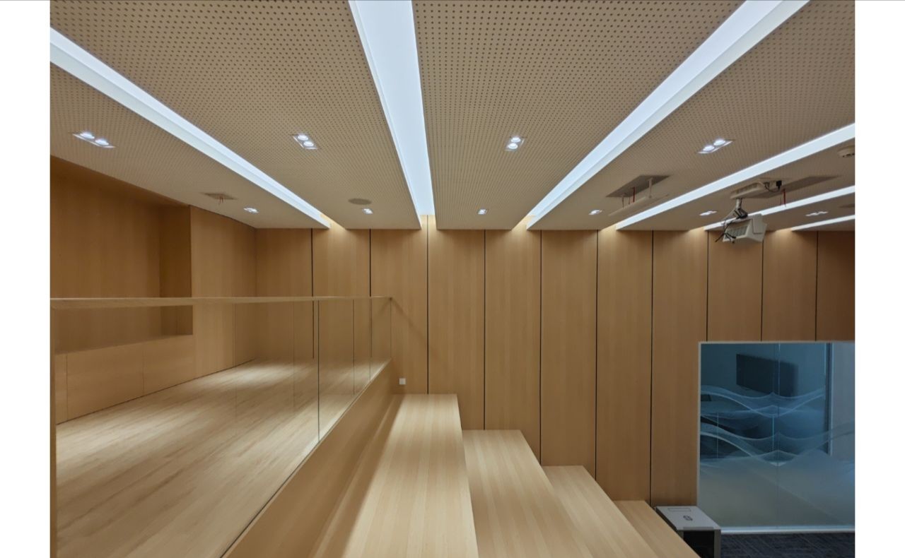 接待区作为进入办公室的第一空间,以简洁的线条和硬朗的材质为主要设计元素,打造出专业的第一感,通过灯光晕染的前厅空间亦给人冷静专注的视觉感受。入口便会看见以公司主色调的荷叶吊屏,在满足视觉隔断,分割空间等基础功能的同时,荷叶吊屏本身采用了吸音毛毡板作为内芯,能满足一定的吸音功能。