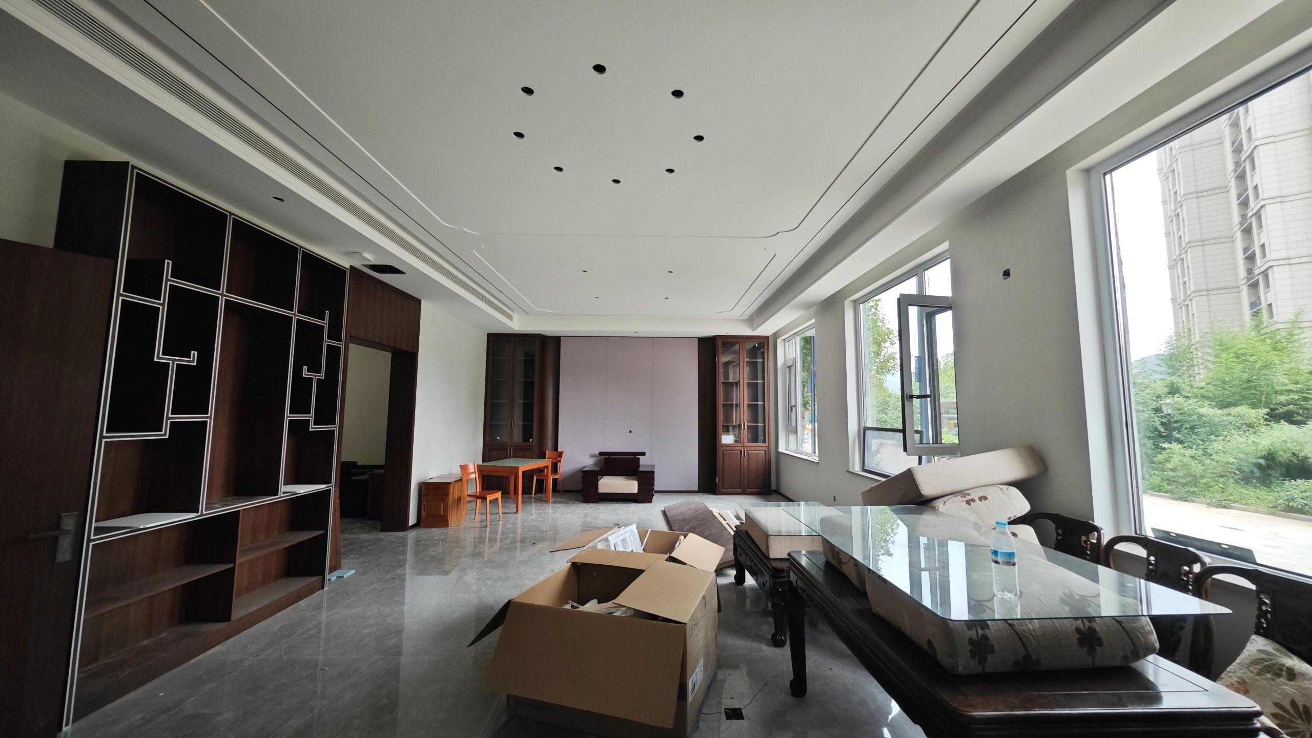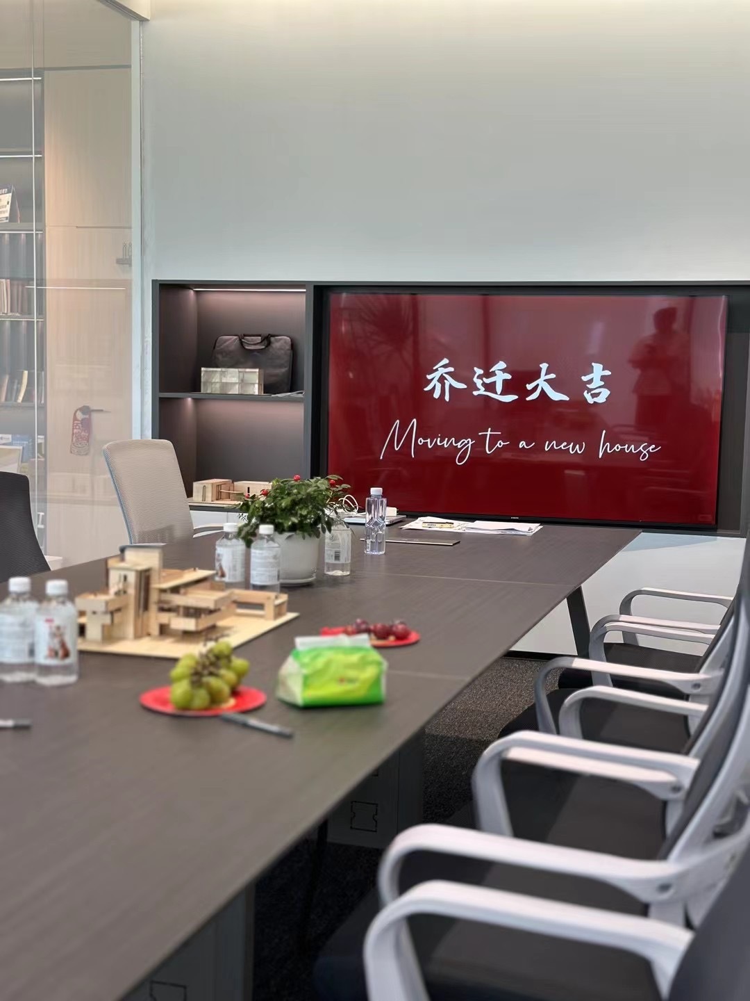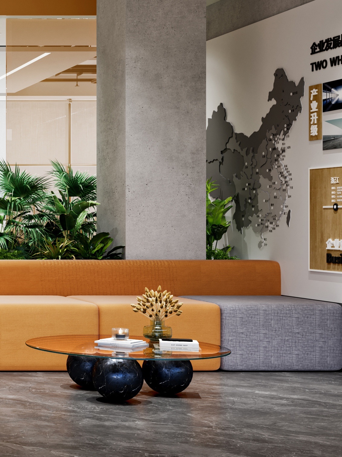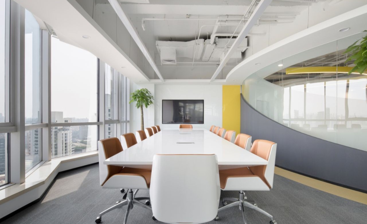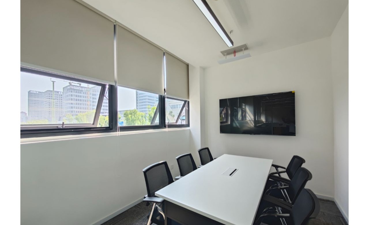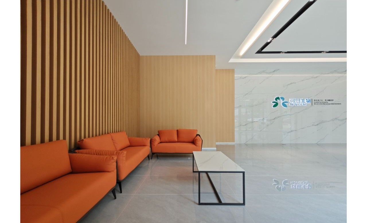 接待区作为进入办公室的第一空间,以简洁的线条和硬朗的材质为主要设计元素,打造出专业的第一感,通过灯光晕染的前厅空间亦给人冷静专注的视觉感受。入口便会看见以公司主色调的荷叶吊屏,在满足视觉隔断,分割空间等基础功能的同时,荷叶吊屏本身采用了吸音毛毡板作为内芯,能满足一定的吸音功能。