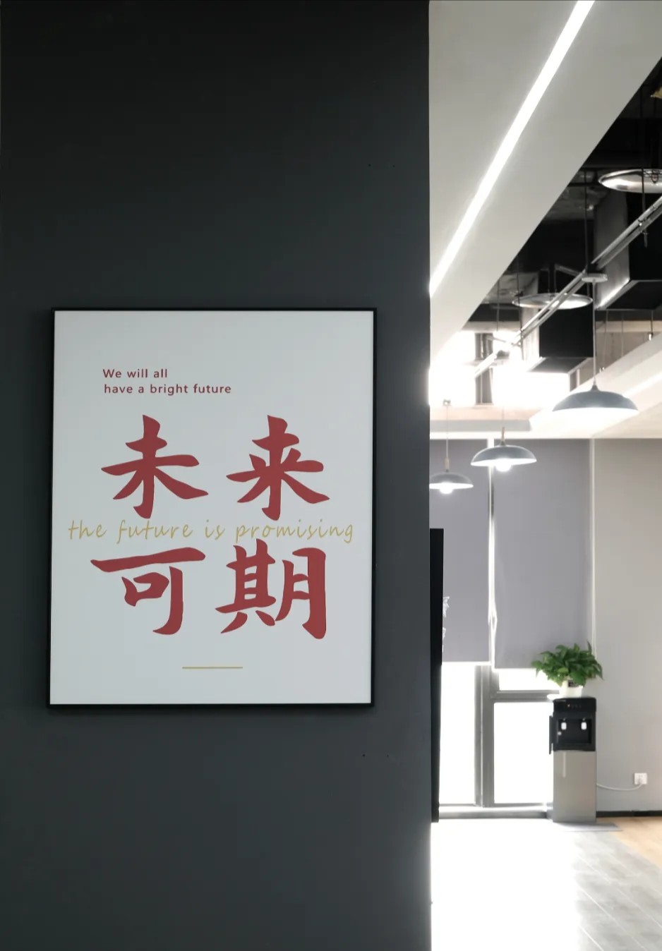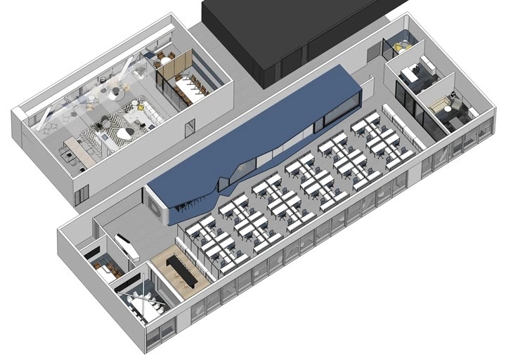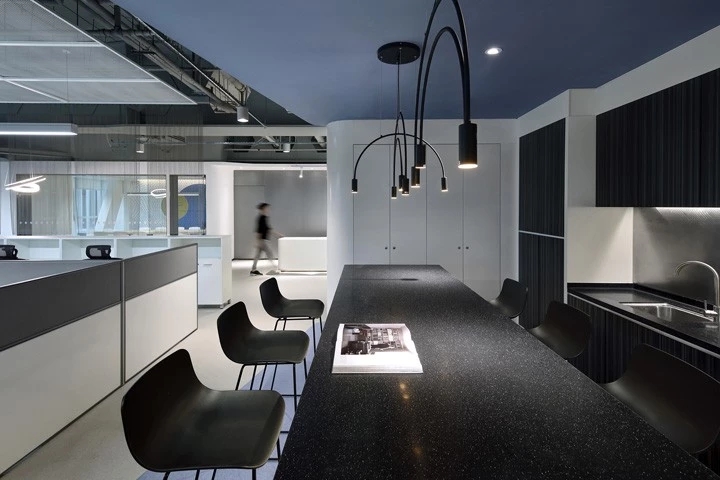 企业前区,黑白的运用,呈现给客户务实的科技企业不带有明显的感情色彩。氧化铝板和简洁的灰色PVC地垫同时表现科技公司高效利落,可变的电子屏寓意开发领域的无限可能性。进门的巨大发光logo,宛如数据传播的隧道,让人印象深刻。同时强化“粒子系统”所代表的前沿科技、多元及包容并蓄的文化。并使之更加的有话题性,以其达到深入内心的作用,提高公司的文化凝聚力。