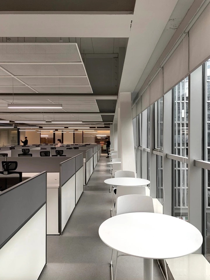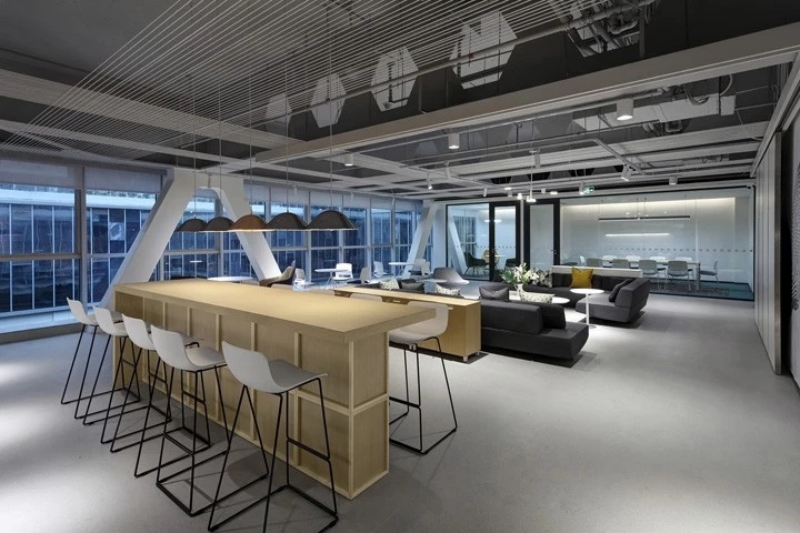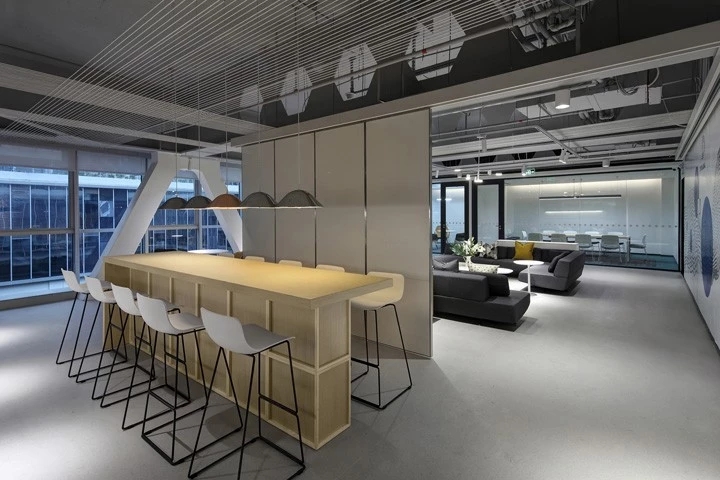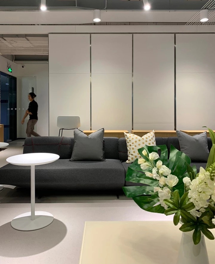 休闲区的设定为“家庭式”“温馨化”与办公区形成强烈的对比,割裂开两种氛围,提倡工作之余尽情休闲。当然,在功能上不能缺少实用性,亦不能单一化。一排移动屏风,可以分隔出两片天地。屏风上亦可以写字涂鸦等,聚会/派对都具备很好的物理条件。