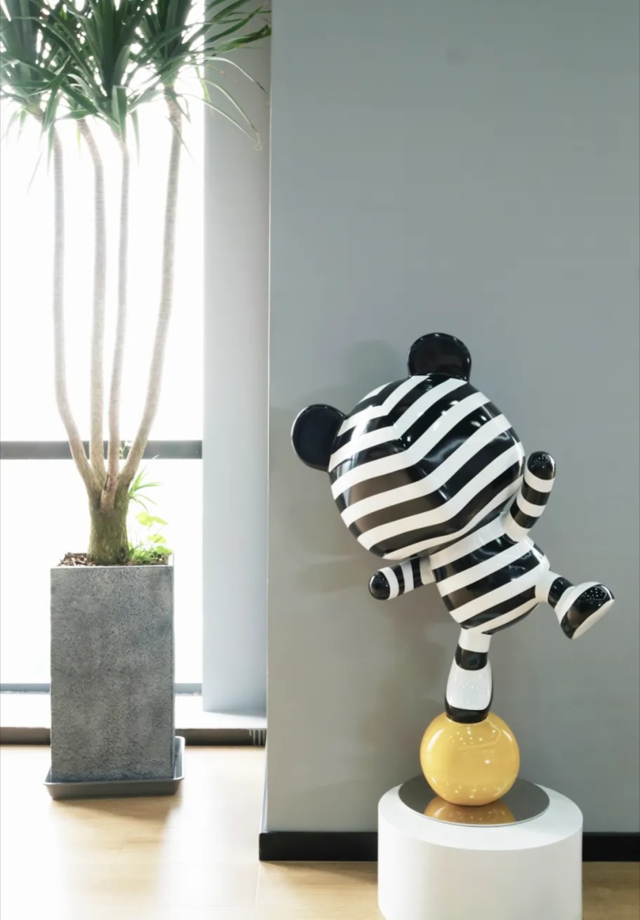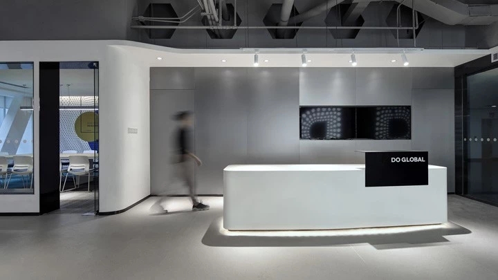 进入公司首先是一道不规则的切角墙面构造出仿佛科幻场景的前厅区域,来访者映入眼帘的是一个放置公司做塑造过动画形象公仔展示柜和一个屏幕播放制作的影视作品,右手边是前台区域, 犹如钻石切割形状、金属质感的波浪板、黑色镜面烤漆玻璃等塑造的形象墙与LOGO字体的元素呼应起来。