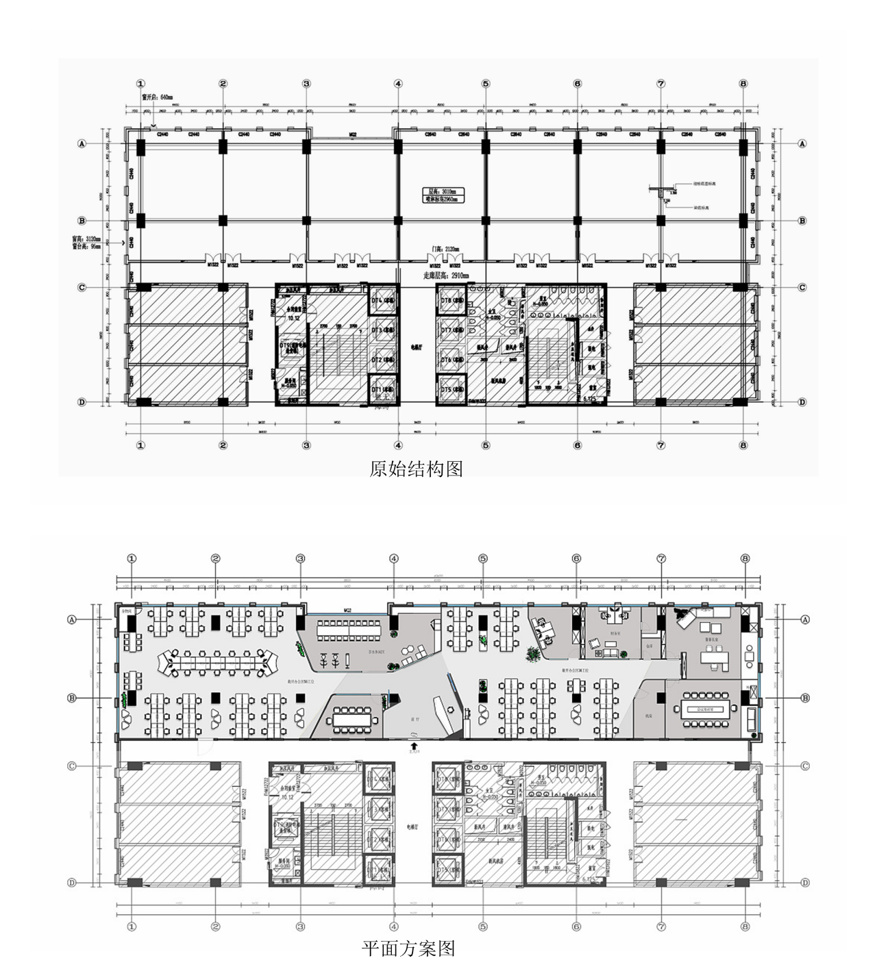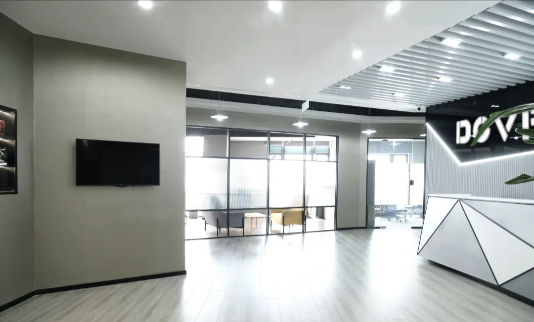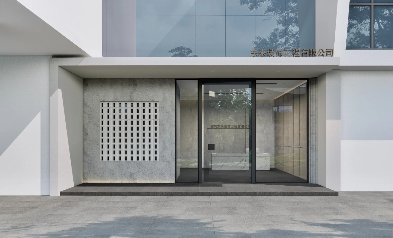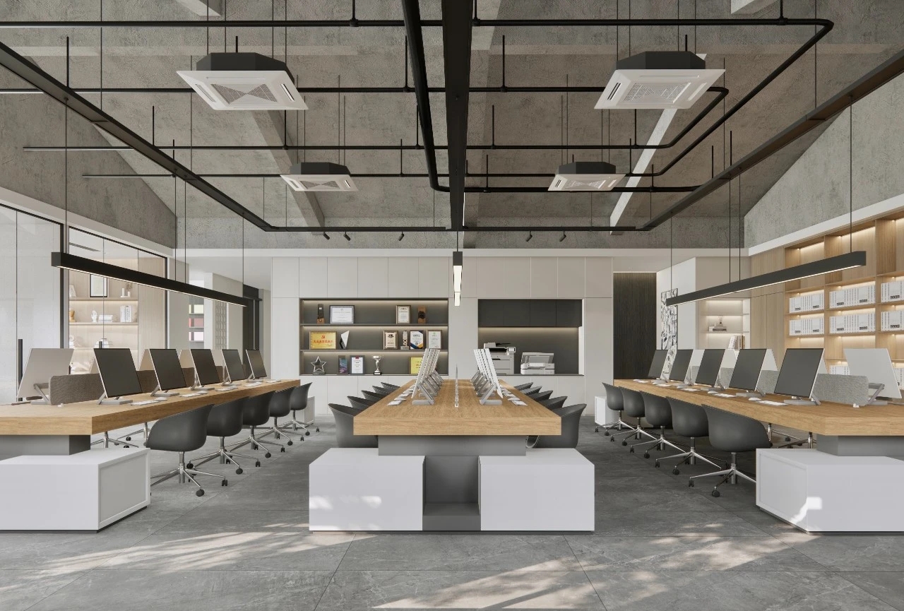室内建筑是由6个隔间打通隔墙成一体,空间规划将大门放在公司中线位置,出入便利且根据了公司人员部门设置南北区。而整个布局动线和立面装饰风格提取了企业logo的切角元素、以及黑白灰配色系统。将正面和前台背景都做成斜面,增加了展示长度,让空间更为大气和灵动。