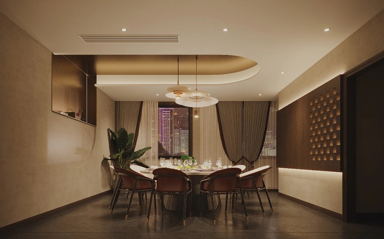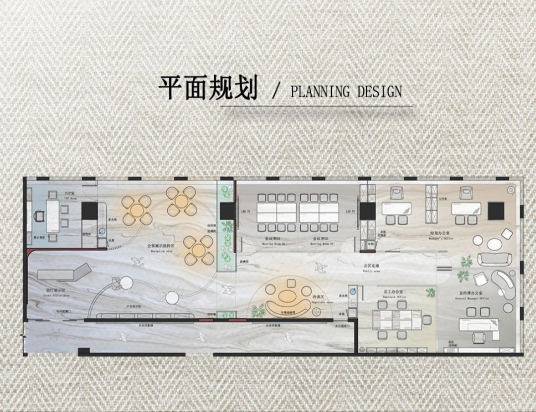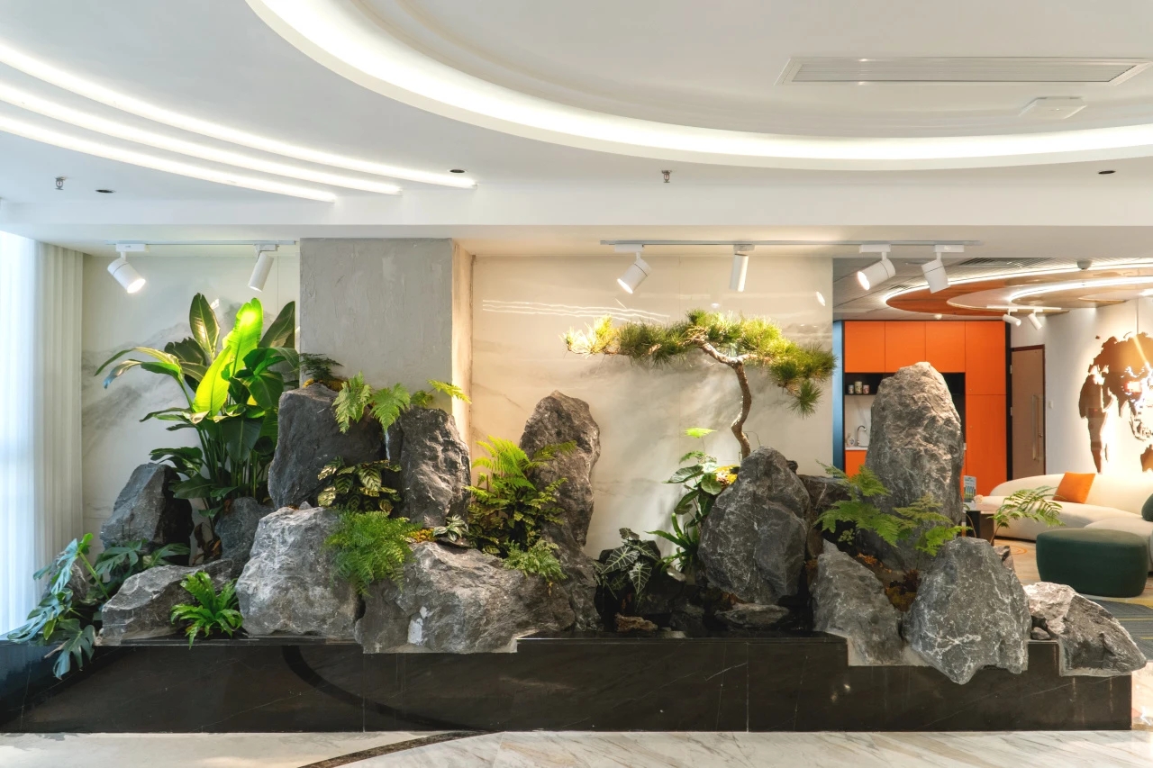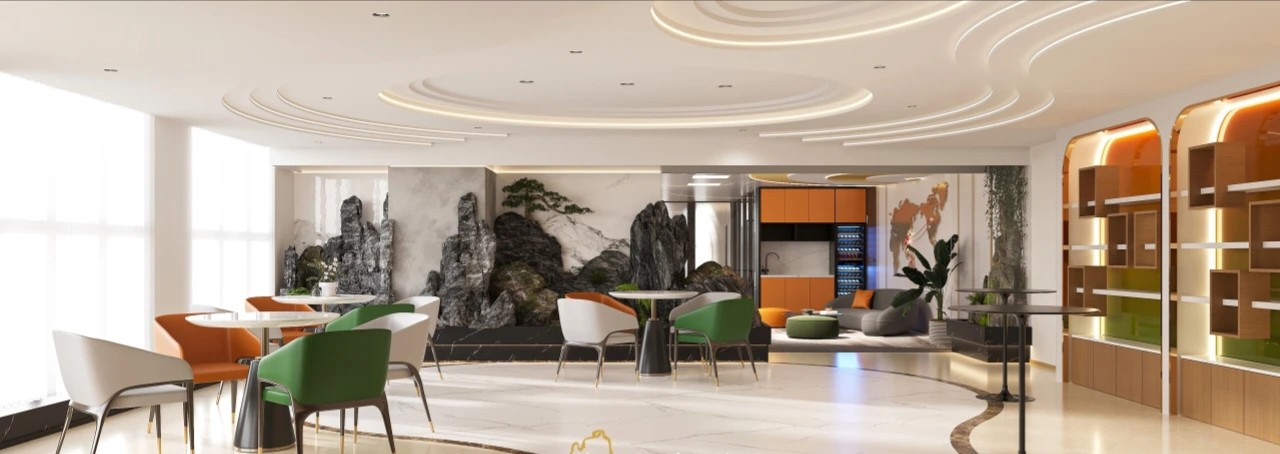 前厅与会客区域的天花椭圆波纹造型意境悠远,植物造景设计上的烟雾时而波涛起伏,大气磅礴,时而微波荡漾,岁月静好。
