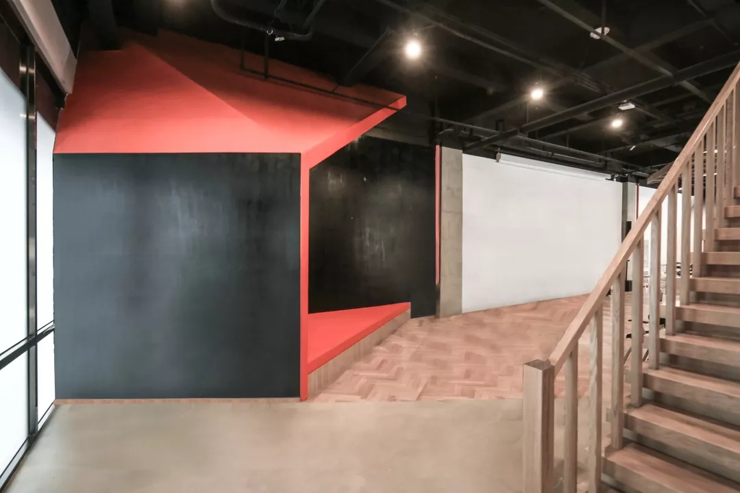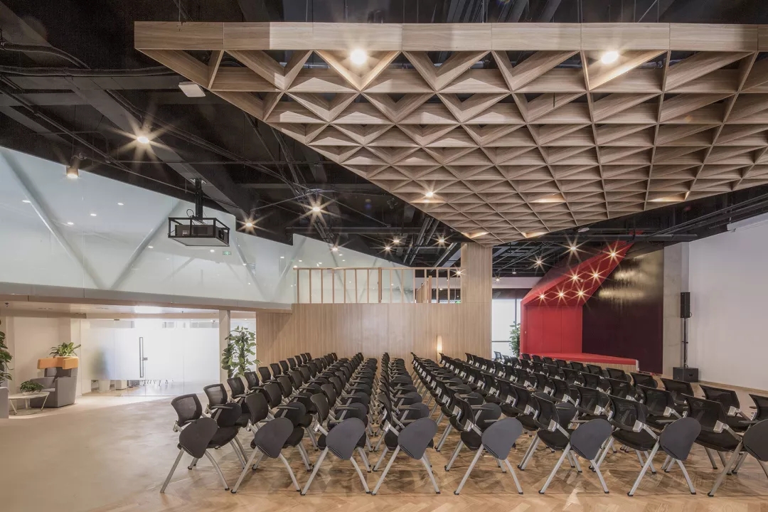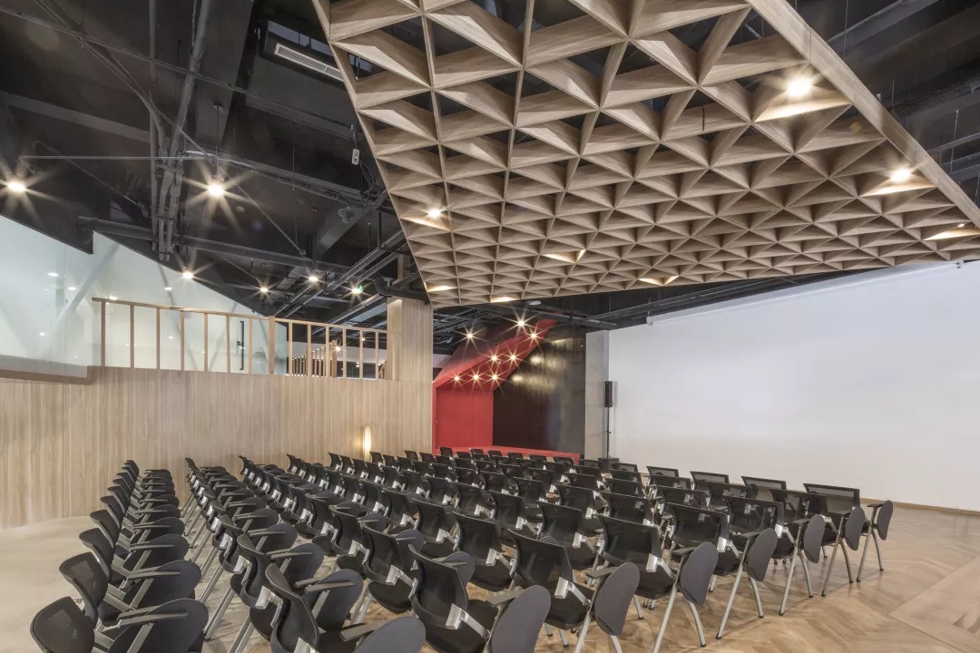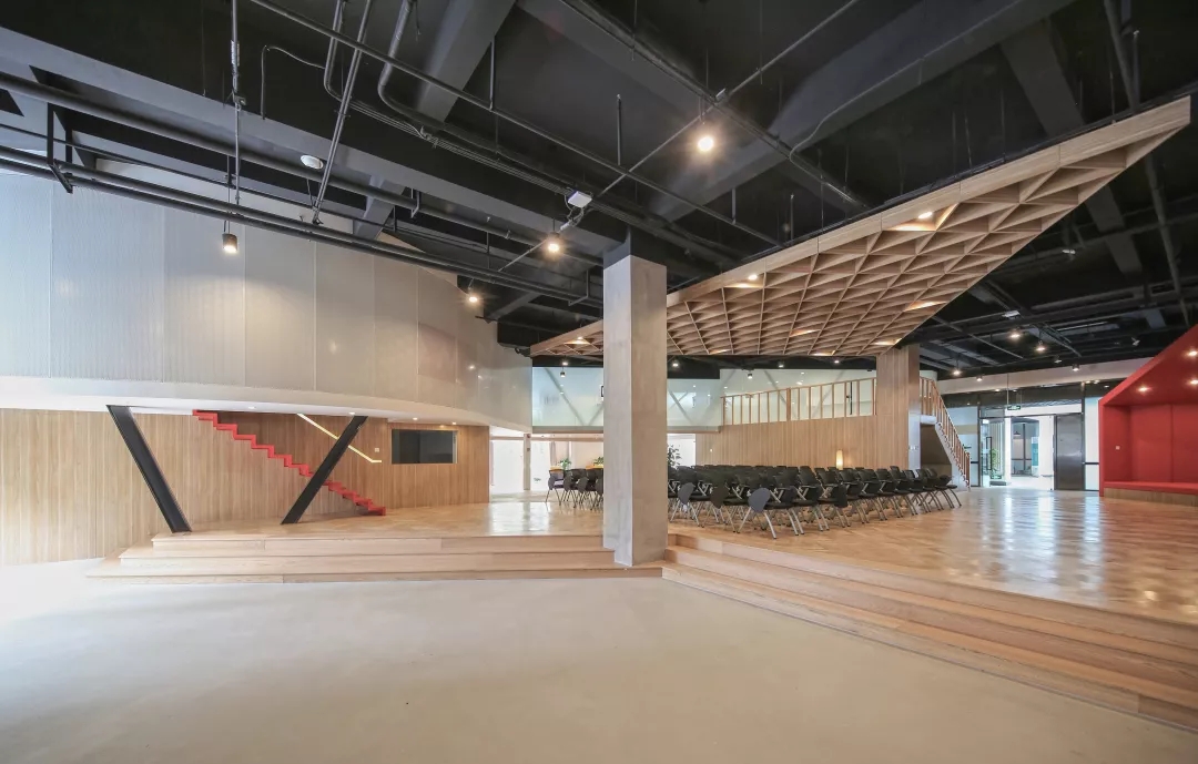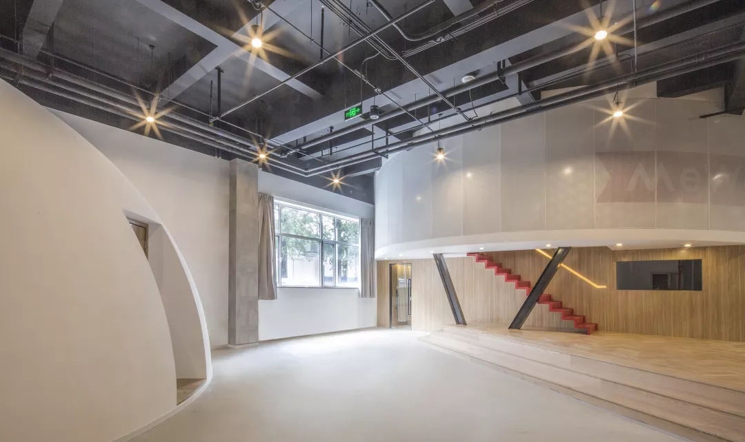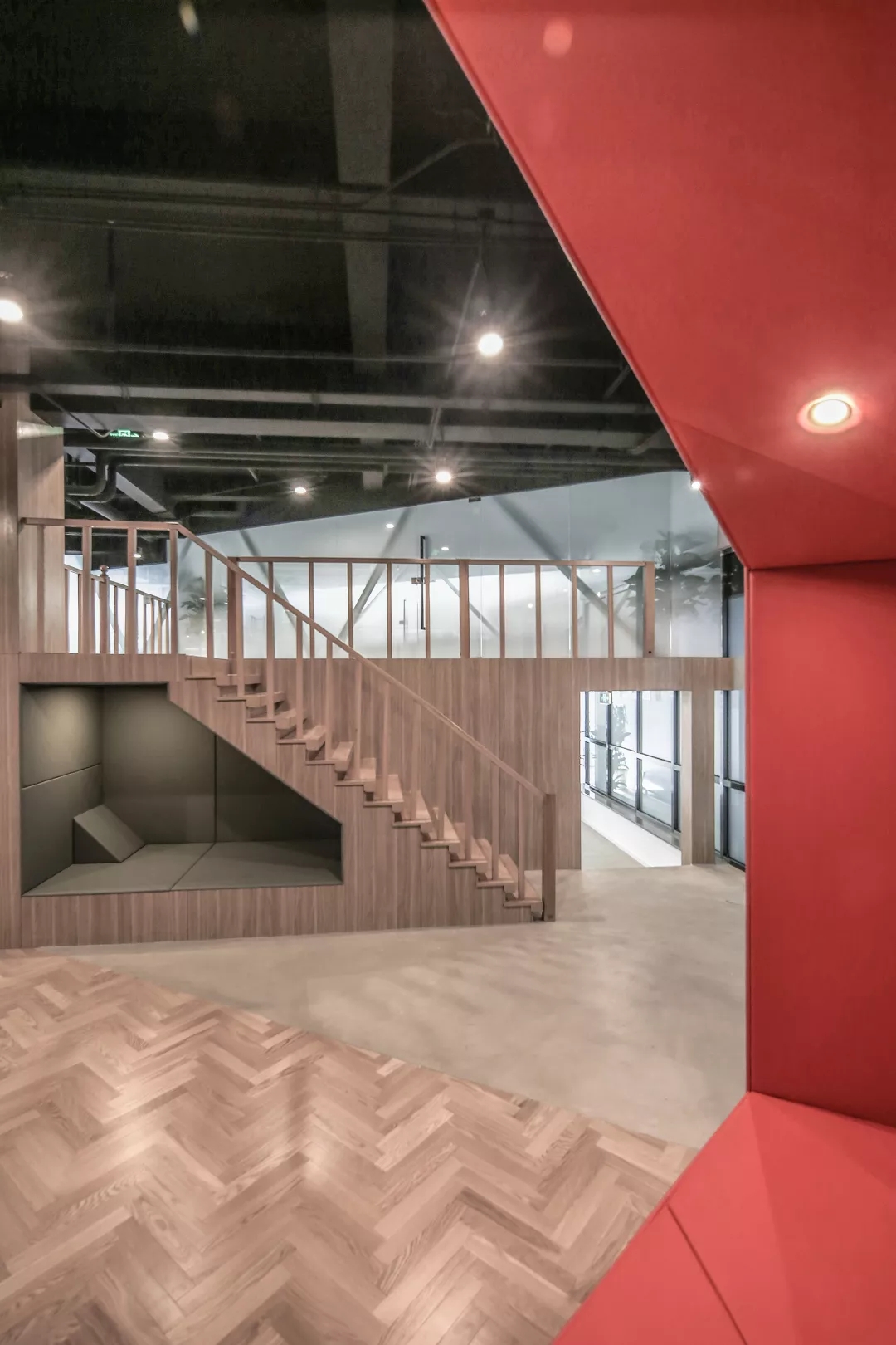 建筑师尝试创造一些对比剧烈并带有冲突性的空间。室内有非常多的空间挤压成非常小的角落,也有肆无忌惮地释放成特别开敞的广场,如下沉的部分是一个大型的集散广场的空间概念。大家可以随意坐在前面的台阶,就像一个开放的公共广场上进行交流的场景。从广场旁的球形的冥想室对面楼梯,到达一个长条形的悬挑,进入一个连廊转换到特别狭小的空间里,是二楼的一个小型和式榻榻米区,工作人员可以完全把房间封闭起来,在宁静空间当中进行自我的沉浸式思考。