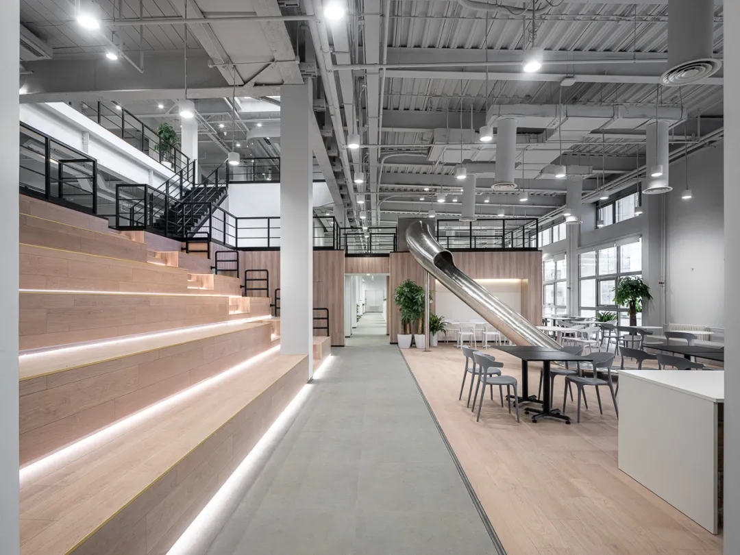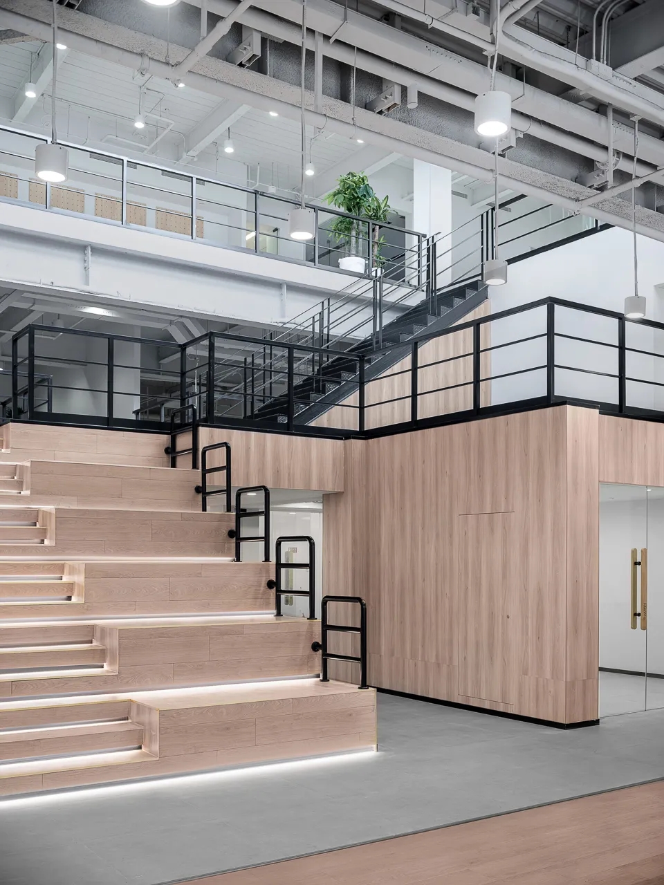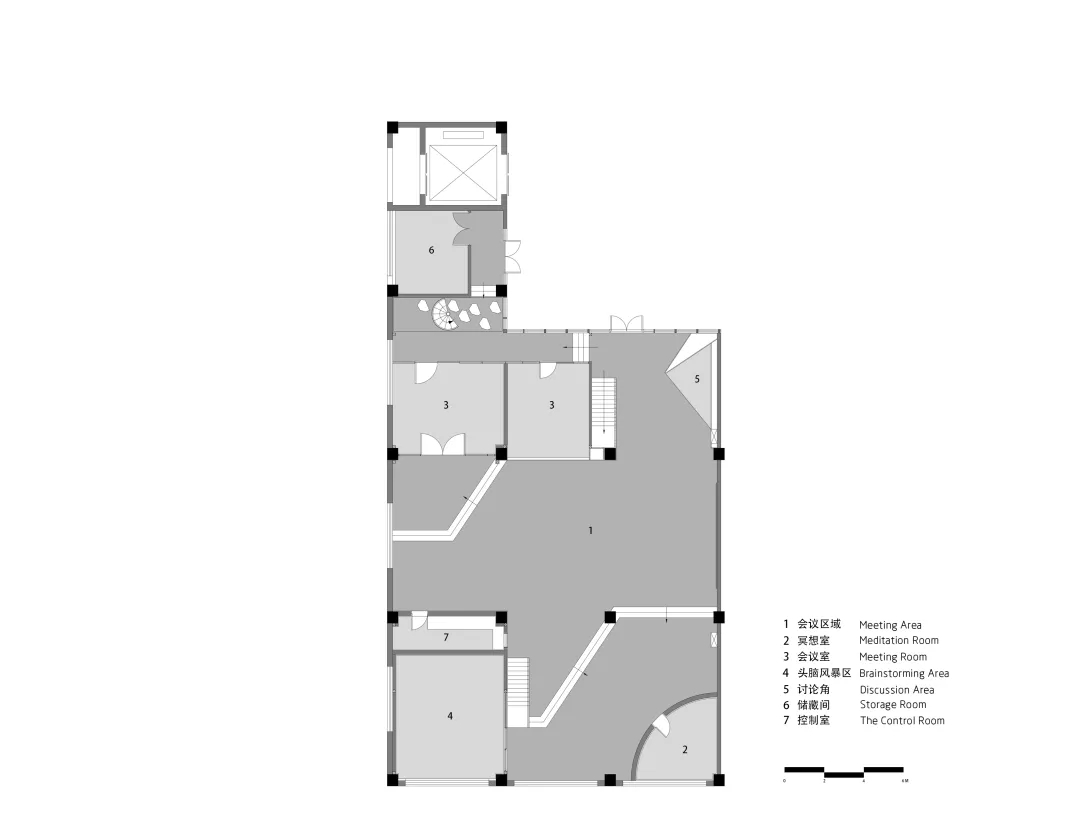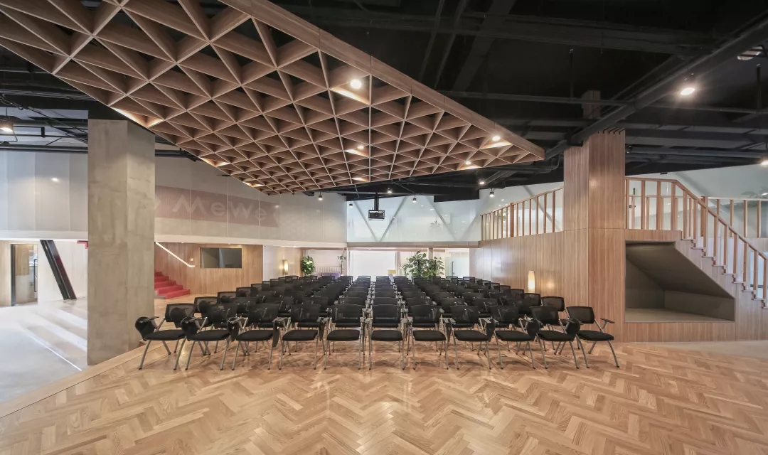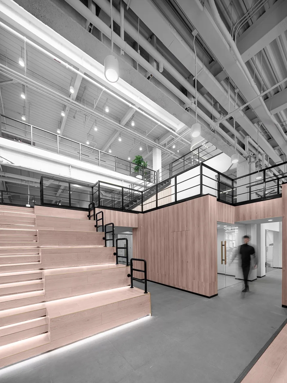 建筑师尝试创造一些对比剧烈并带有冲突性的空间。室内有非常多的空间挤压成非常小的角落,也有肆无忌惮地释放成特别开敞的广场,如下沉的部分是一个大型的集散广场的空间概念。大家可以随意坐在前面的台阶,就像一个开放的公共广场上进行交流的场景。从广场旁的球形的冥想室对面楼梯,到达一个长条形的悬挑,进入一个连廊转换到特别狭小的空间里,是二楼的一个小型和式榻榻米区,工作人员可以完全把房间封闭起来,在宁静空间当中进行自我的沉浸式思考。