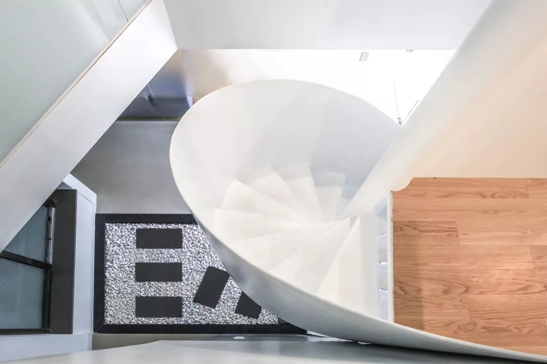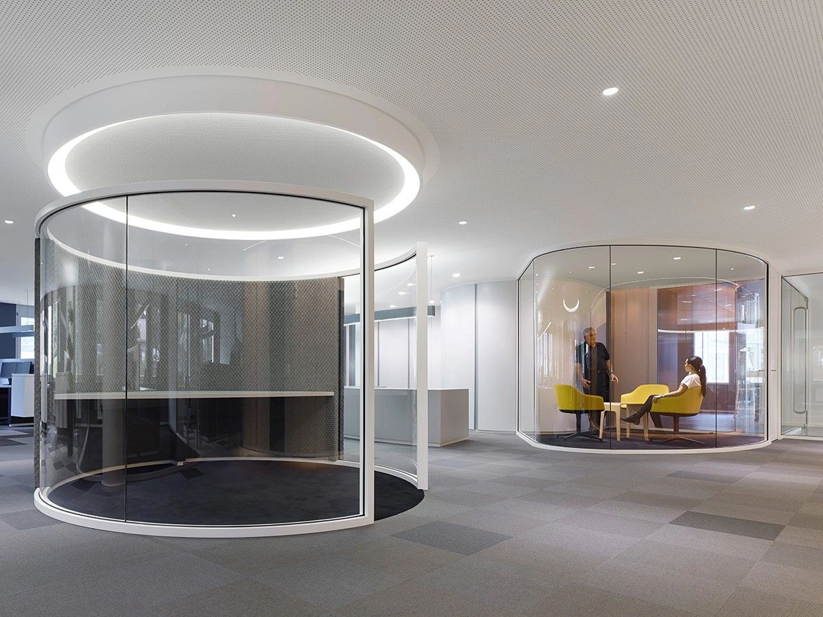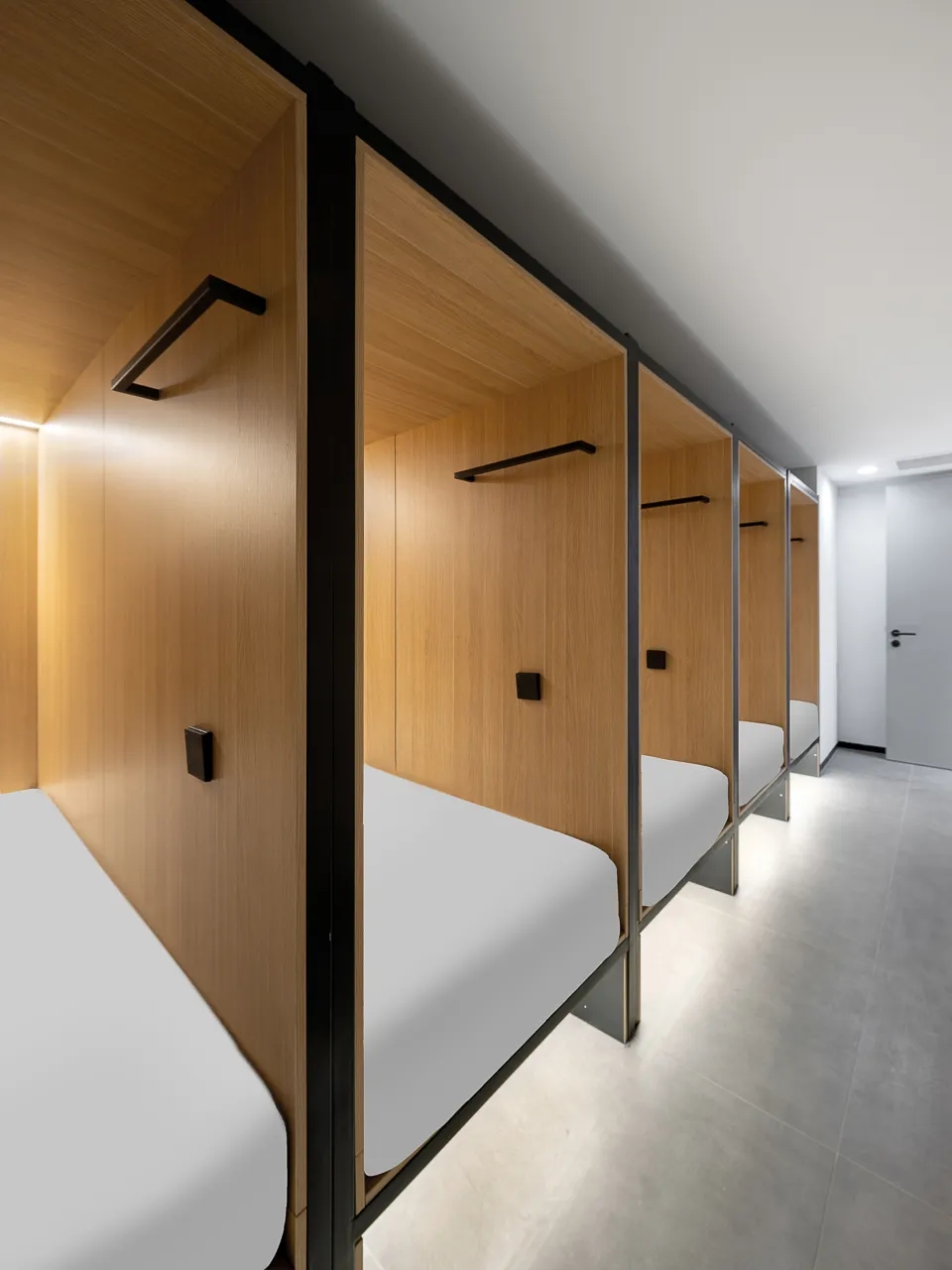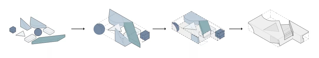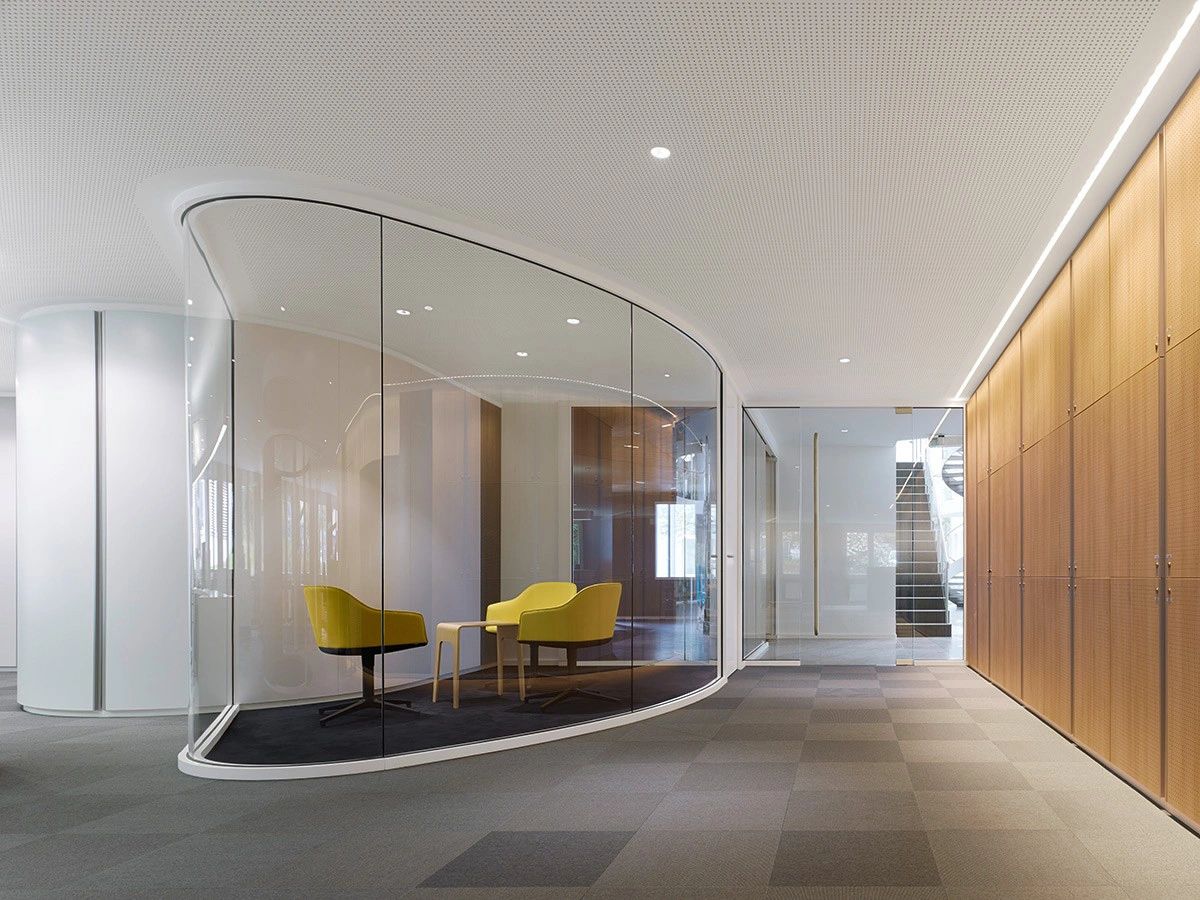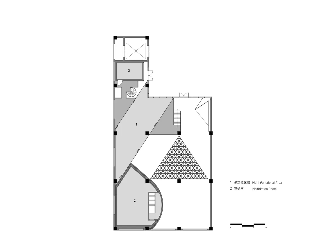 建筑师尝试创造一些对比剧烈并带有冲突性的空间。室内有非常多的空间挤压成非常小的角落,也有肆无忌惮地释放成特别开敞的广场,如下沉的部分是一个大型的集散广场的空间概念。大家可以随意坐在前面的台阶,就像一个开放的公共广场上进行交流的场景。从广场旁的球形的冥想室对面楼梯,到达一个长条形的悬挑,进入一个连廊转换到特别狭小的空间里,是二楼的一个小型和式榻榻米区,工作人员可以完全把房间封闭起来,在宁静空间当中进行自我的沉浸式思考。