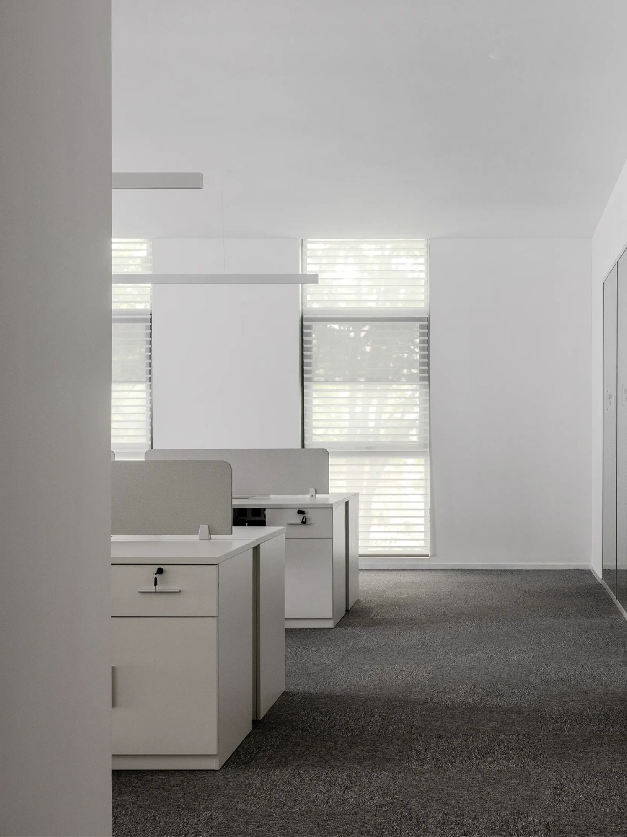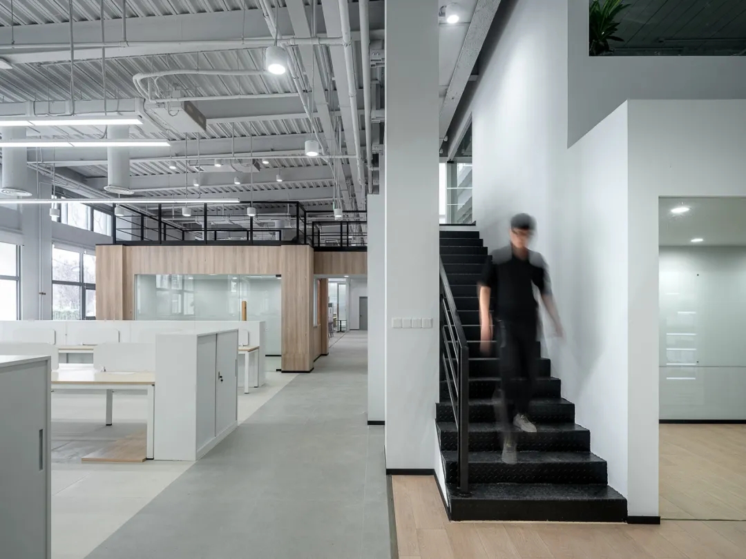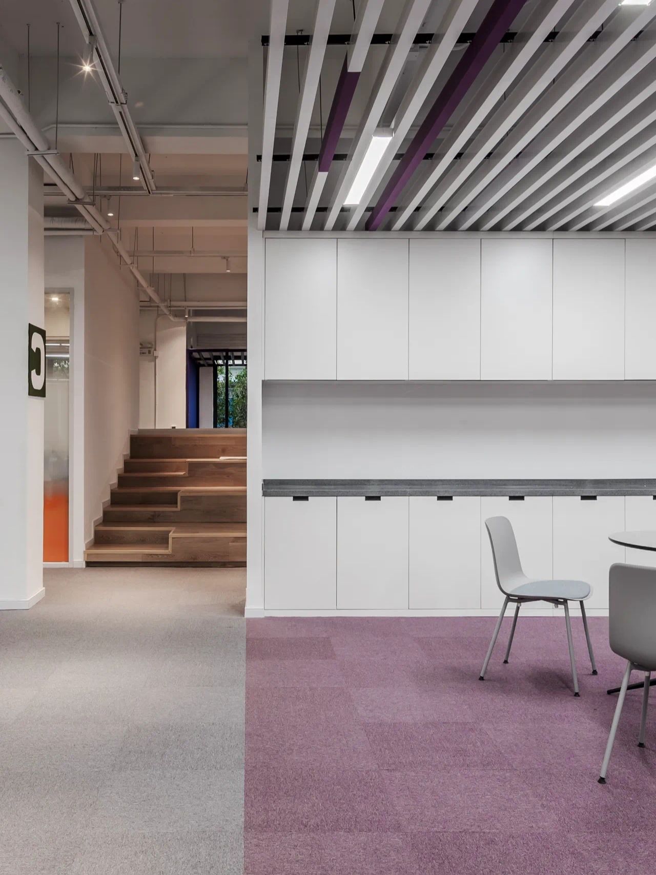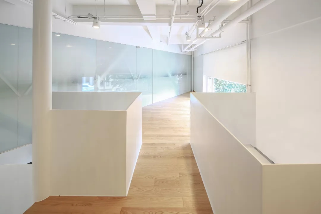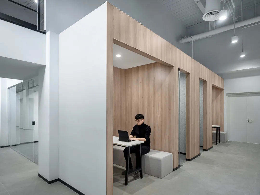 在材料的选择上,整个空间以比较素雅的基调作为整体空间氛围的营造。采用了不同拼花的木地板,以及水泥自流平。二楼采用了一些地胶和乳胶漆搭配组合。脑暴会议进行隔音的毛毡处理。在整个空间的立面饰面,做了一些局部的木饰面啊,以及金属板,白色的冲孔板,双层表皮的处理。