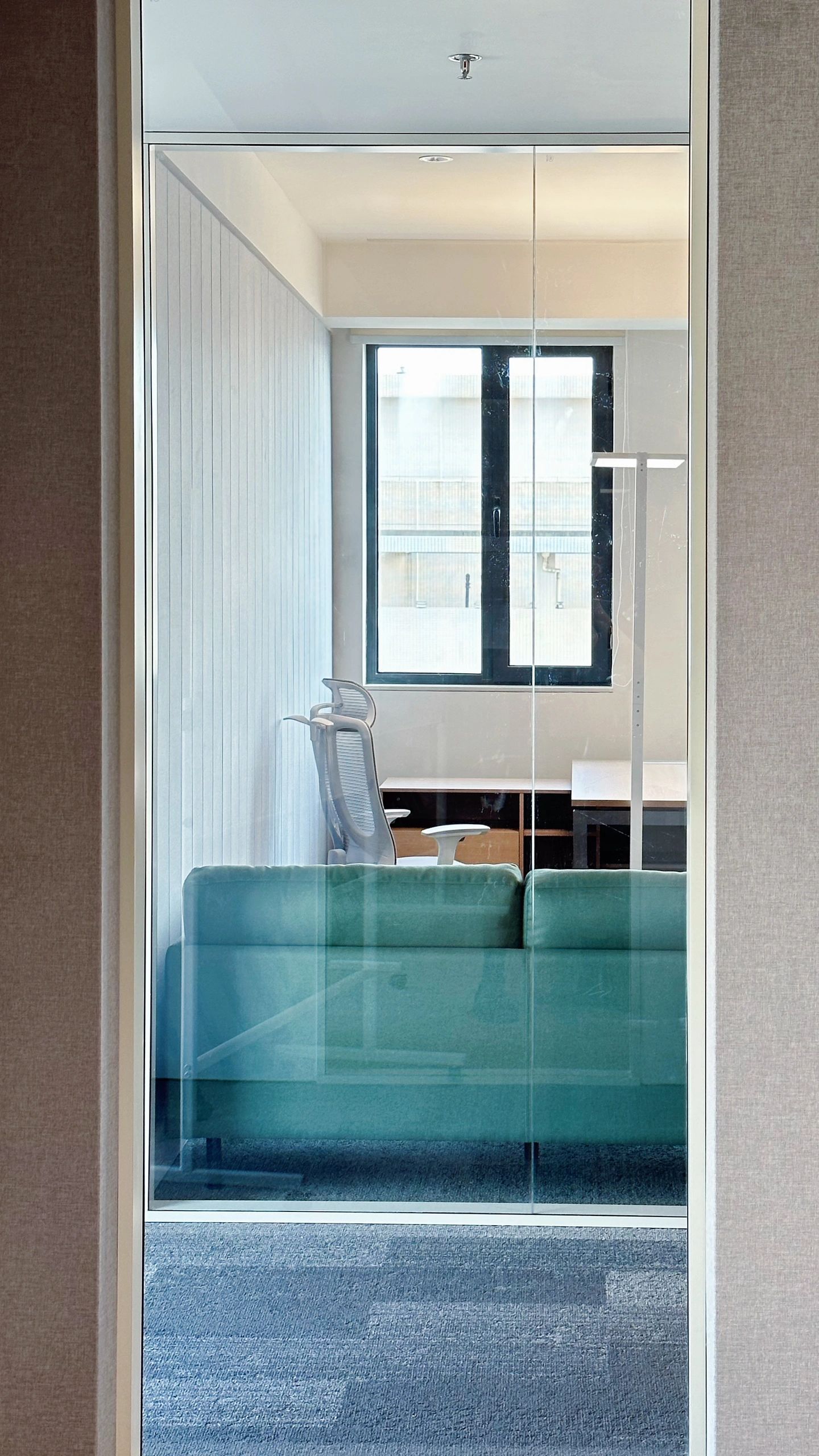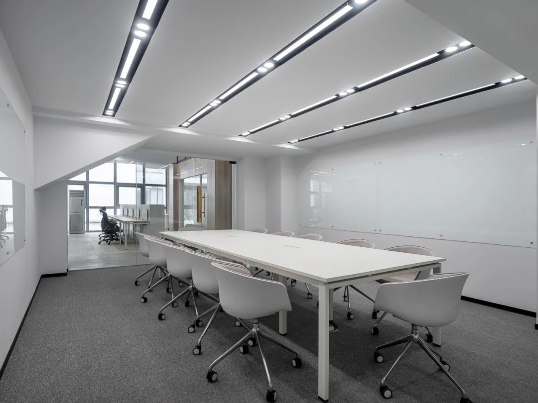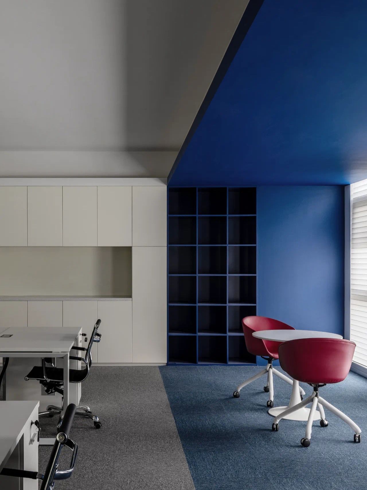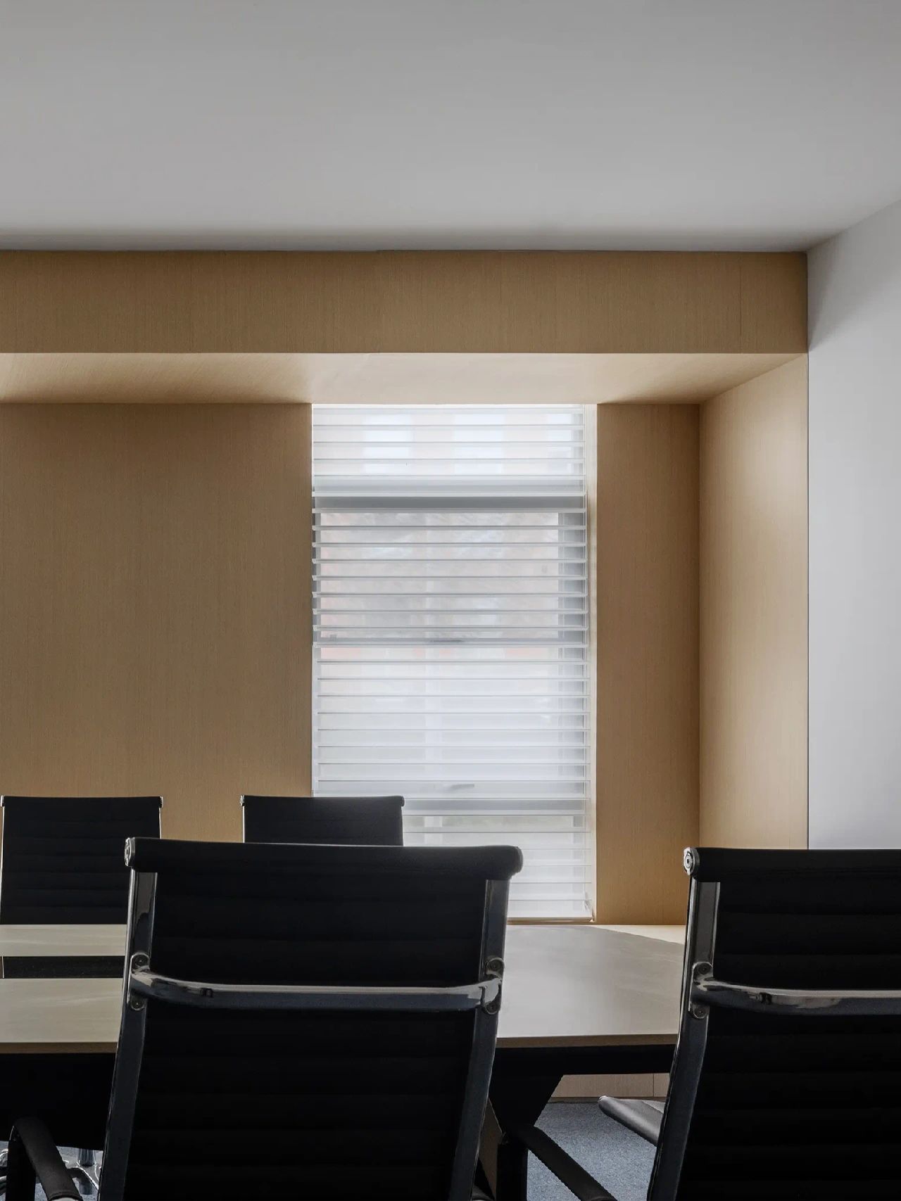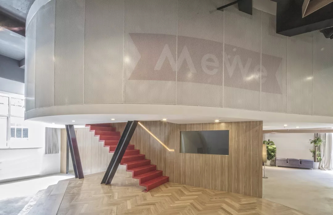 在材料的选择上,整个空间以比较素雅的基调作为整体空间氛围的营造。采用了不同拼花的木地板,以及水泥自流平。二楼采用了一些地胶和乳胶漆搭配组合。脑暴会议进行隔音的毛毡处理。在整个空间的立面饰面,做了一些局部的木饰面啊,以及金属板,白色的冲孔板,双层表皮的处理。