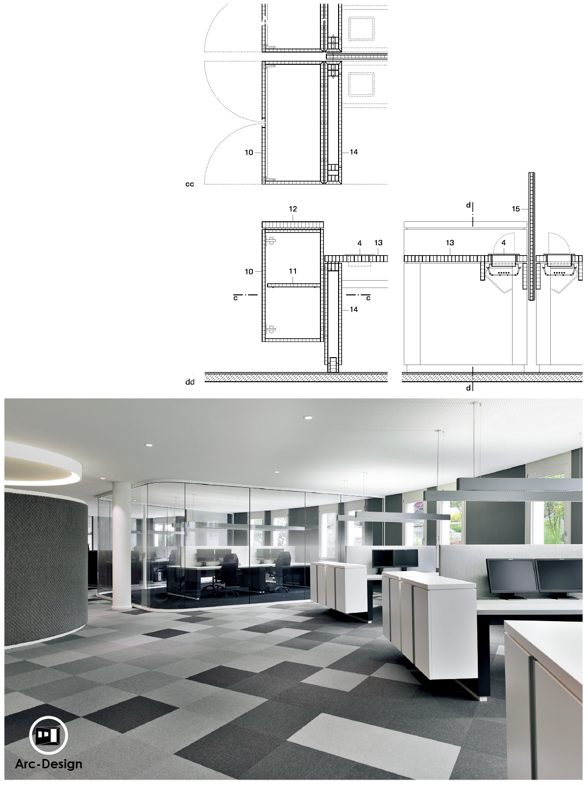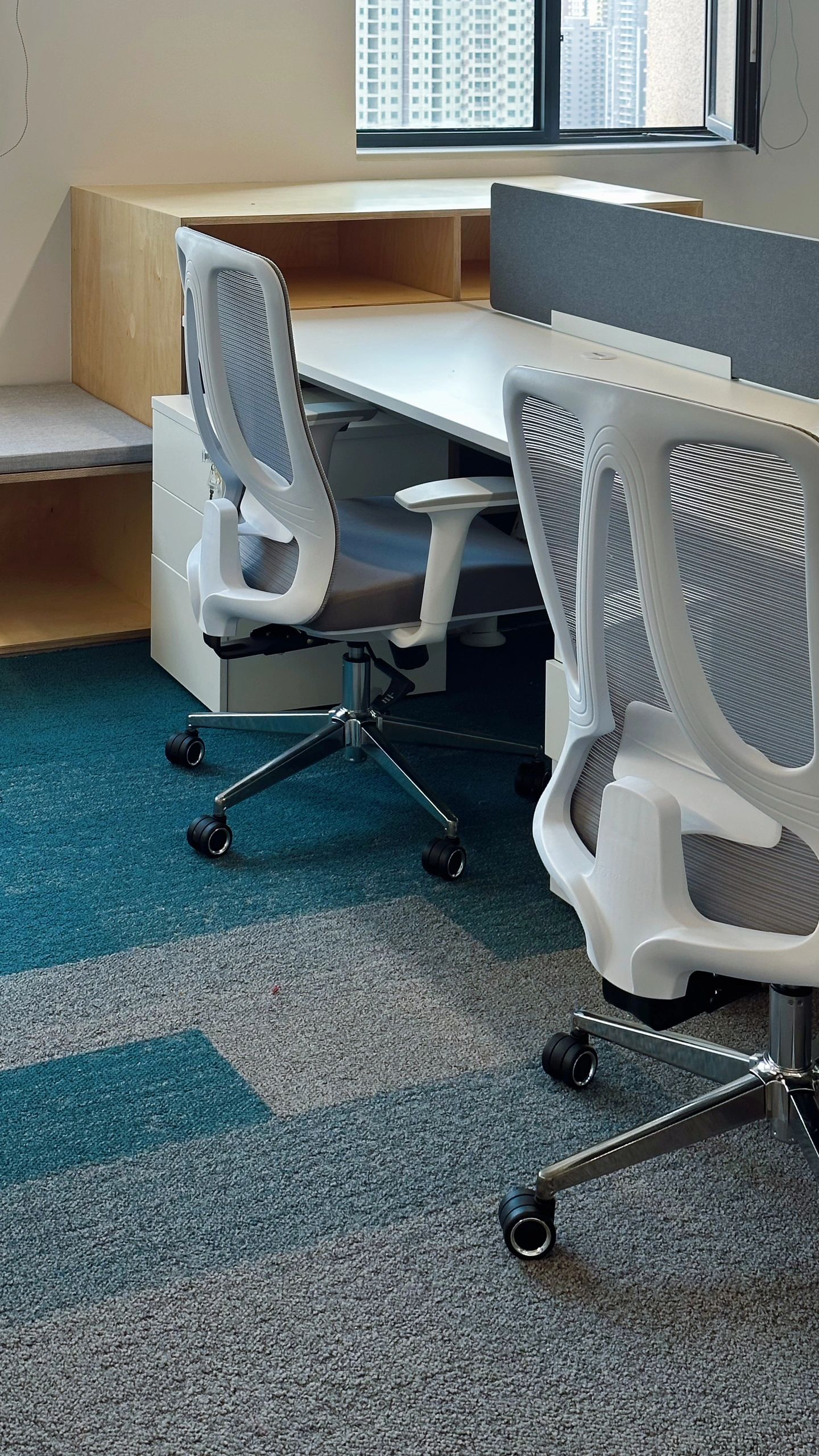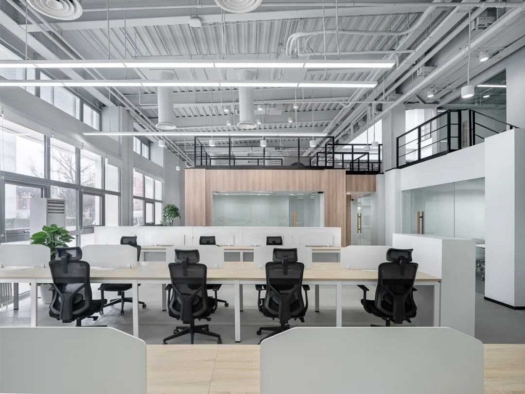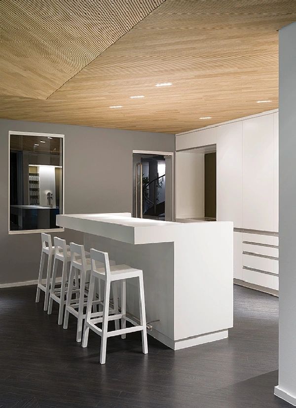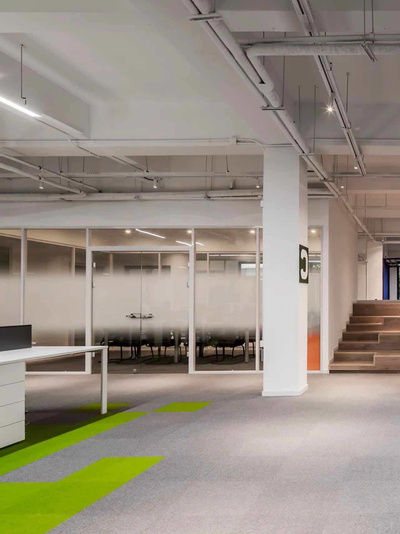 在材料的选择上,整个空间以比较素雅的基调作为整体空间氛围的营造。采用了不同拼花的木地板,以及水泥自流平。二楼采用了一些地胶和乳胶漆搭配组合。脑暴会议进行隔音的毛毡处理。在整个空间的立面饰面,做了一些局部的木饰面啊,以及金属板,白色的冲孔板,双层表皮的处理。