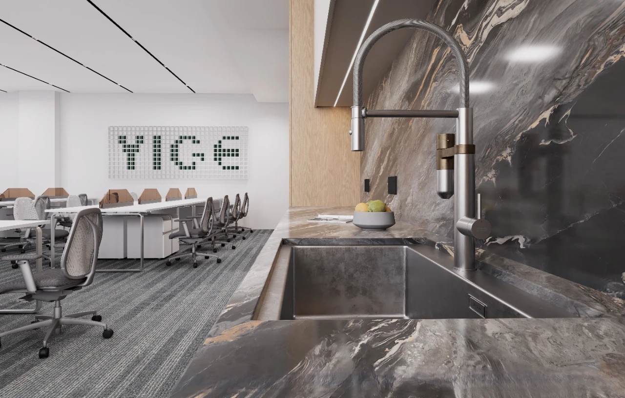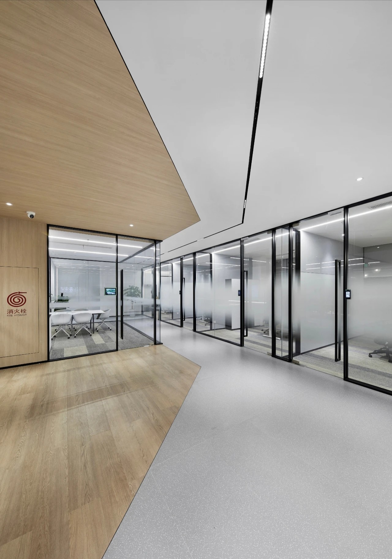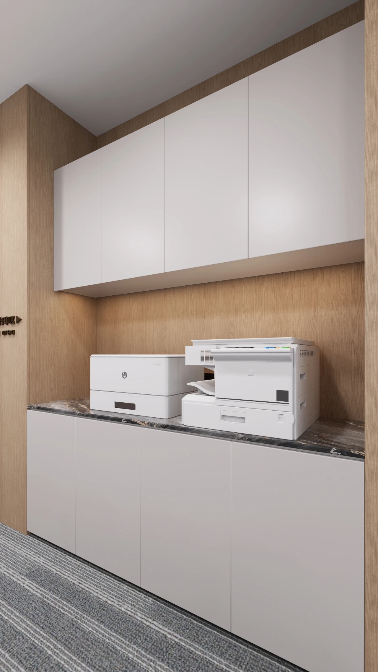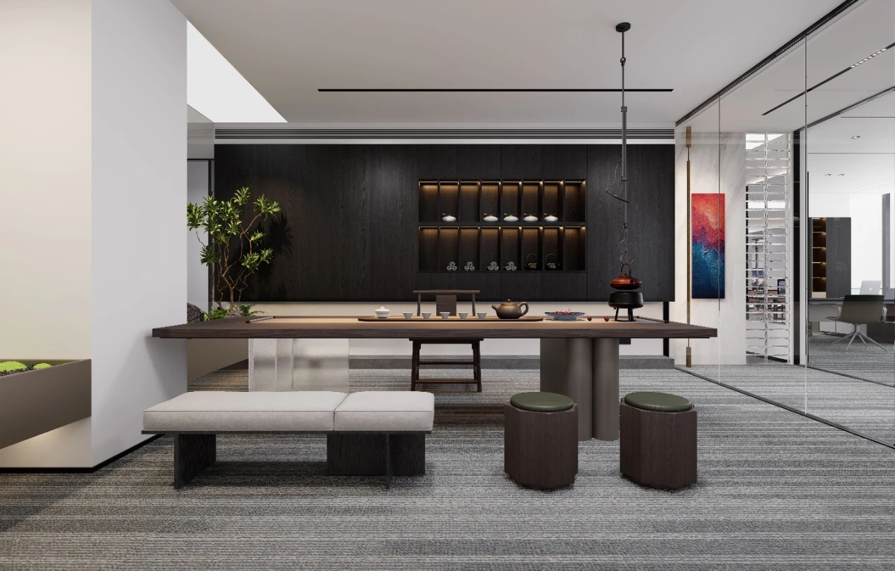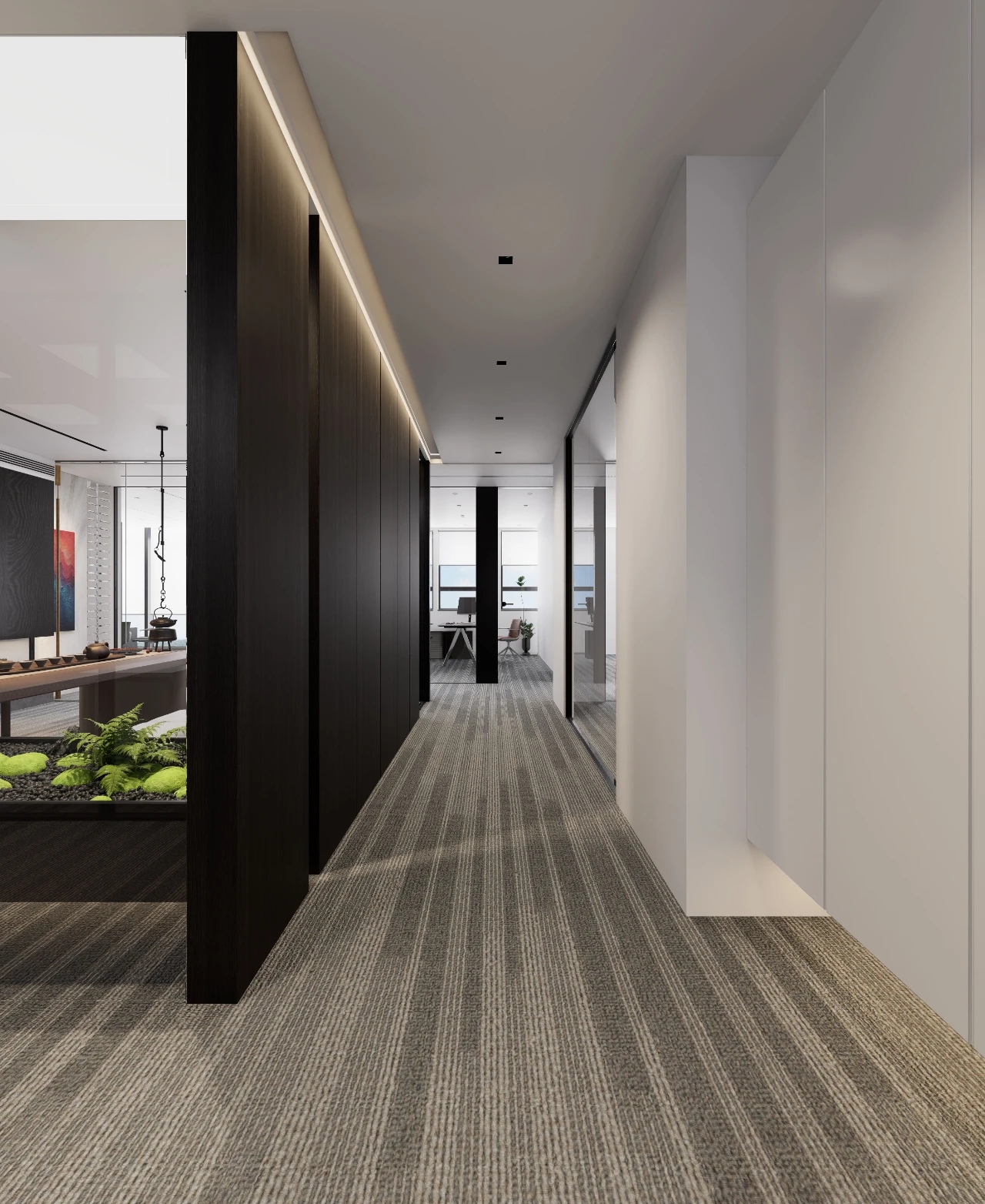 不同的材质凸显空间的多样化和艺术性,特别是顶面、地面的效果呈现:水磨石灰与原木的斜切拼组在视觉上形成冲突对比,体现定制化的高级设计。总经理室承载着使用者的日常办公与社交的功能需求。大气沉稳的环境氛围彰显着领导人的远见卓识与不凡品味。