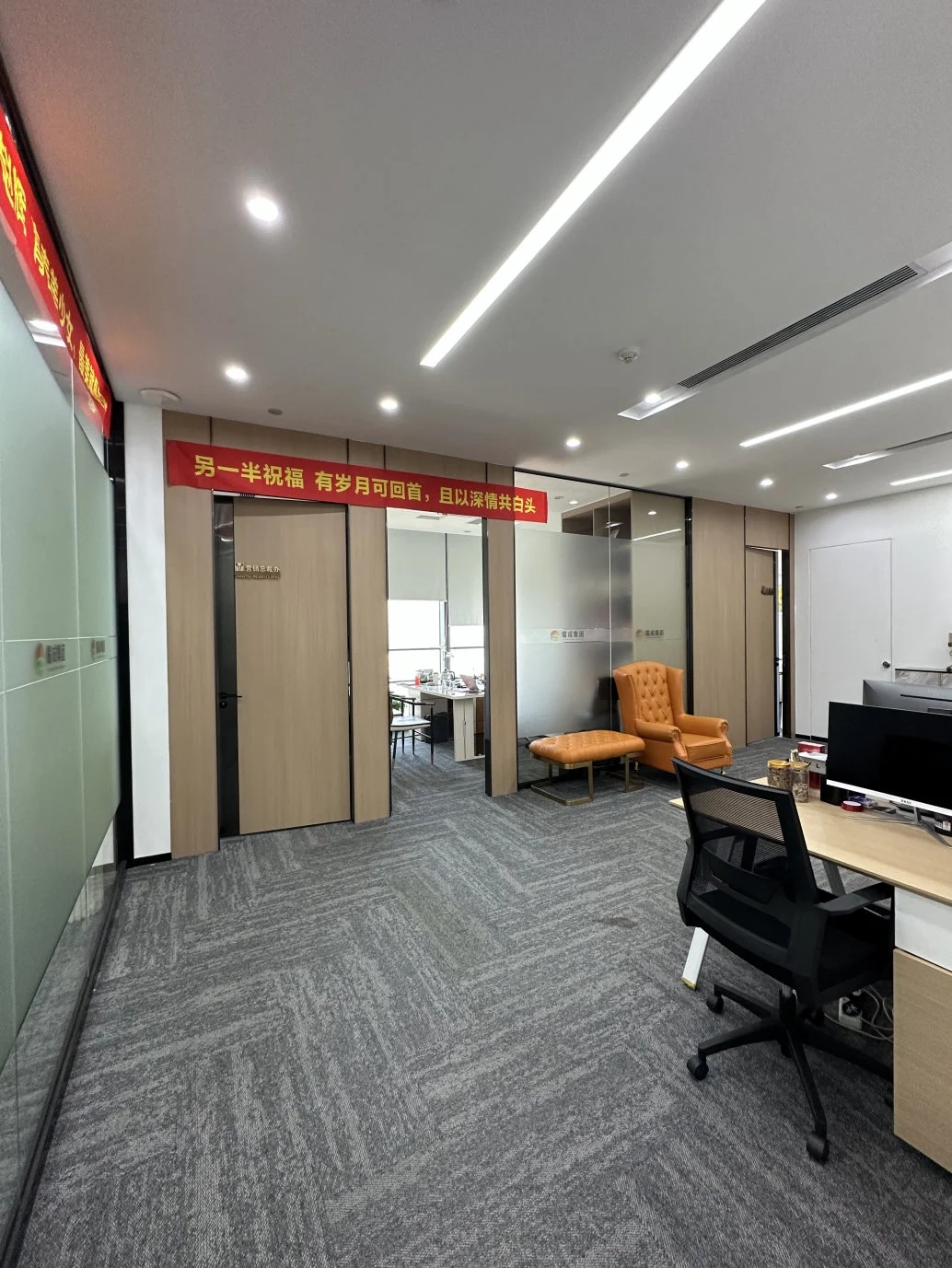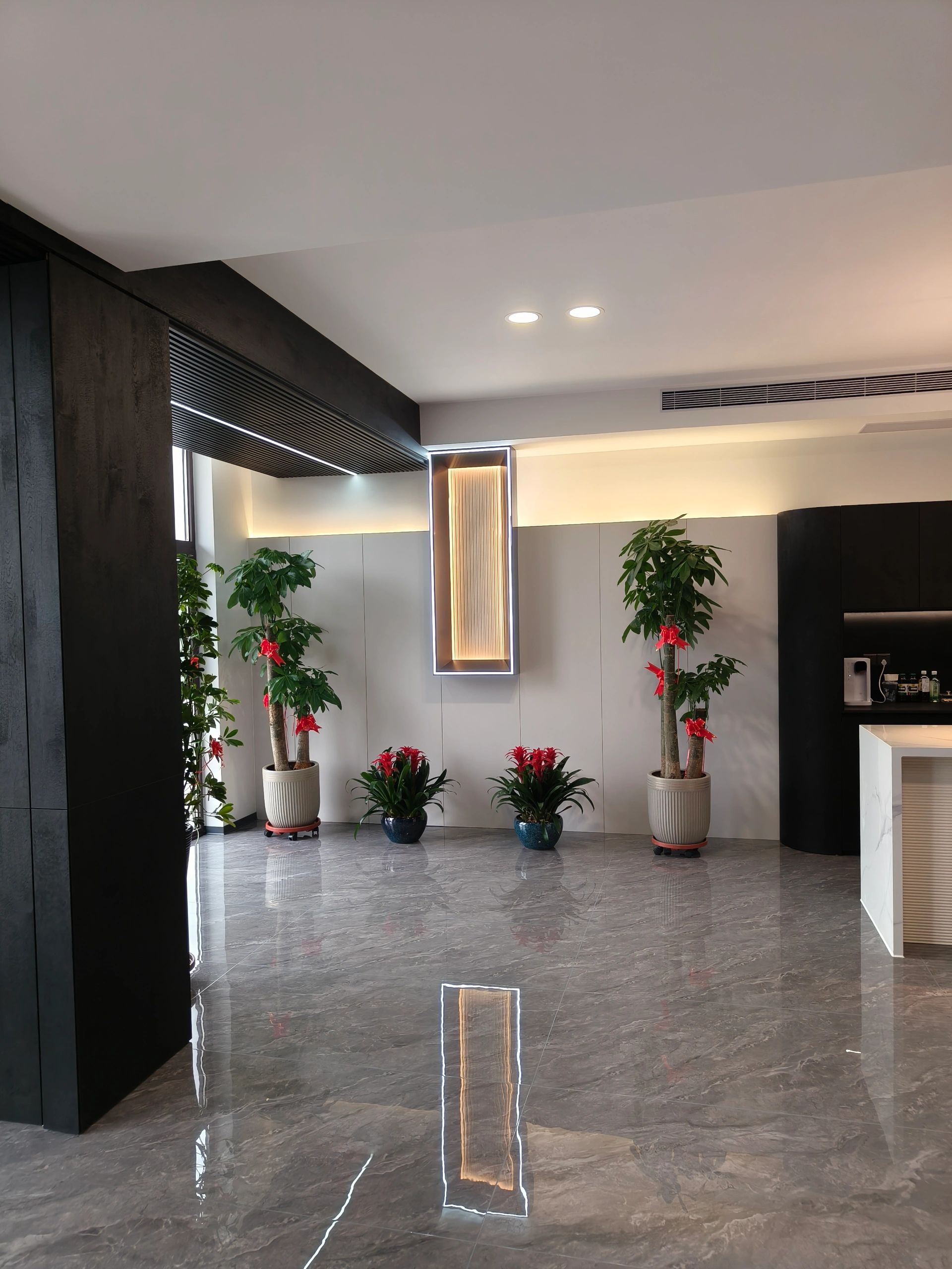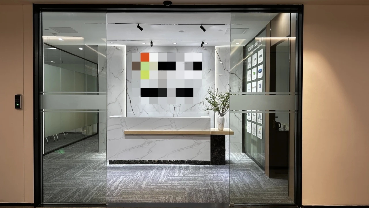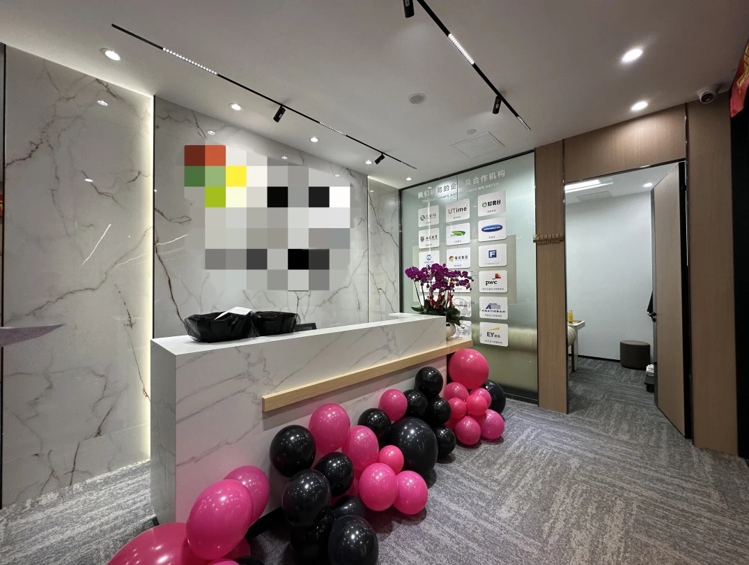 接待台也使用了与背景同色的大理石搭配了原木色台面中和了大理石给人的冰冷感,入口处使用了无主灯设计光源以两条轨道灯和筒灯为主保证了照明的同时也利于视觉聚焦在公司品牌上!