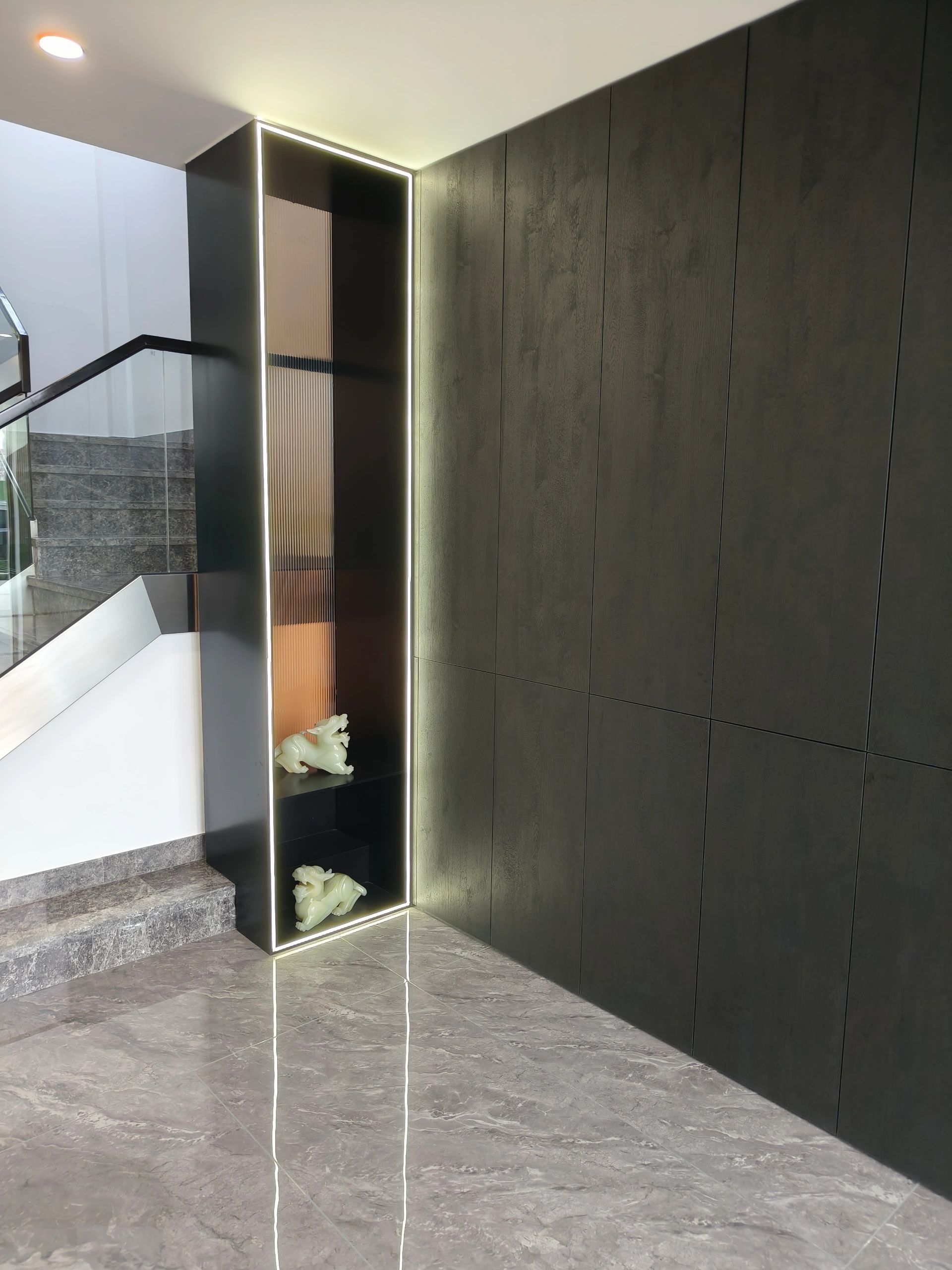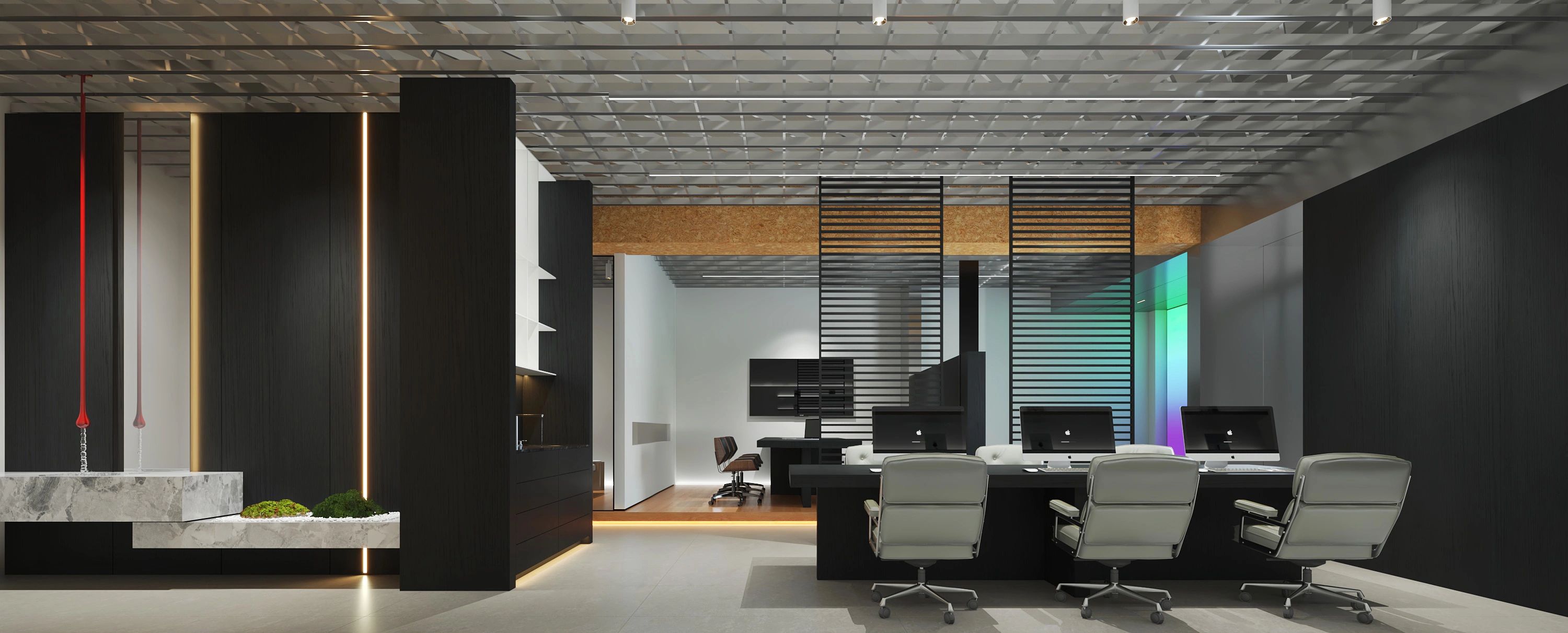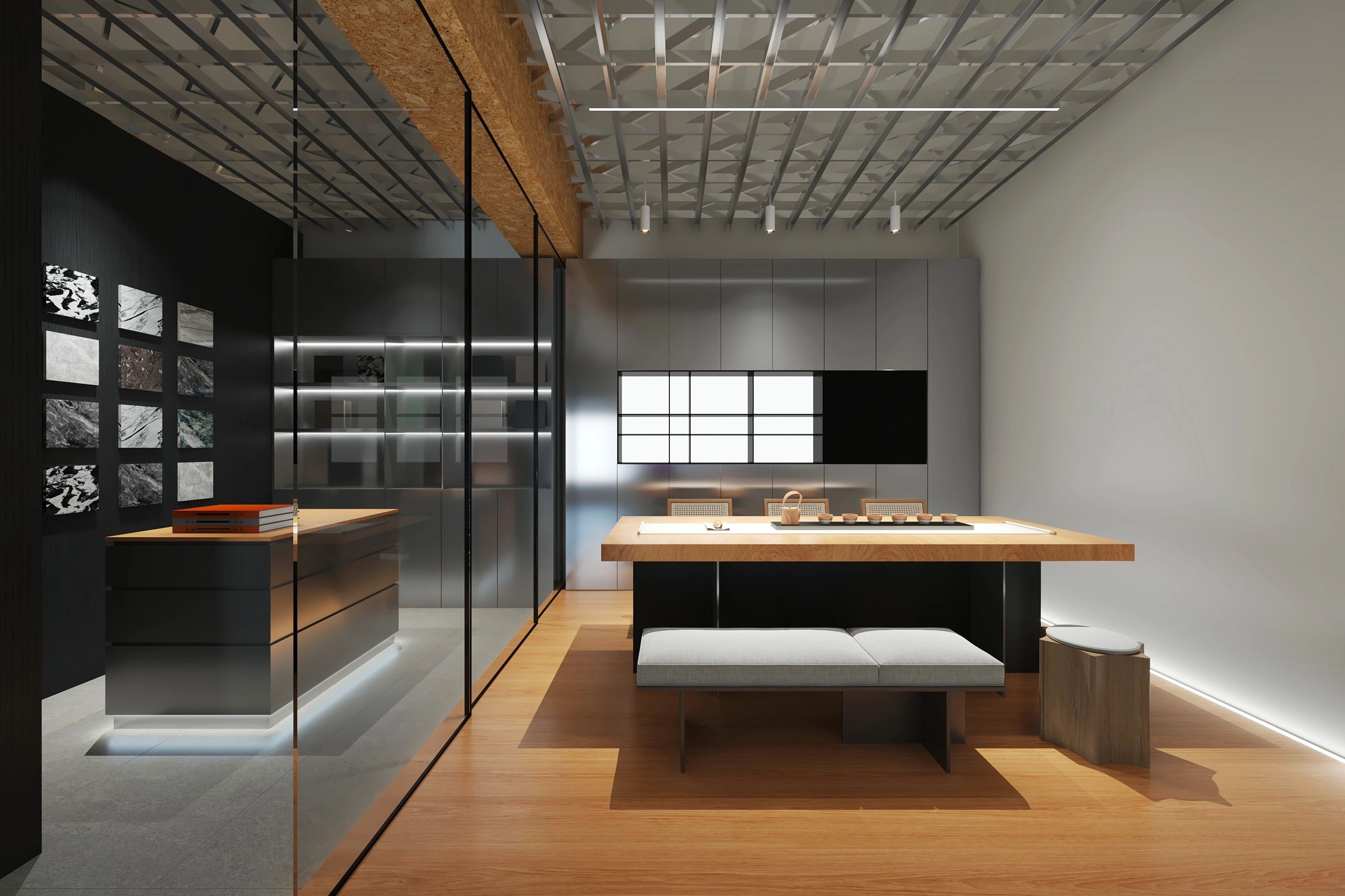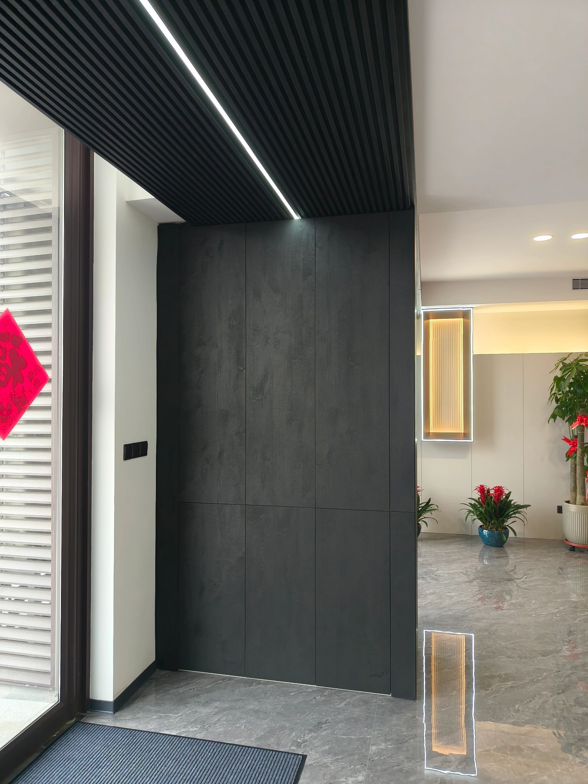 接待台也使用了与背景同色的大理石搭配了原木色台面中和了大理石给人的冰冷感,入口处使用了无主灯设计光源以两条轨道灯和筒灯为主保证了照明的同时也利于视觉聚焦在公司品牌上!