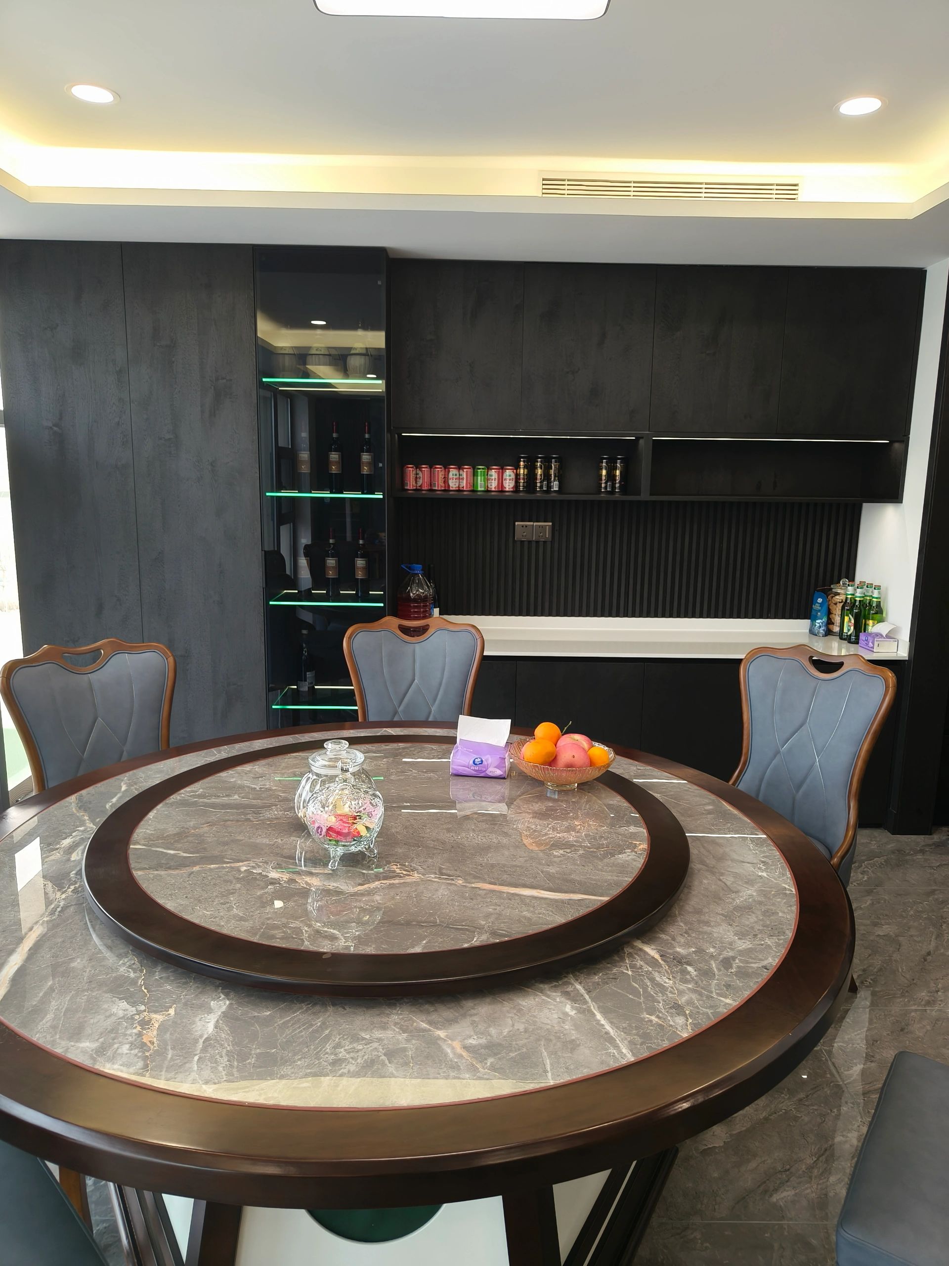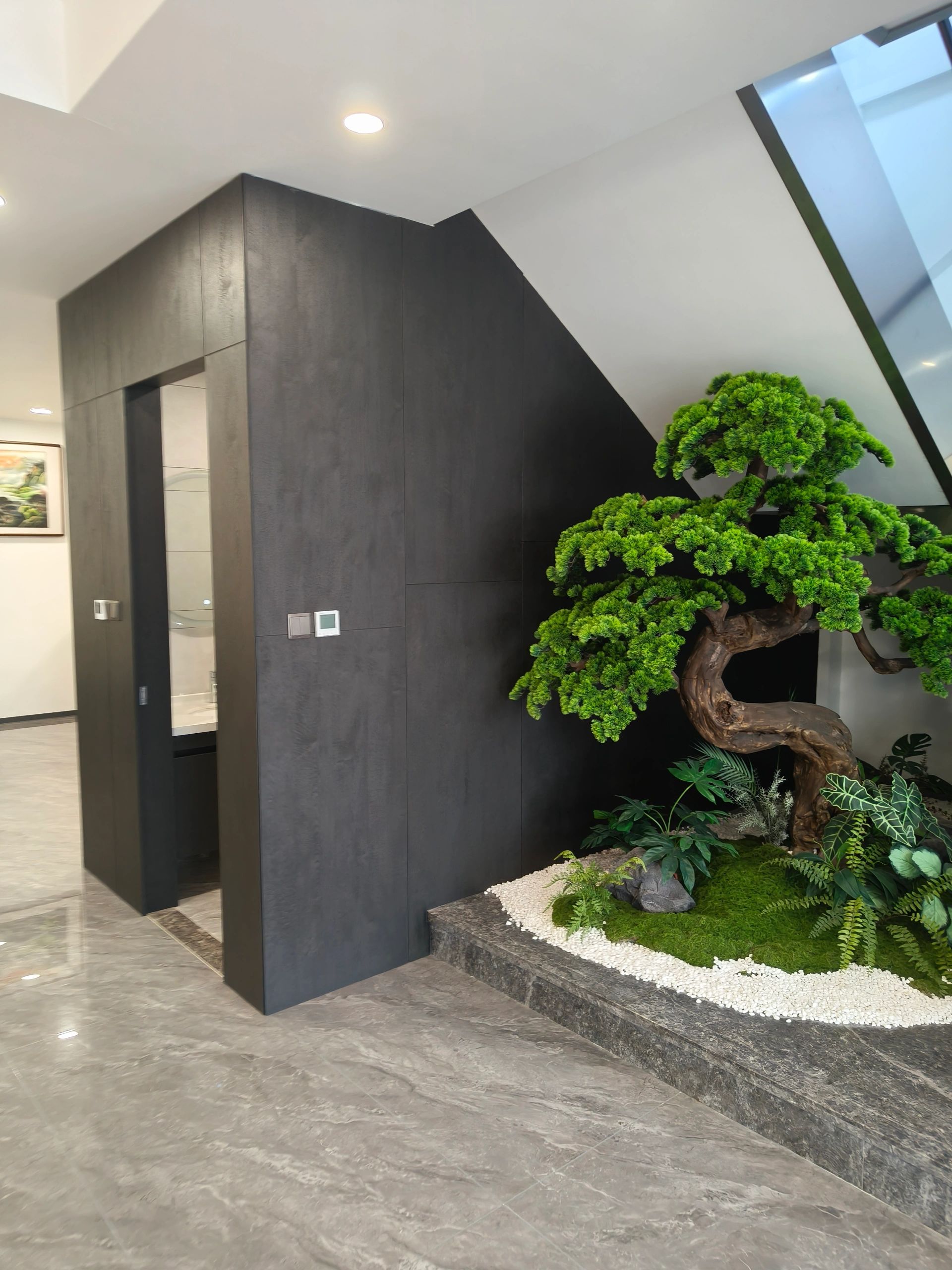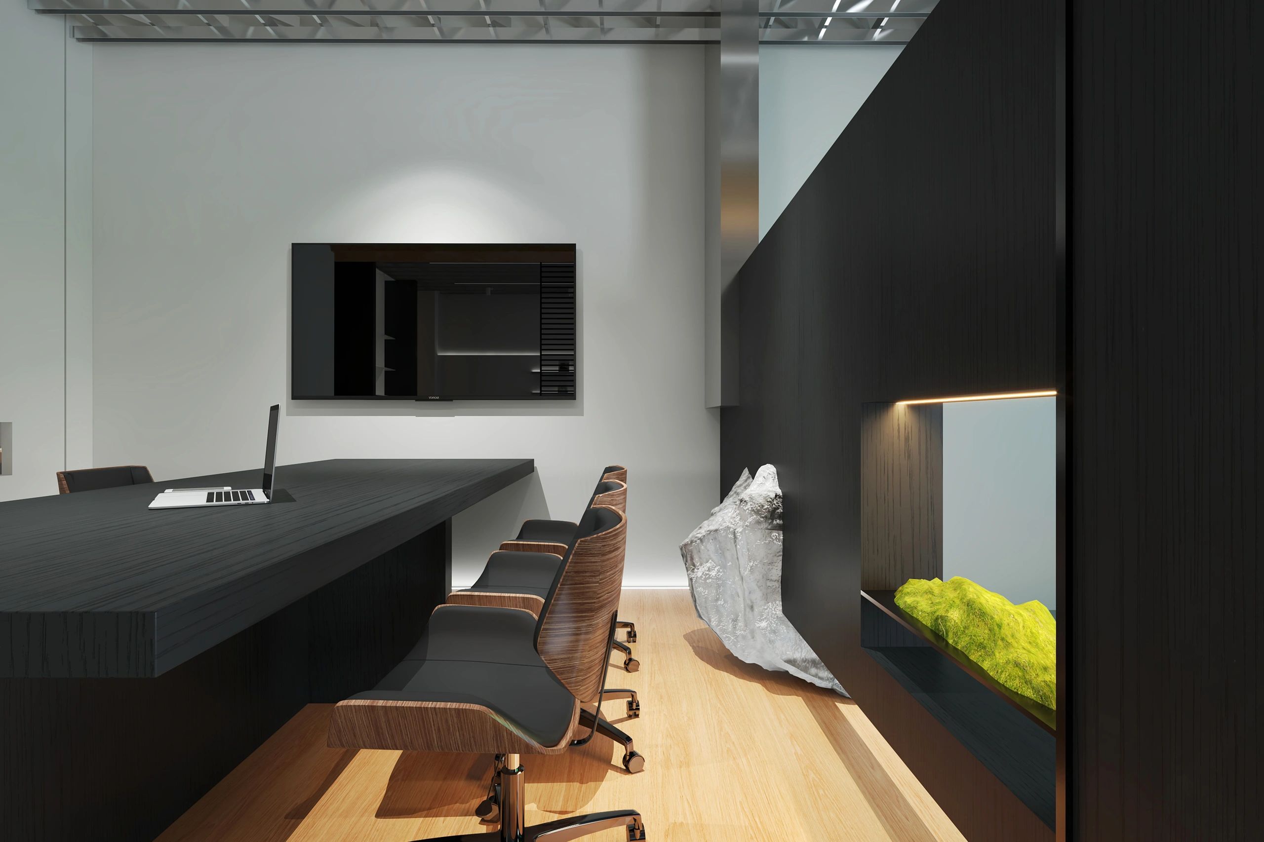 接待台也使用了与背景同色的大理石搭配了原木色台面中和了大理石给人的冰冷感,入口处使用了无主灯设计光源以两条轨道灯和筒灯为主保证了照明的同时也利于视觉聚焦在公司品牌上!