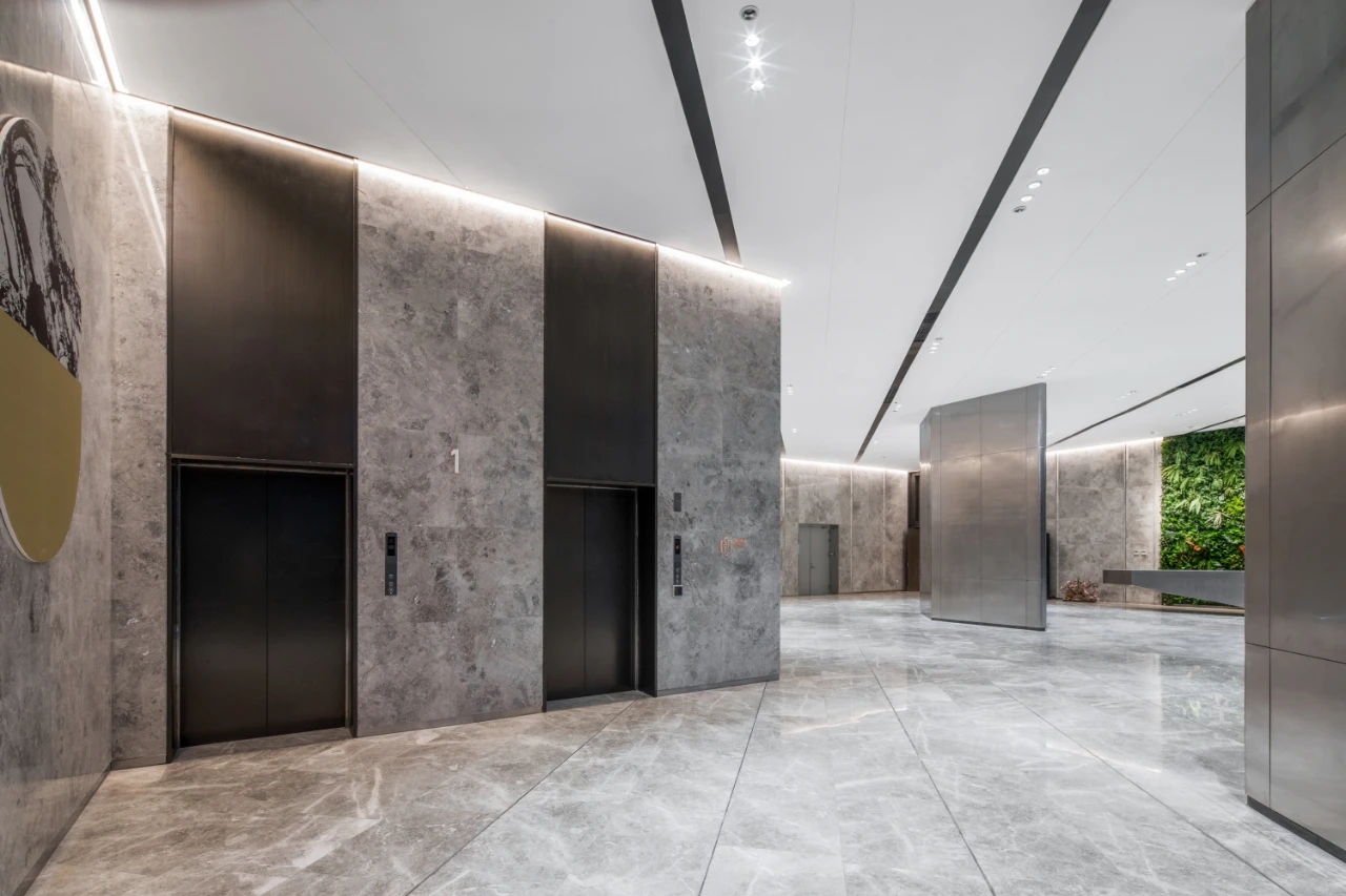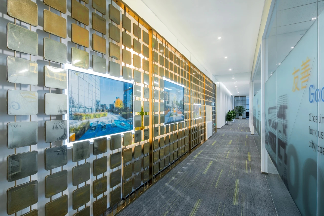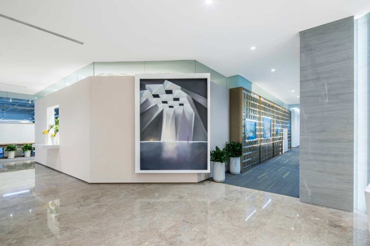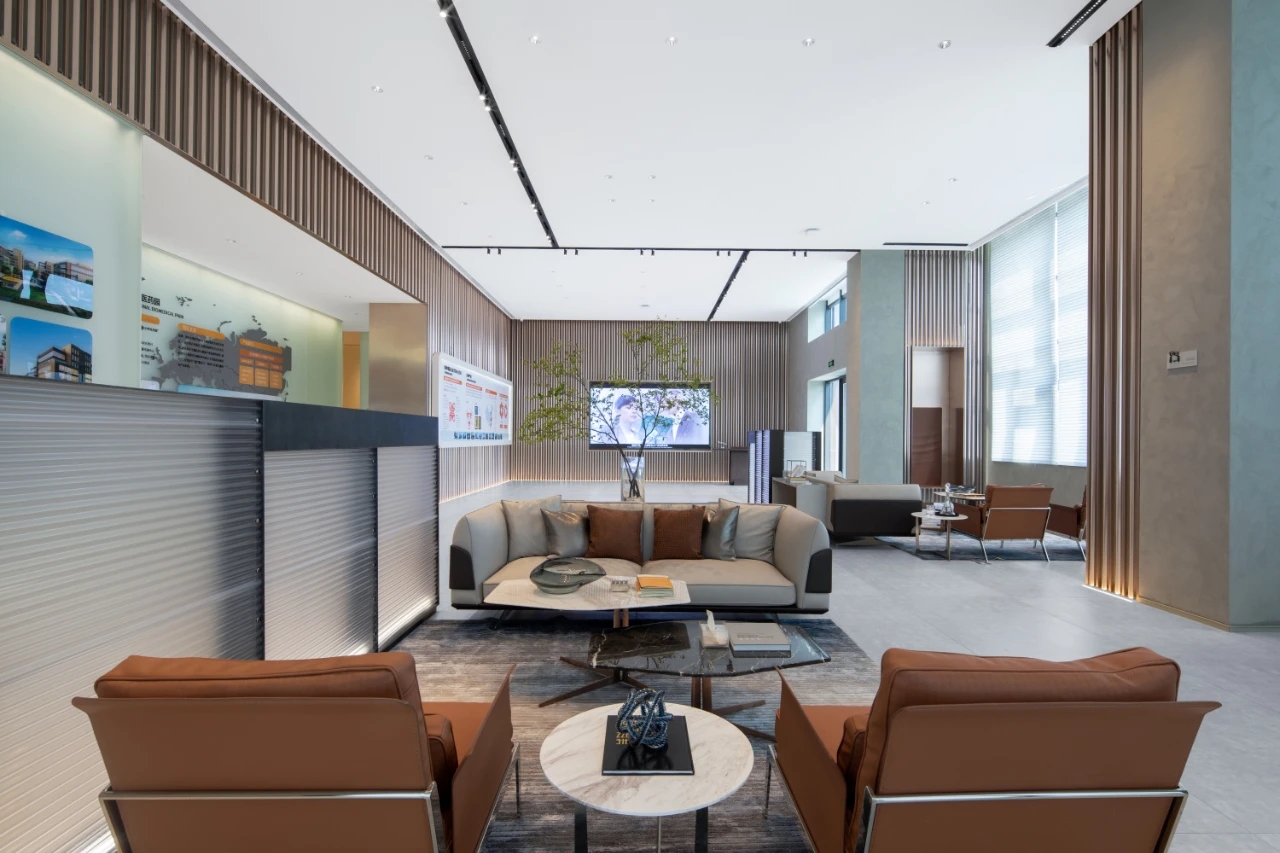 充满未来气息的室内设计,以科技灰作为室内的基本结构元素,将科技展示与艺术融入空间布局。园区招商中心大堂呈开放式的空间布局,又兼具各自独立的洽谈区域,将科技展示与当代艺术元素融入空间布局中,符合现代审美,营造出一个体验式的艺术空间。
