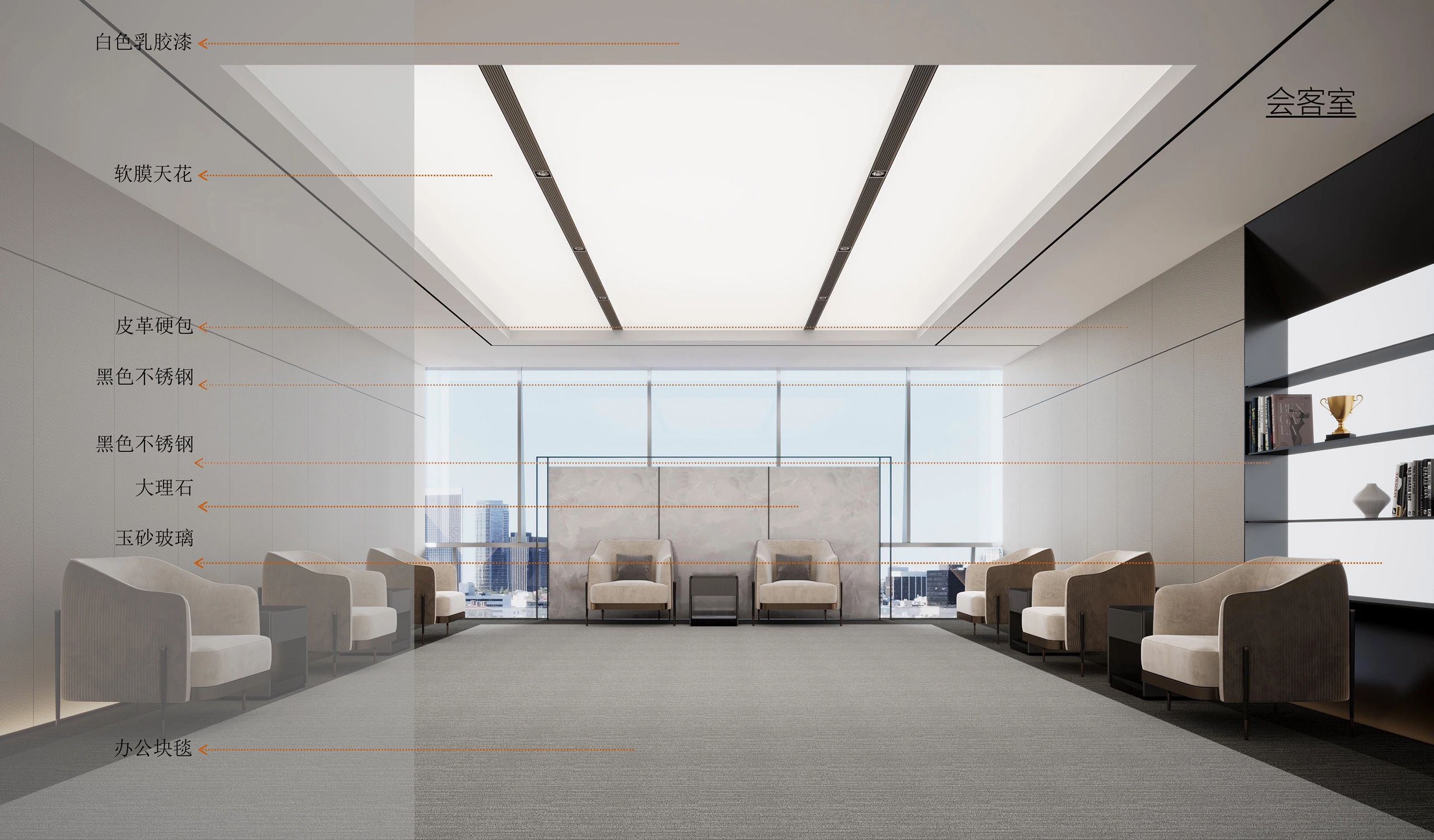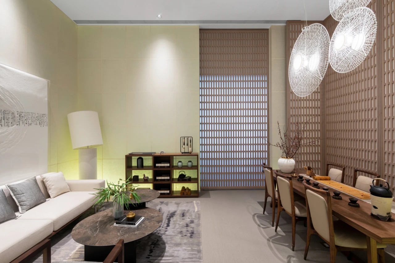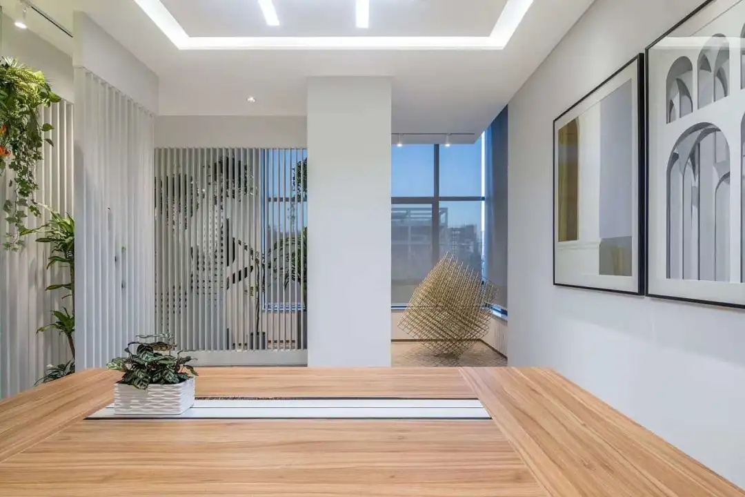 接待大厅充满活力,深色的地面木纹石既与墙面主背景墙呼应一体,又与白色接待台形成鲜明的对比;接待台下方的线型灯带与上方体块式软膜白色天花增添光科技感;背景墙后方的竖向格栅使空间既温馨又增添层次感。整体室内空间上,巧妙地应用了点状、带状、面状情境光源,来凸显空间特性。
