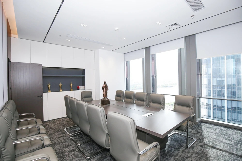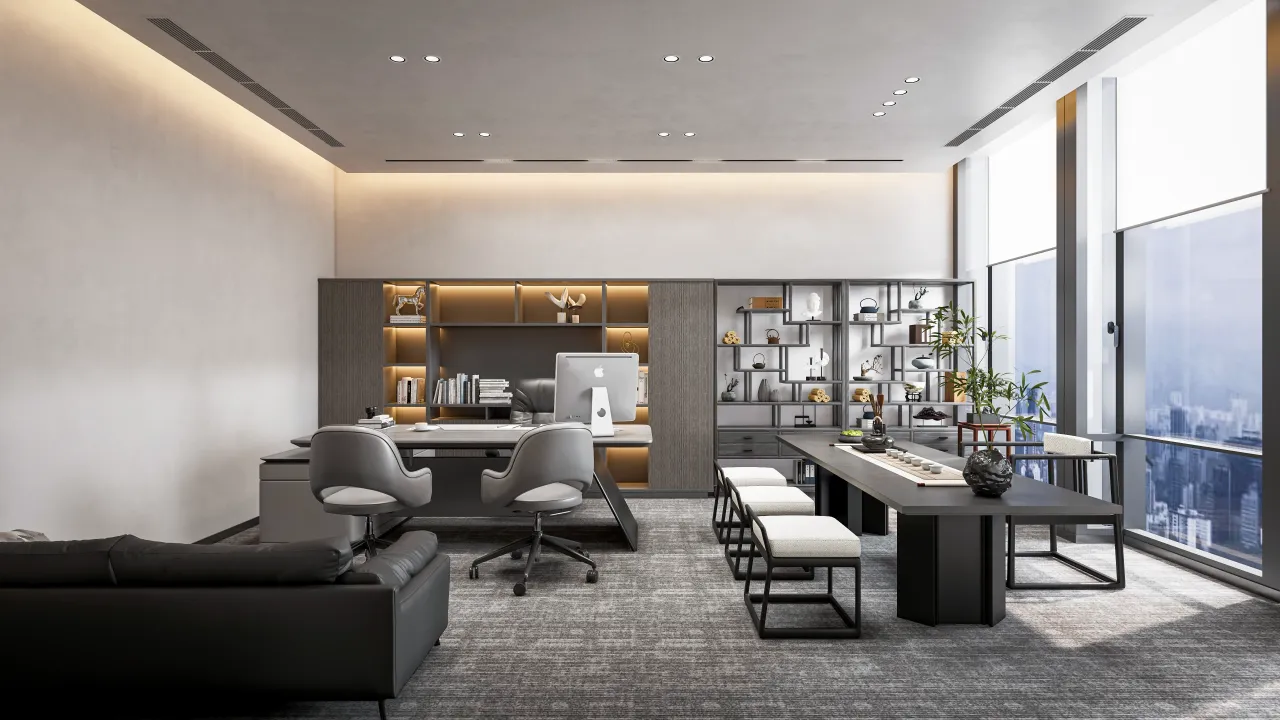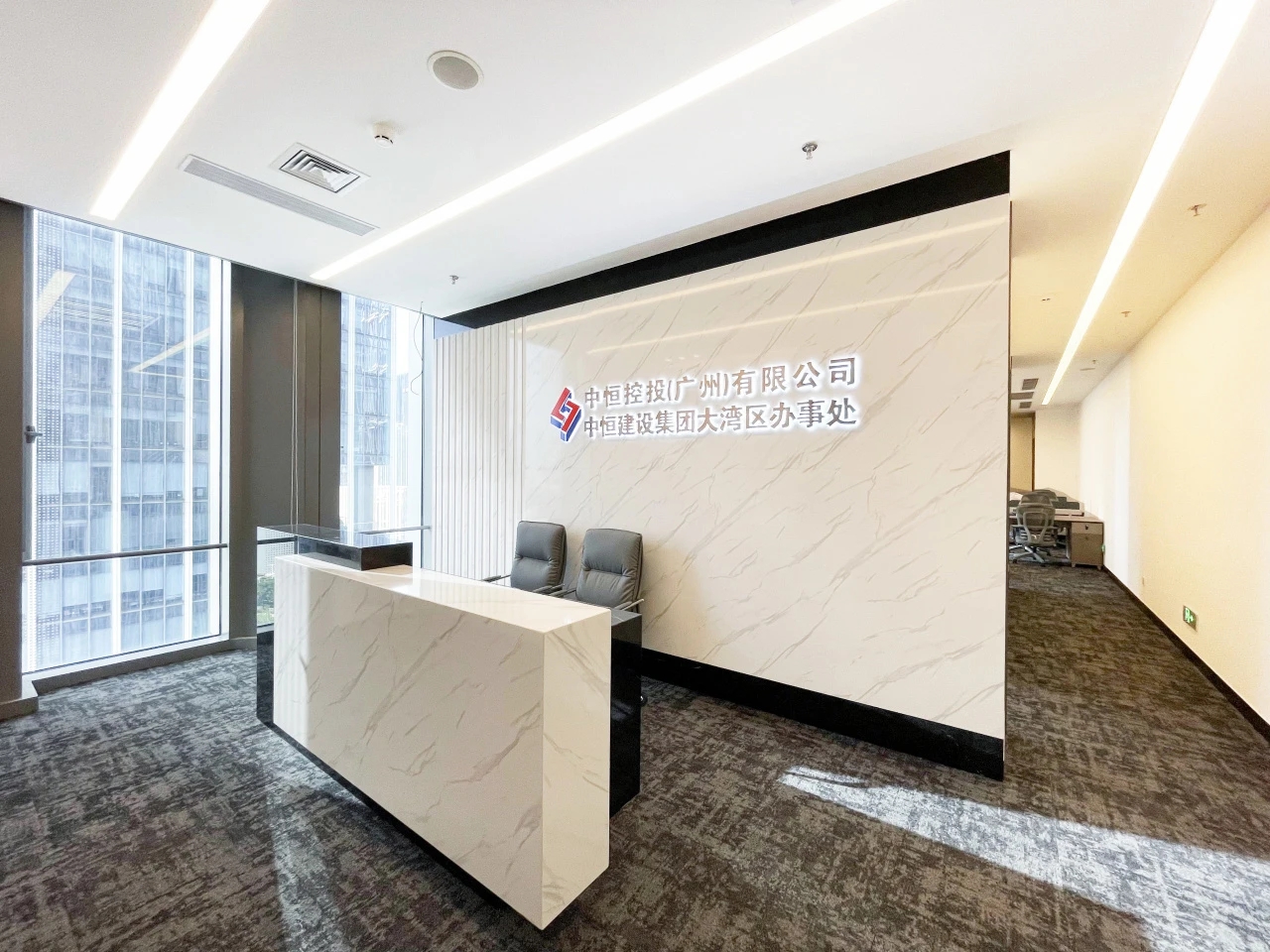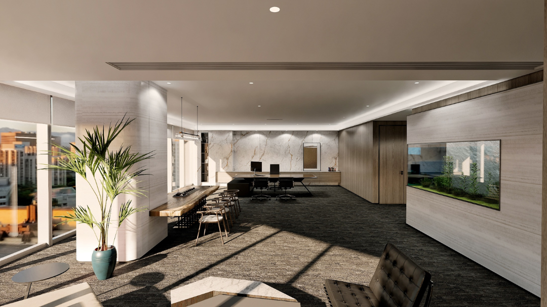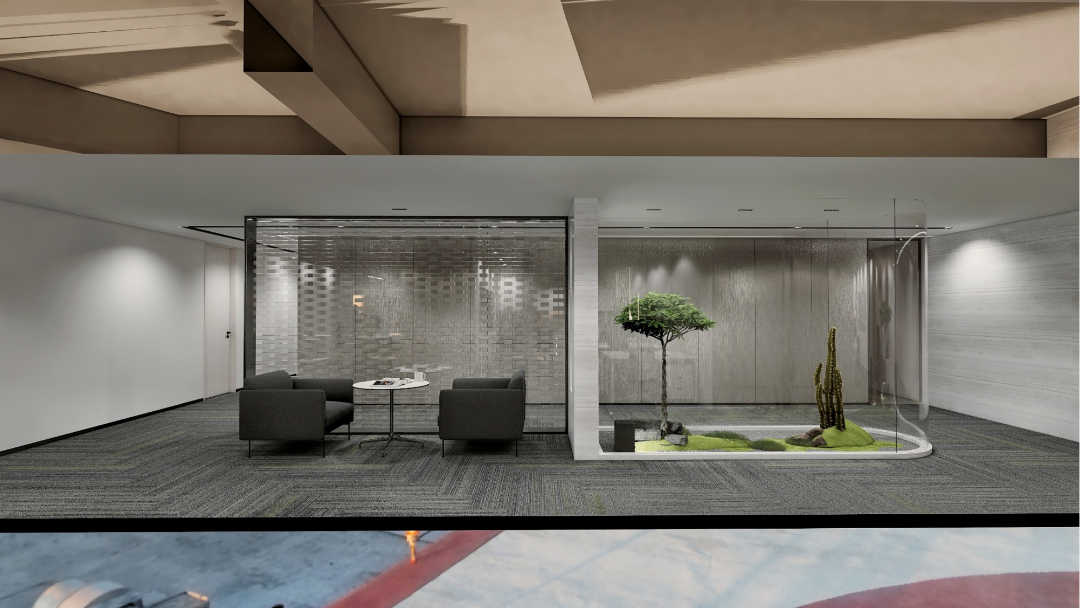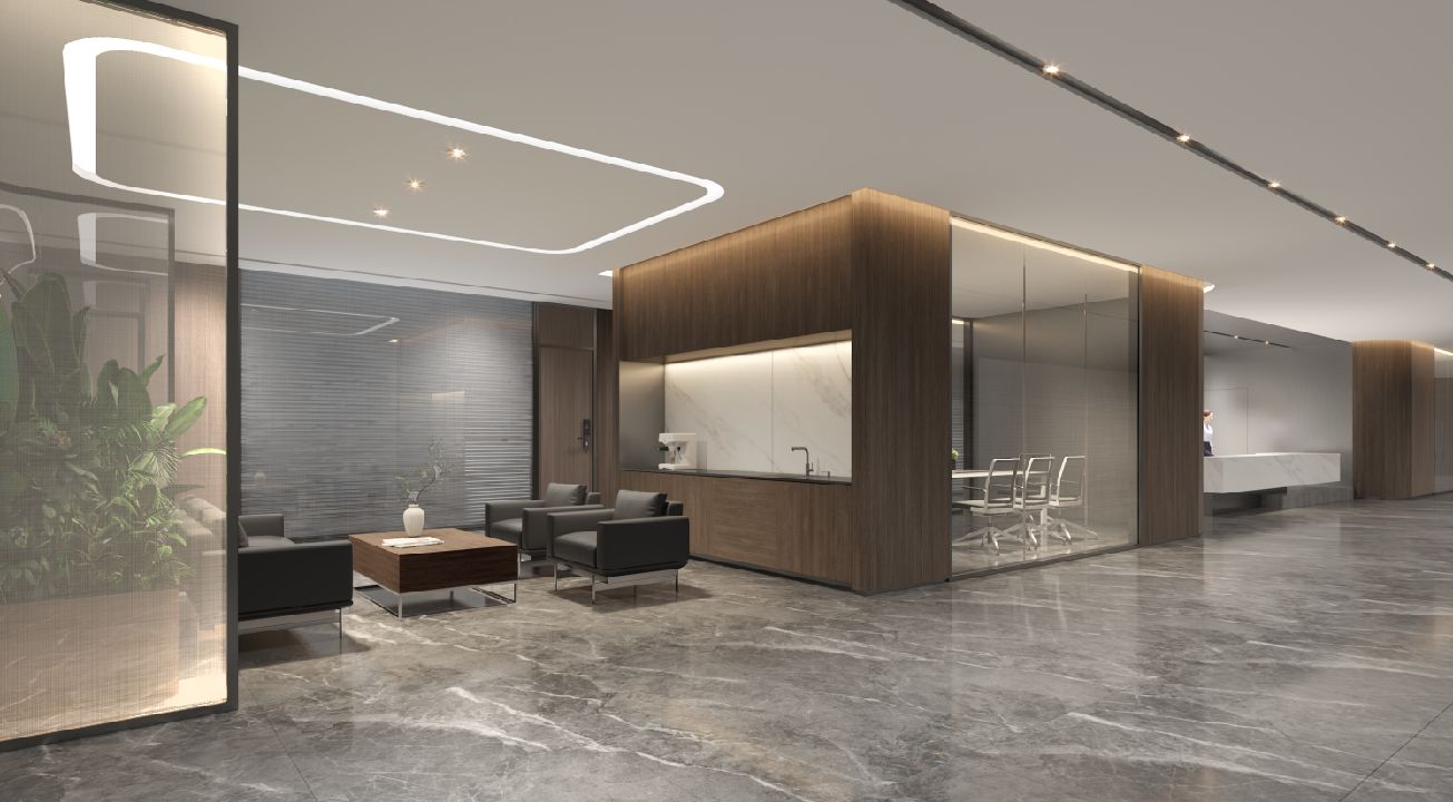 整体设计装修以现代风格为主,场地为长方盒子空间,把窗外自然光源尽可能引入到每一个办公位,综合环境和人文的需要,在呈现空间状态的设计中,利用重新建构框架的基础面形成的线条作展开,简约的造型和简洁的线条,营造既高效节能又平和松弛的办公环境。前台背景墙采用黑白调的石材搭配,错落有致,简洁时尚,地面用的是灰色印花阻燃地毯,通过窗外光影映射,与墙面相呼应,让空间更加丰富,有层次感,使其增添了几分活力。董事长办公室同样以灰白为基调,加入暖黄见光不见灯的无轨灯槽强化空间质感,与木色家具搭配的同时,利用简洁几何线条,将自然、简约与艺术融合,化繁为简,返璞归真,使整个空间温馨而高雅。眺望窗外一线江景,将宏伟蓝图尽收眼底,让你在工作之余,欣赏到城市的繁华美景。