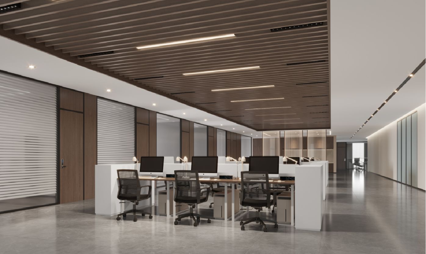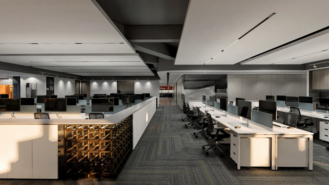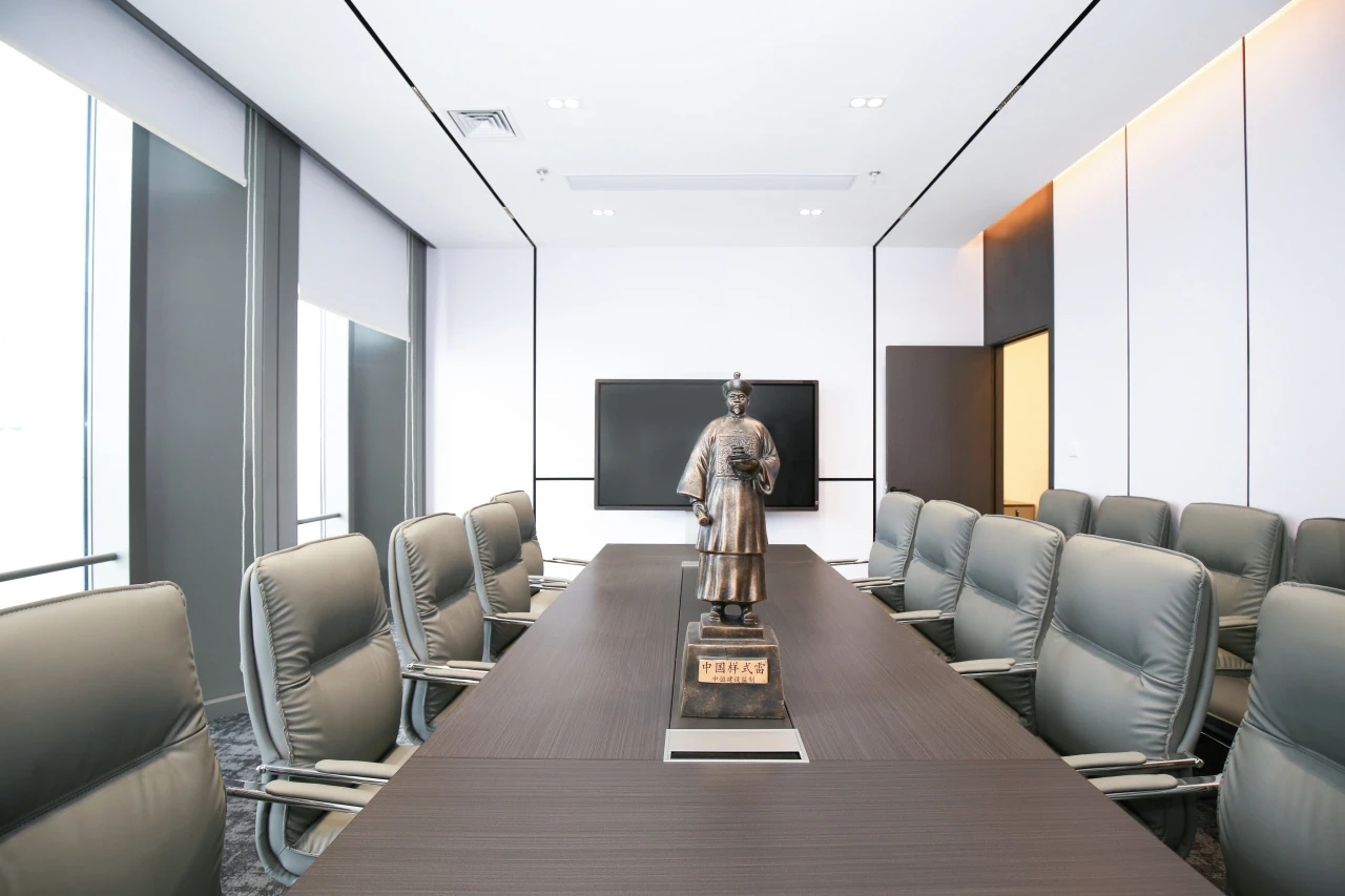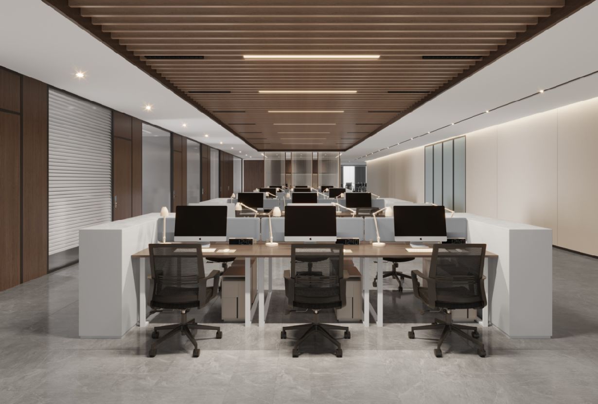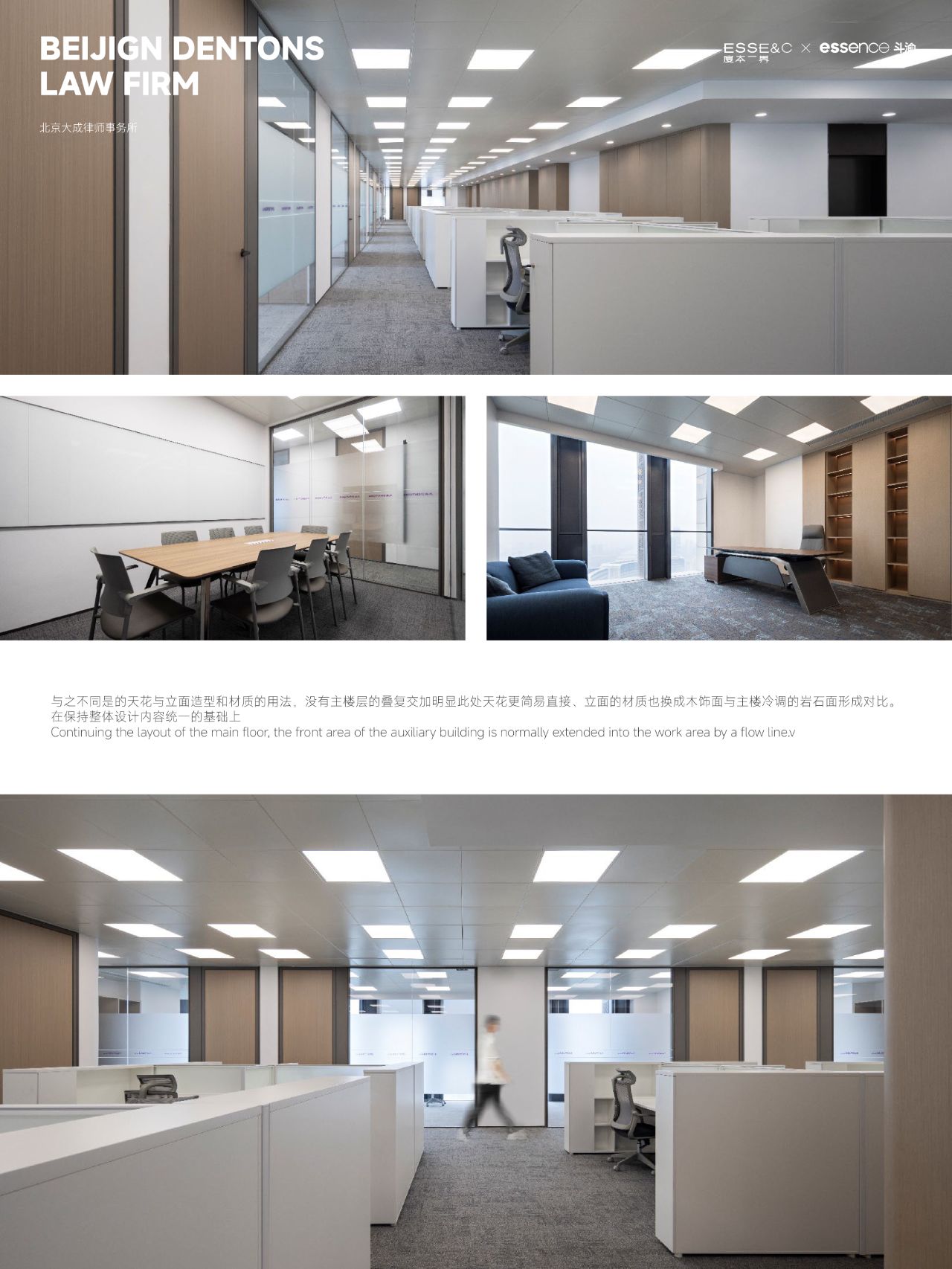 整体设计装修以现代风格为主,场地为长方盒子空间,把窗外自然光源尽可能引入到每一个办公位,综合环境和人文的需要,在呈现空间状态的设计中,利用重新建构框架的基础面形成的线条作展开,简约的造型和简洁的线条,营造既高效节能又平和松弛的办公环境。前台背景墙采用黑白调的石材搭配,错落有致,简洁时尚,地面用的是灰色印花阻燃地毯,通过窗外光影映射,与墙面相呼应,让空间更加丰富,有层次感,使其增添了几分活力。董事长办公室同样以灰白为基调,加入暖黄见光不见灯的无轨灯槽强化空间质感,与木色家具搭配的同时,利用简洁几何线条,将自然、简约与艺术融合,化繁为简,返璞归真,使整个空间温馨而高雅。眺望窗外一线江景,将宏伟蓝图尽收眼底,让你在工作之余,欣赏到城市的繁华美景。