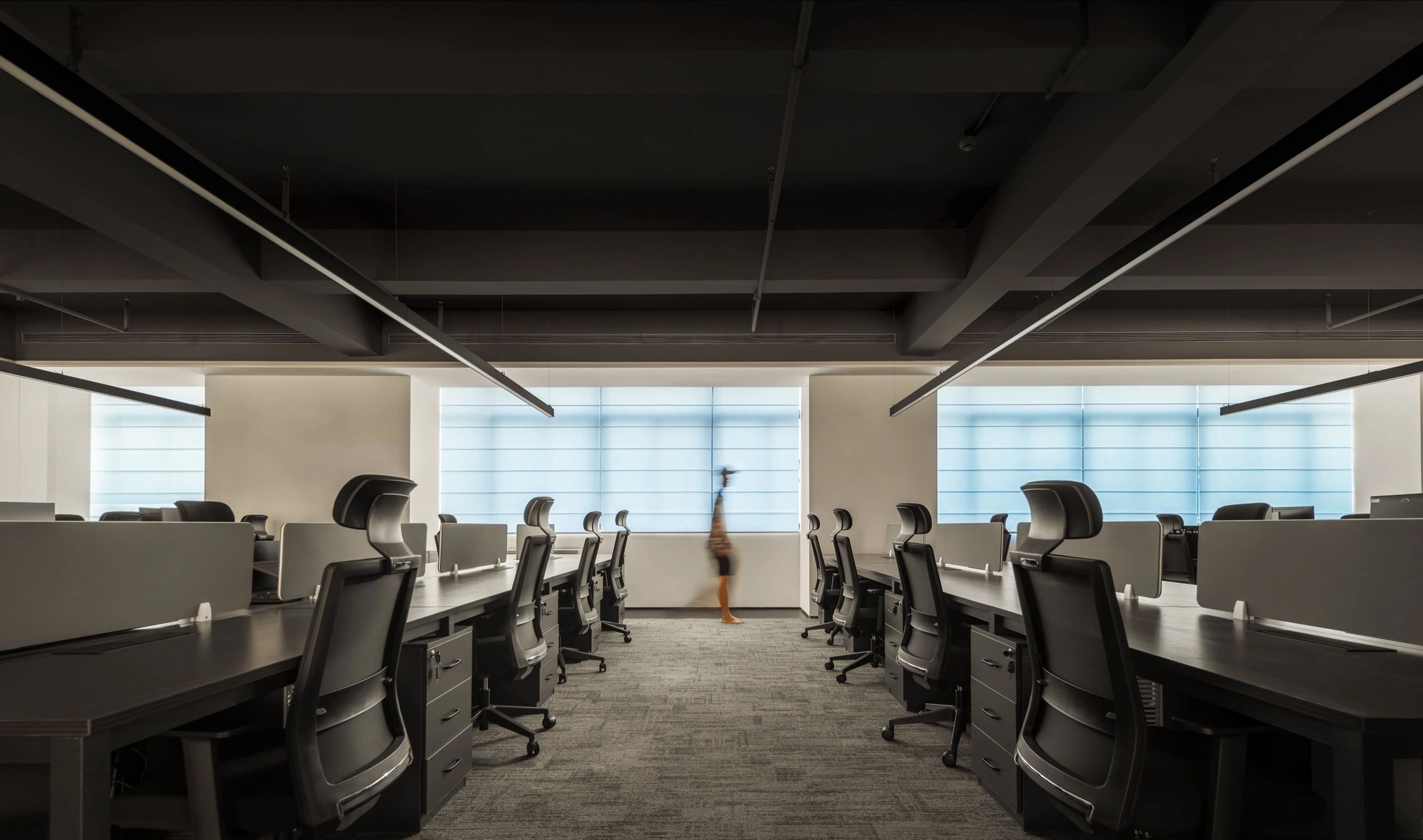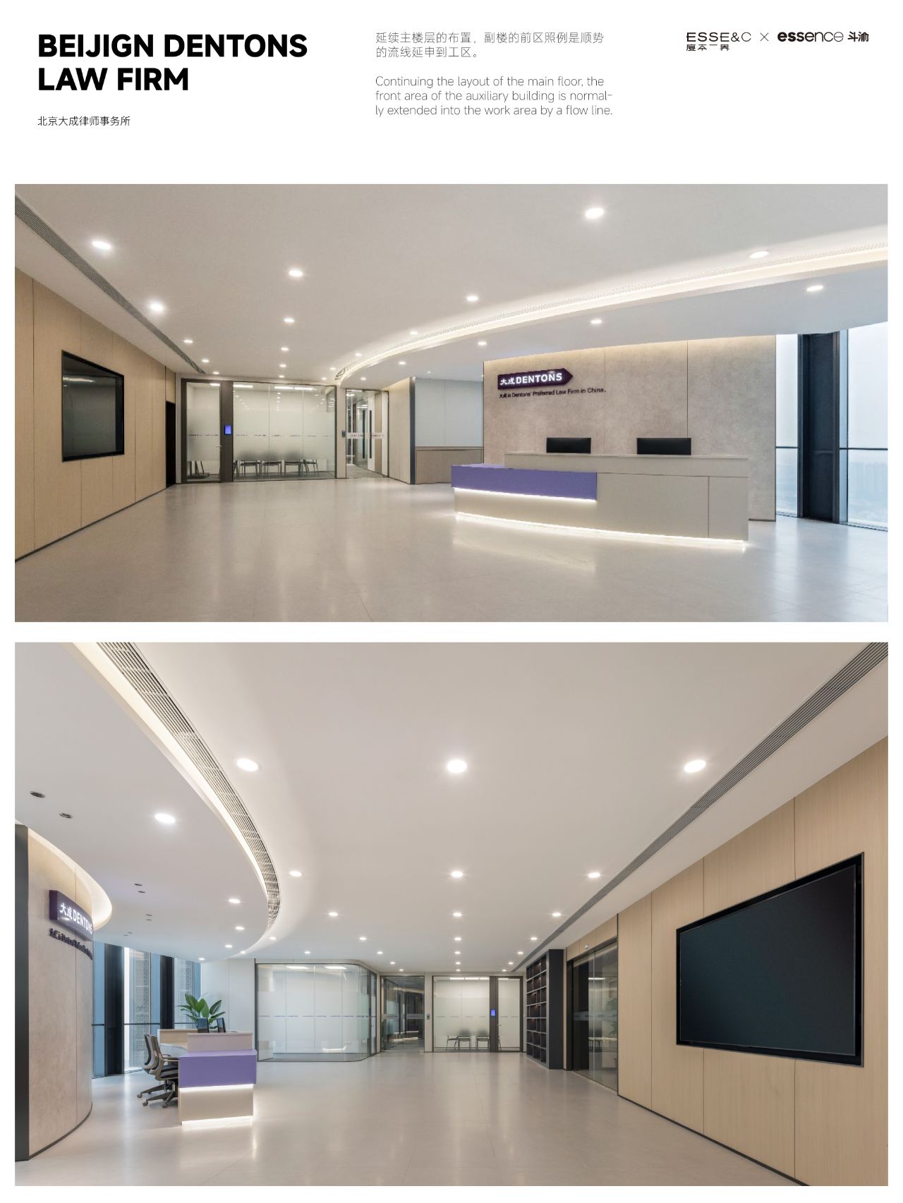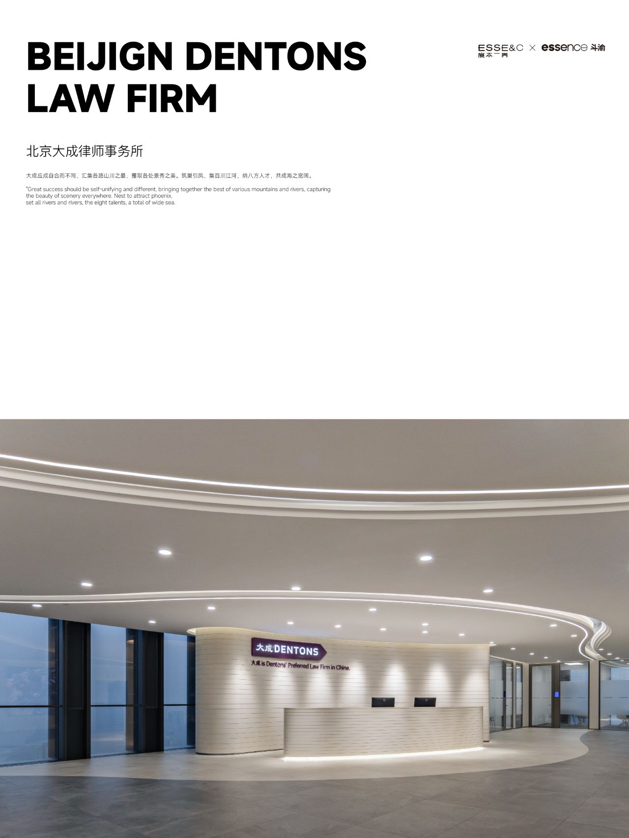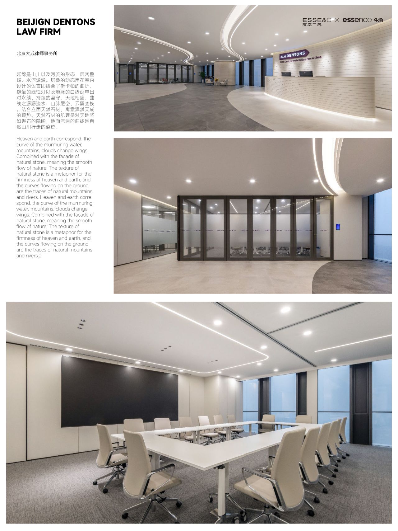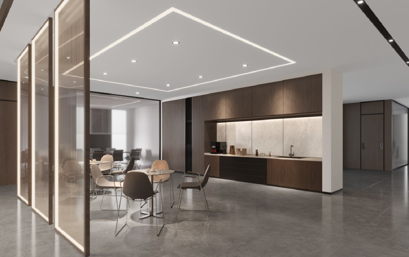 整体设计装修以现代风格为主,场地为长方盒子空间,把窗外自然光源尽可能引入到每一个办公位,综合环境和人文的需要,在呈现空间状态的设计中,利用重新建构框架的基础面形成的线条作展开,简约的造型和简洁的线条,营造既高效节能又平和松弛的办公环境。前台背景墙采用黑白调的石材搭配,错落有致,简洁时尚,地面用的是灰色印花阻燃地毯,通过窗外光影映射,与墙面相呼应,让空间更加丰富,有层次感,使其增添了几分活力。董事长办公室同样以灰白为基调,加入暖黄见光不见灯的无轨灯槽强化空间质感,与木色家具搭配的同时,利用简洁几何线条,将自然、简约与艺术融合,化繁为简,返璞归真,使整个空间温馨而高雅。眺望窗外一线江景,将宏伟蓝图尽收眼底,让你在工作之余,欣赏到城市的繁华美景。