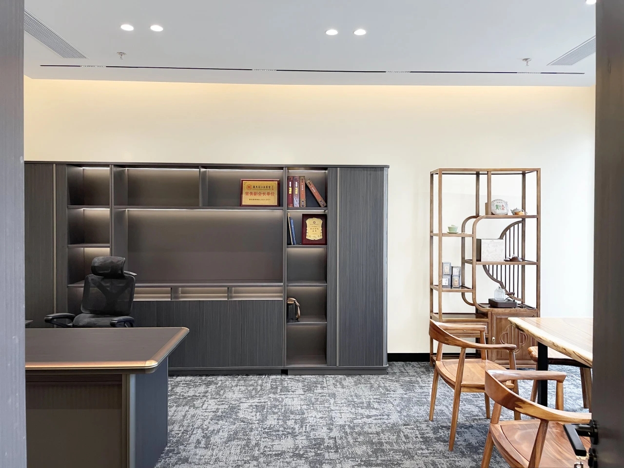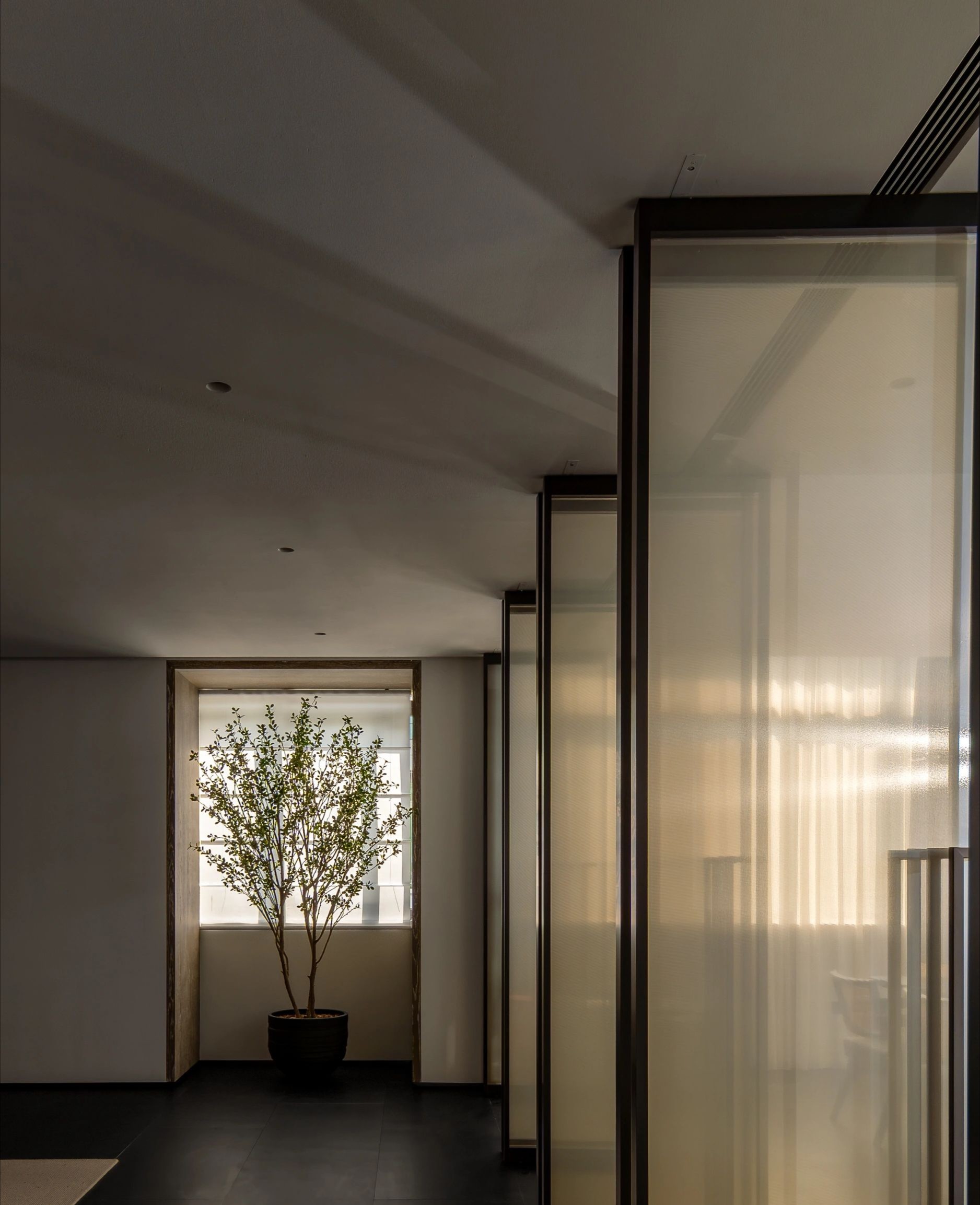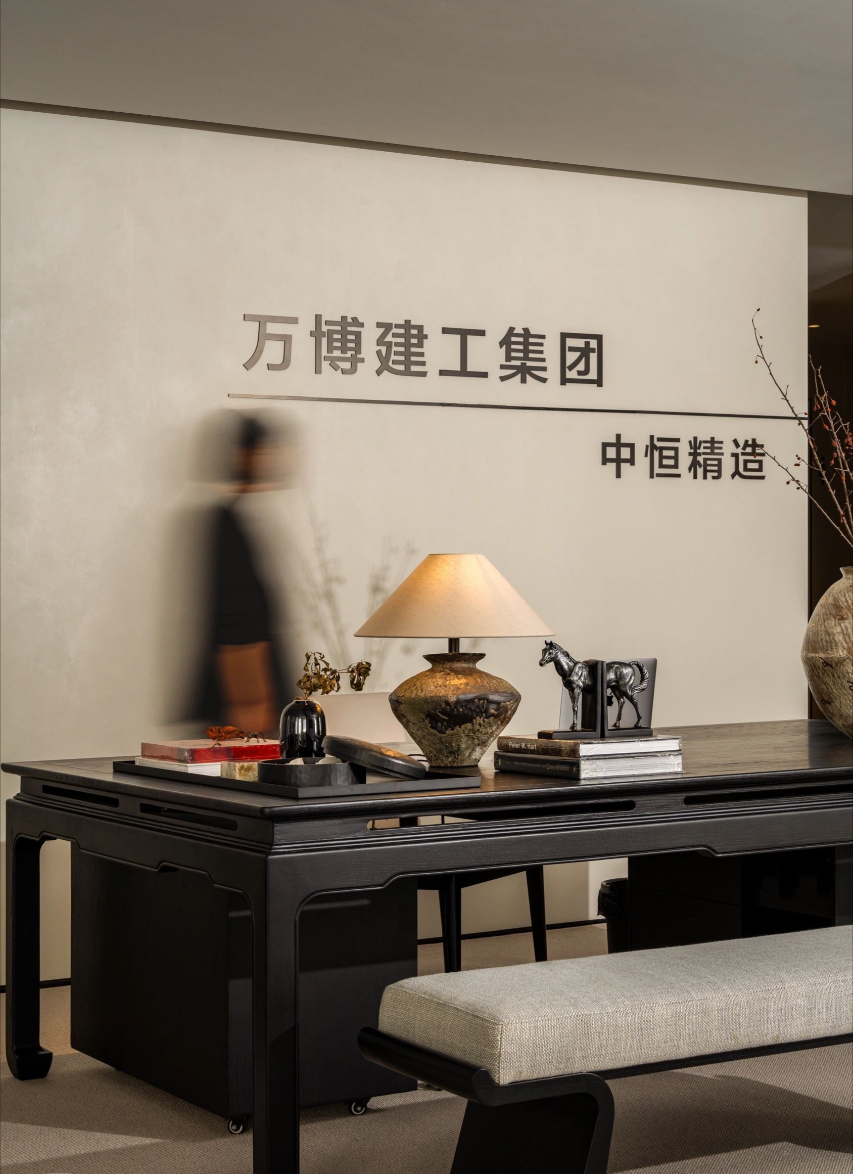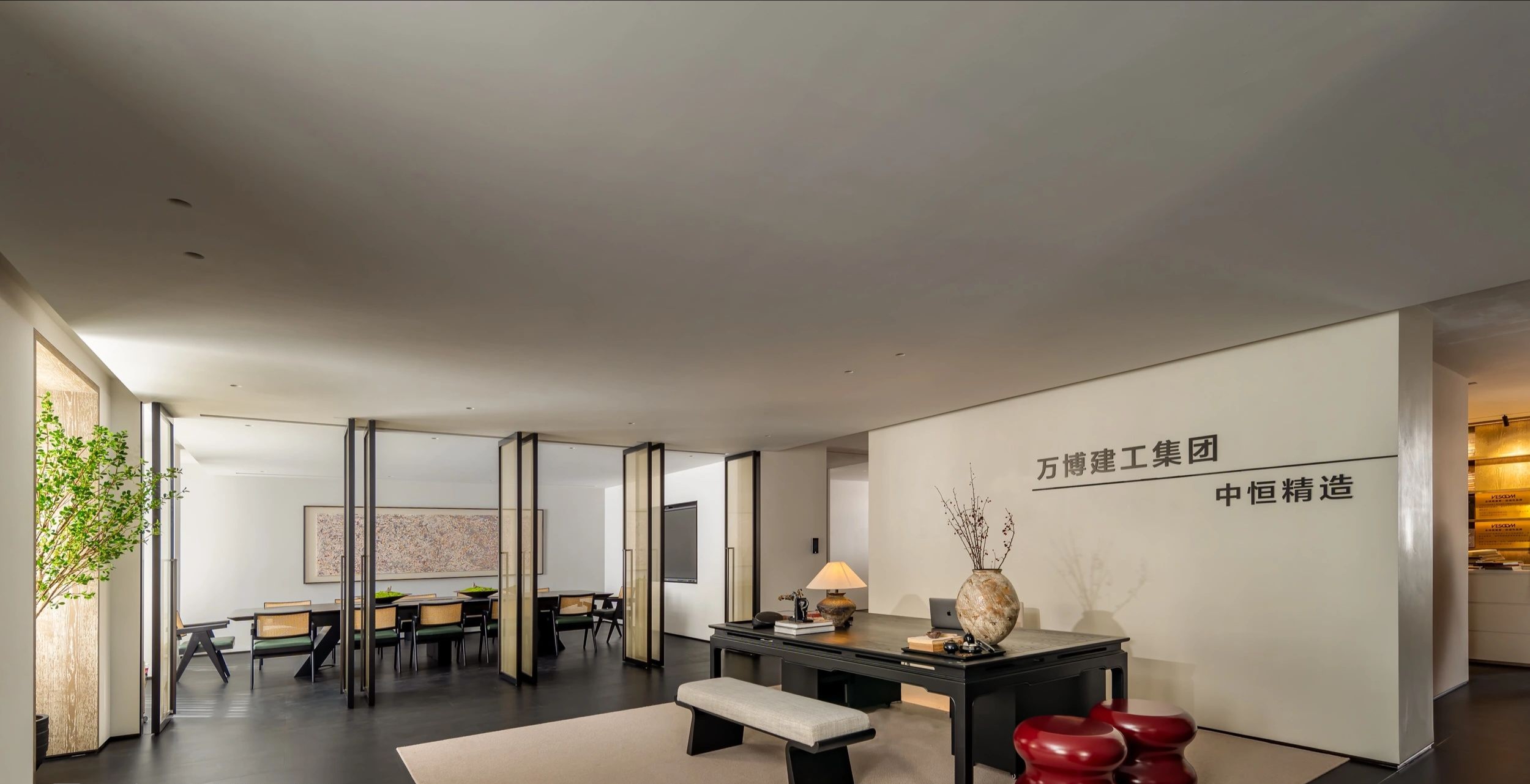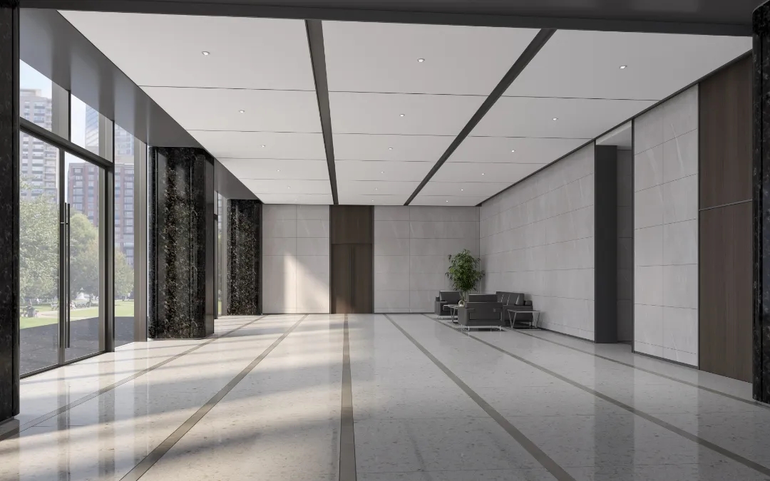 整体设计装修以现代风格为主,场地为长方盒子空间,把窗外自然光源尽可能引入到每一个办公位,综合环境和人文的需要,在呈现空间状态的设计中,利用重新建构框架的基础面形成的线条作展开,简约的造型和简洁的线条,营造既高效节能又平和松弛的办公环境。前台背景墙采用黑白调的石材搭配,错落有致,简洁时尚,地面用的是灰色印花阻燃地毯,通过窗外光影映射,与墙面相呼应,让空间更加丰富,有层次感,使其增添了几分活力。董事长办公室同样以灰白为基调,加入暖黄见光不见灯的无轨灯槽强化空间质感,与木色家具搭配的同时,利用简洁几何线条,将自然、简约与艺术融合,化繁为简,返璞归真,使整个空间温馨而高雅。眺望窗外一线江景,将宏伟蓝图尽收眼底,让你在工作之余,欣赏到城市的繁华美景。